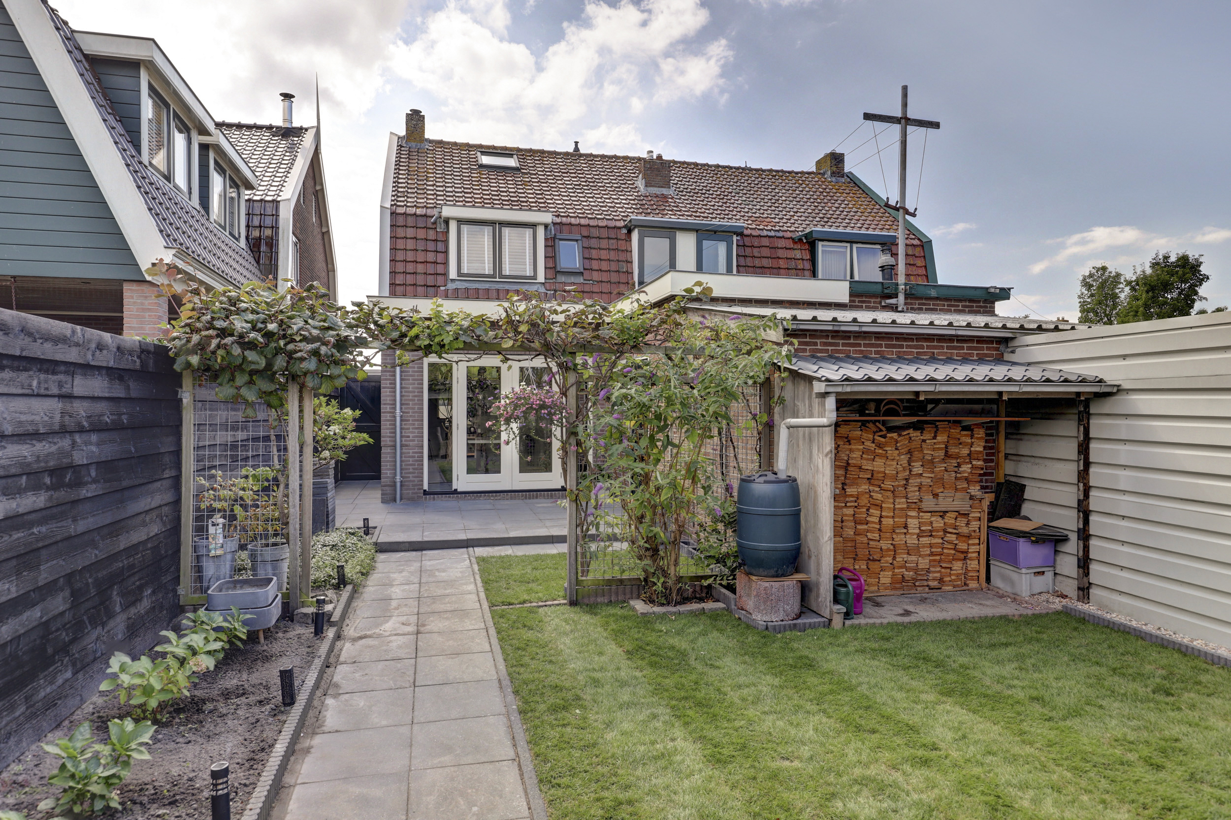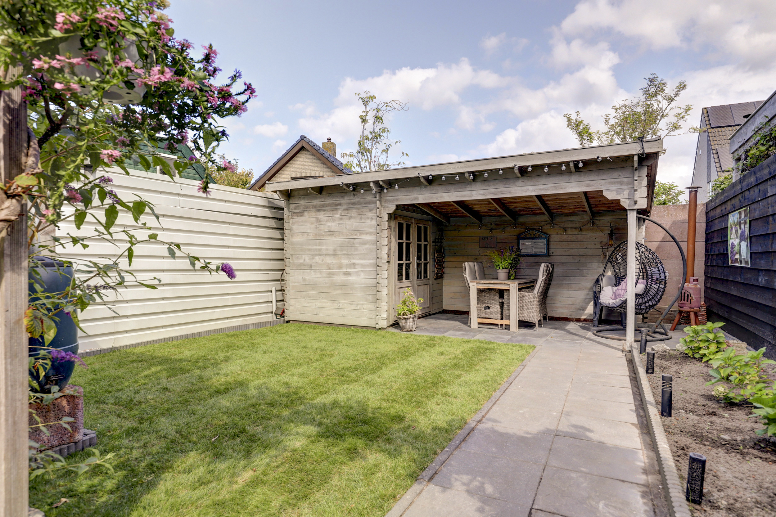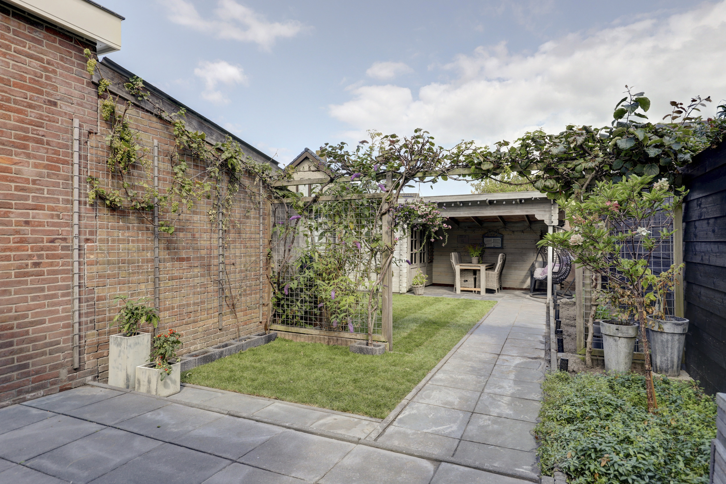 De voortuin is netjes aangelegd en biedt een charmante entree tot de woning. De achtertuin is een echte verrassing. Via de openslaande deuren komt u op een royaal terras dat doorloopt naar het gazon, borders met beplanting en een veranda. Dit is de ideale plek om lange zomeravonden door te brengen of juist beschut te genieten in het voor- en najaar. Ook is er een houten berging aanwezig voor fietsen en tuingereedschap.