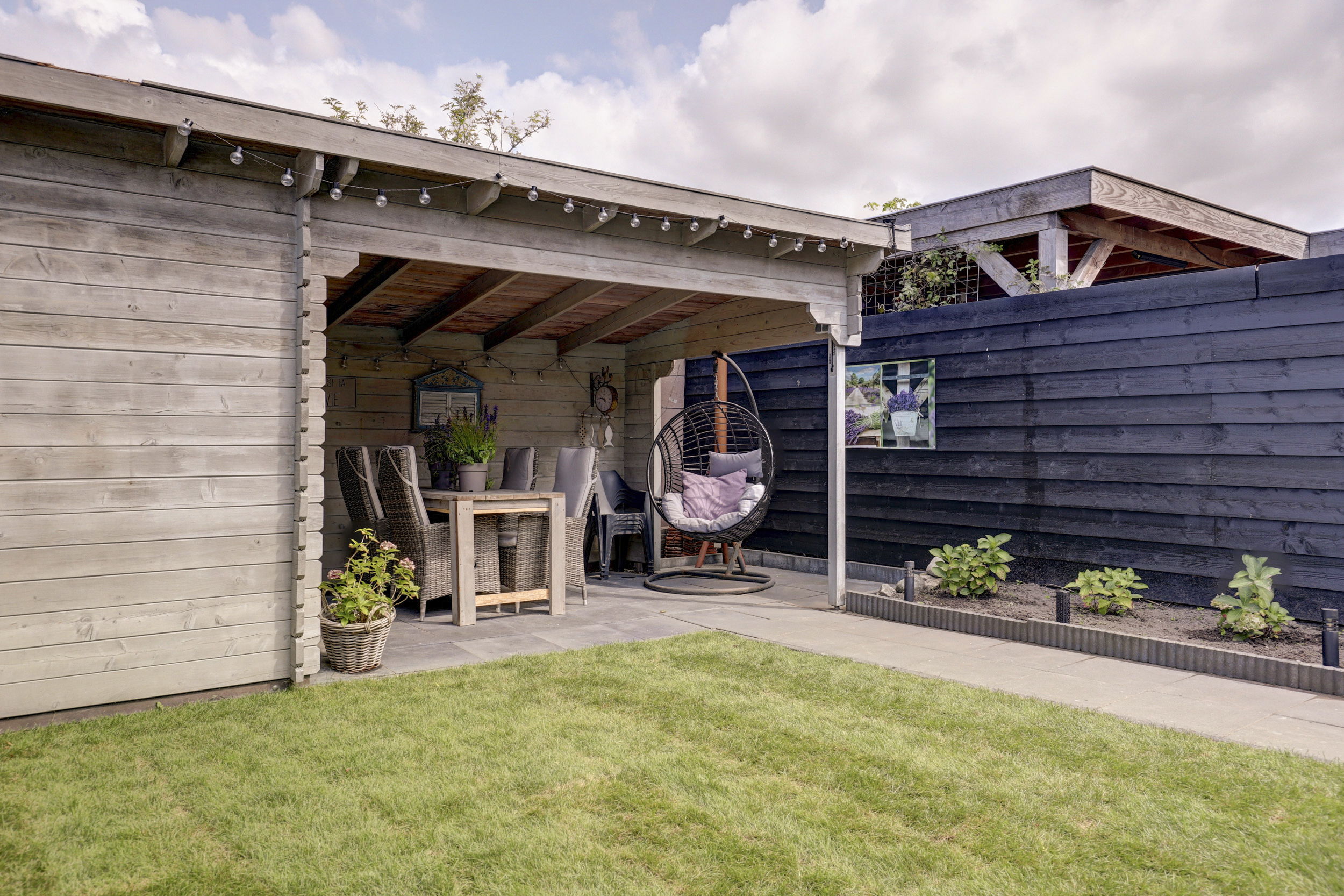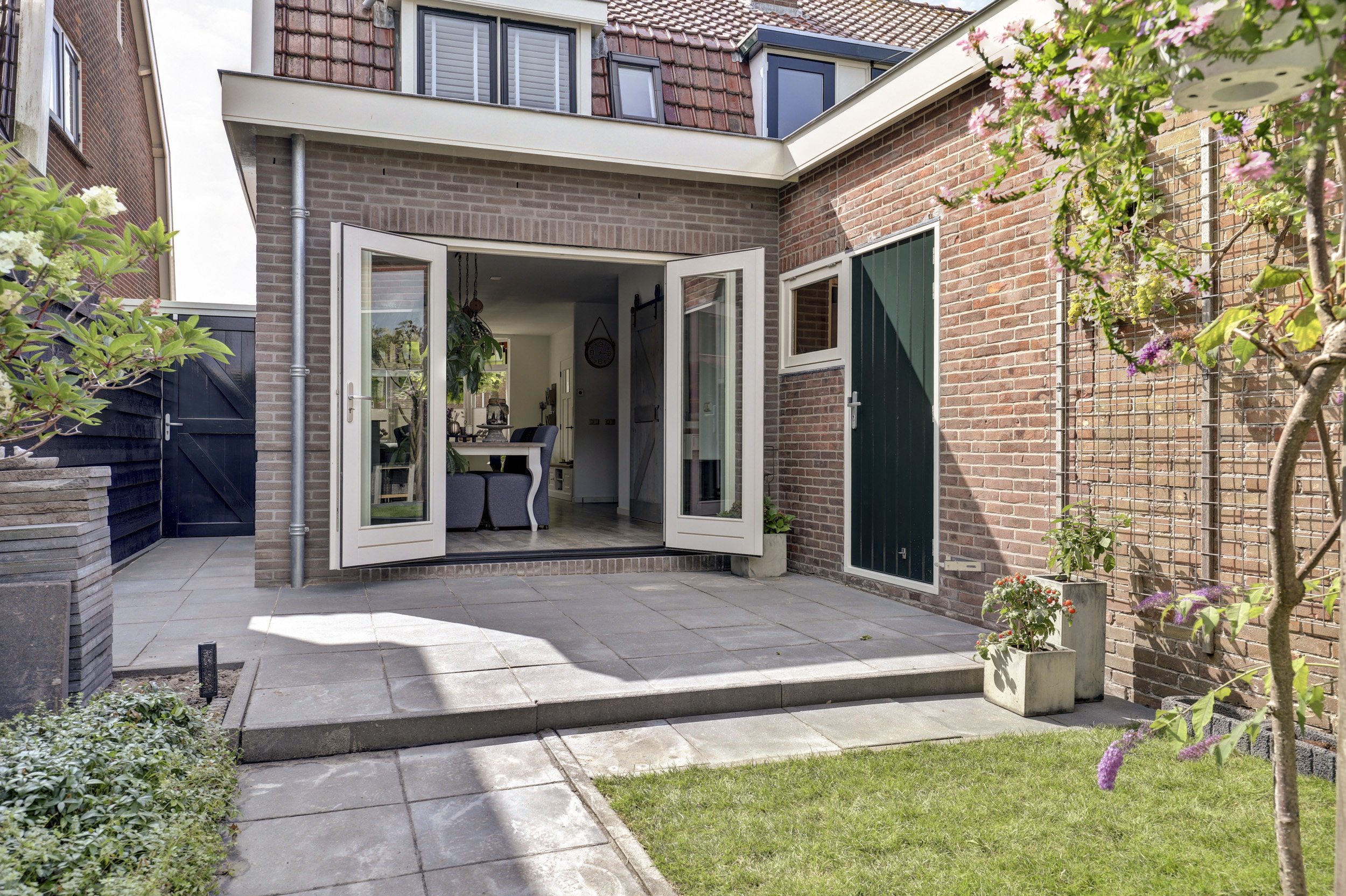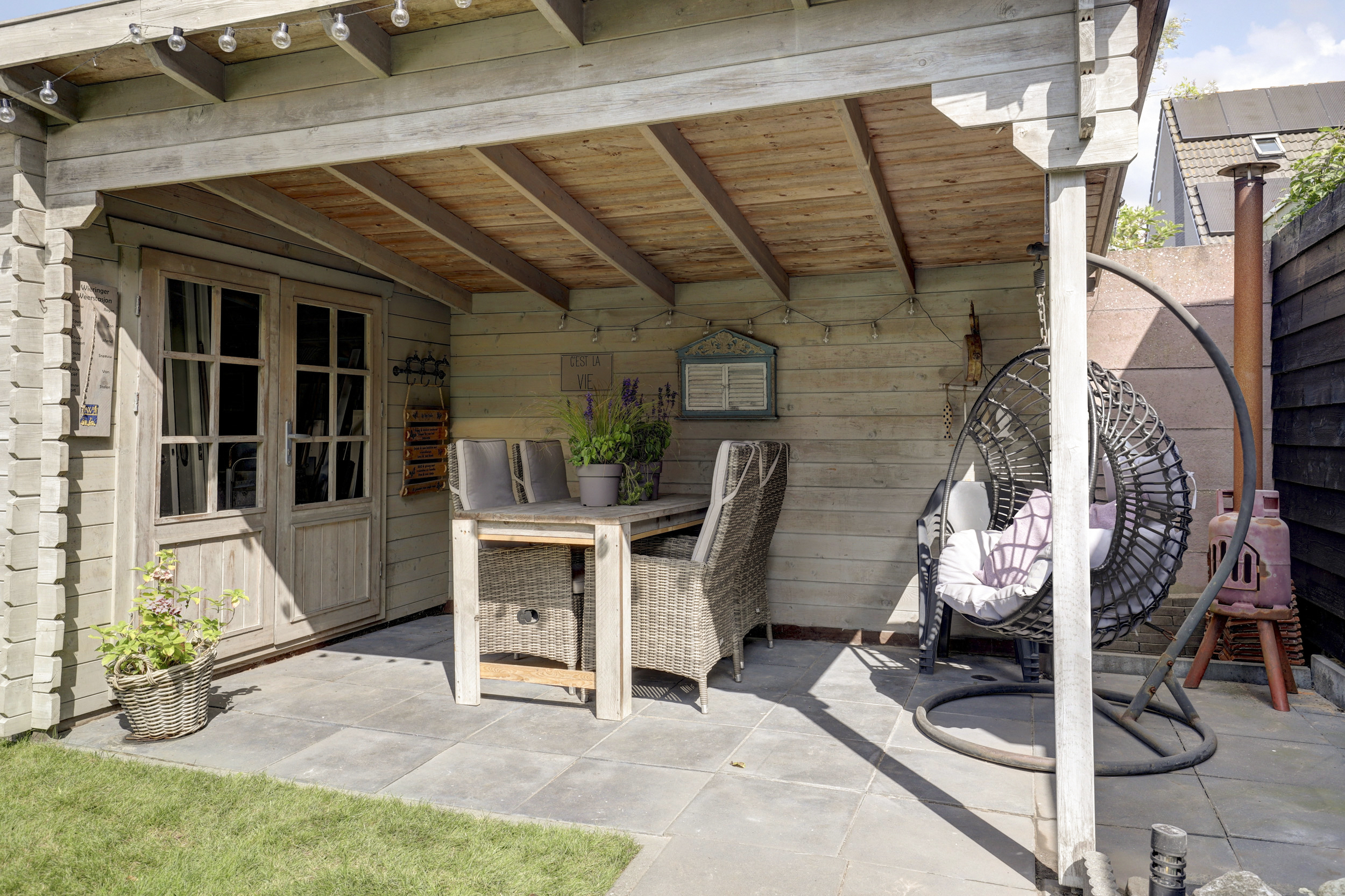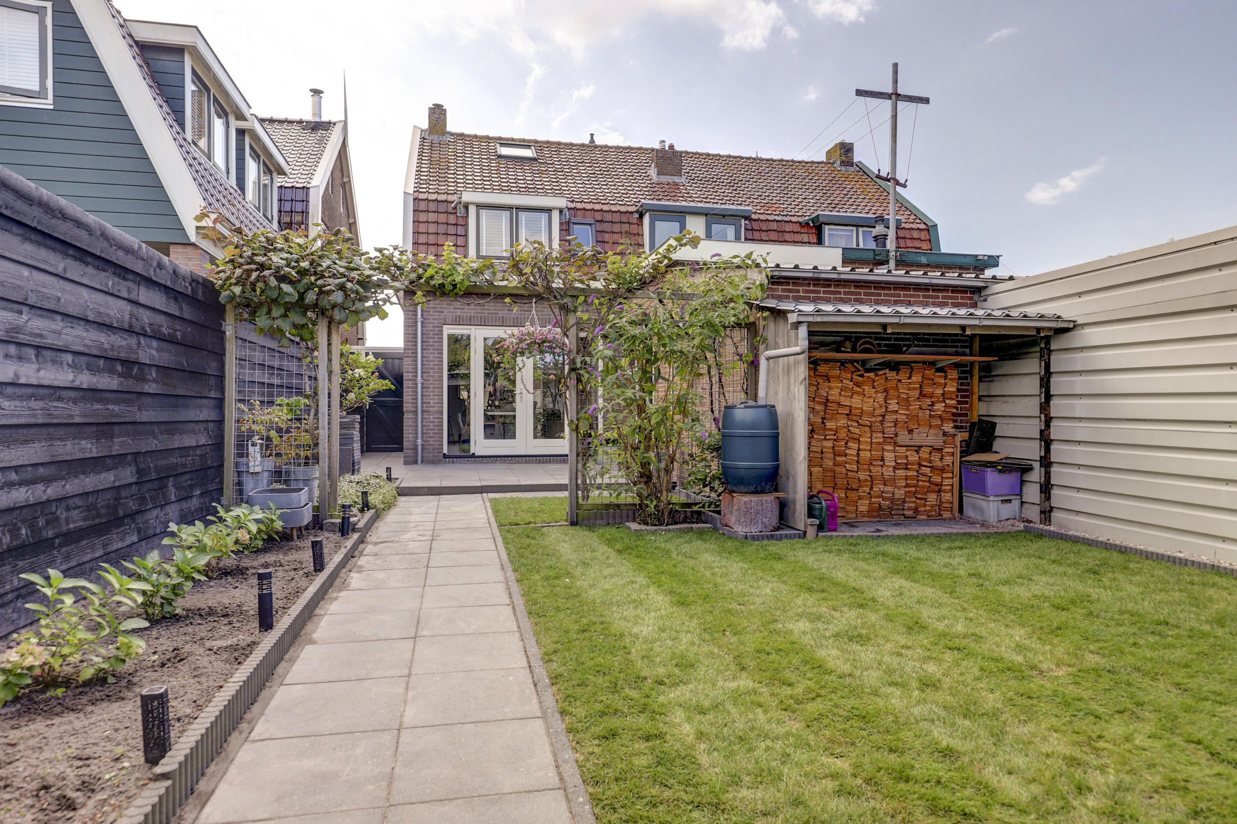 De voortuin is netjes aangelegd en biedt een charmante entree tot de woning. De achtertuin is een echte verrassing. Via de openslaande deuren komt u op een royaal terras dat doorloopt naar het gazon, borders met beplanting en een veranda. Dit is de ideale plek om lange zomeravonden door te brengen of juist beschut te genieten in het voor- en najaar. Ook is er een houten berging aanwezig voor fietsen en tuingereedschap.