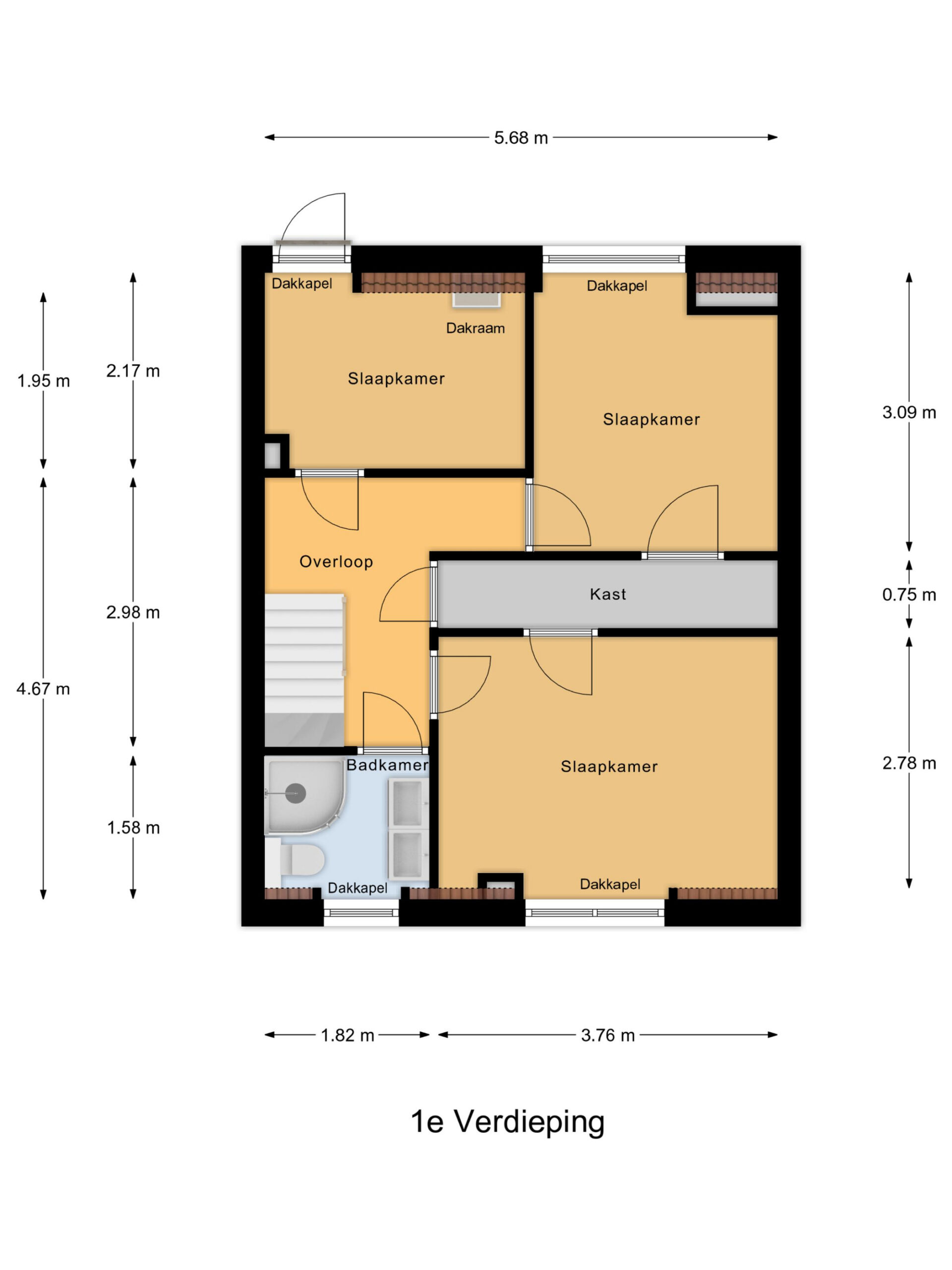 Op de eerste verdieping bevinden zich drie slaapkamers, alle netjes afgewerkt met behang, radiatoren en laminaatvloer De moderne badkamer(2025) is volledig betegeld en voorzien van een douchecabine, wastafelmeubel en toilet. Hier is gekozen voor lichte tegels en een strakke afwerking, wat zorgt voor een frisse en luxe uitstraling.