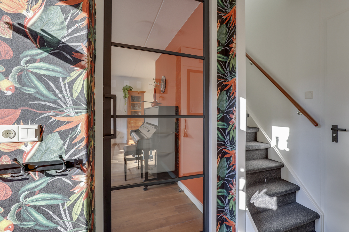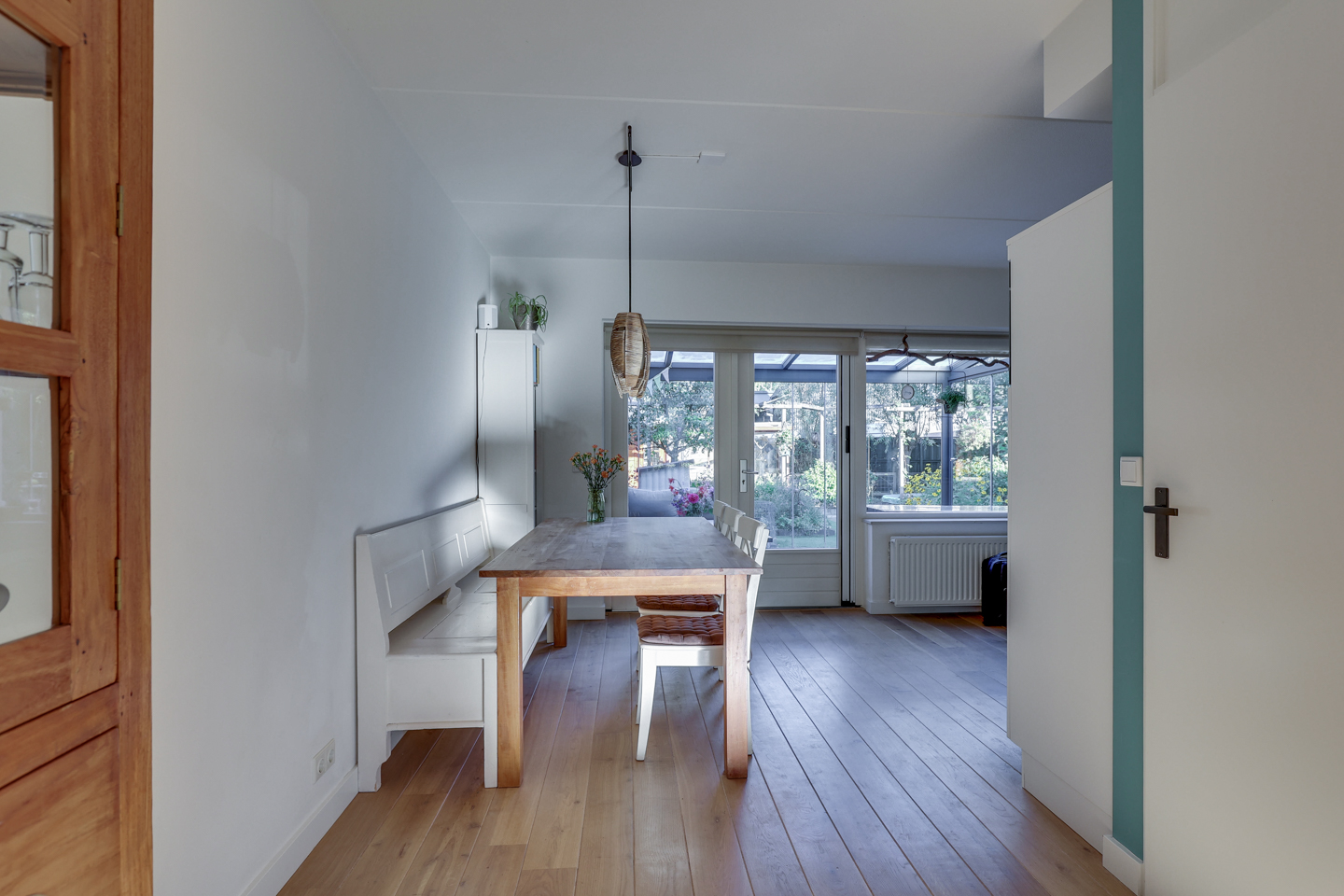 Je komt binnen via de ruime voortuin met oprit en stapt binnen in de hal met toilet en meterkast. De lichte, straatgerichte L-vormige woonkamer is voorzien van een warme houten vloer en handige trapkast. Aan de achterzijde vind je de open keuken (2017) met diverse inbouwapparatuur, waaronder een Quooker, en openslaande deuren naar de tuinkamer. Deze tuinkamer is voorzien van glazen schuifdeuren en verlengt het woongenot het hele jaar door. Vanuit de praktische bijkeuken (met aansluitingen voor wasmachine en droger) is de inpandige garage bereikbaar.
