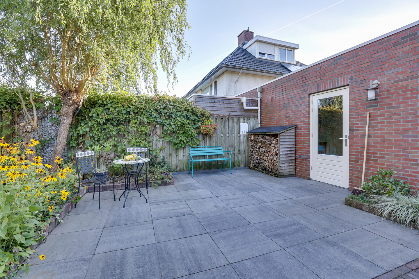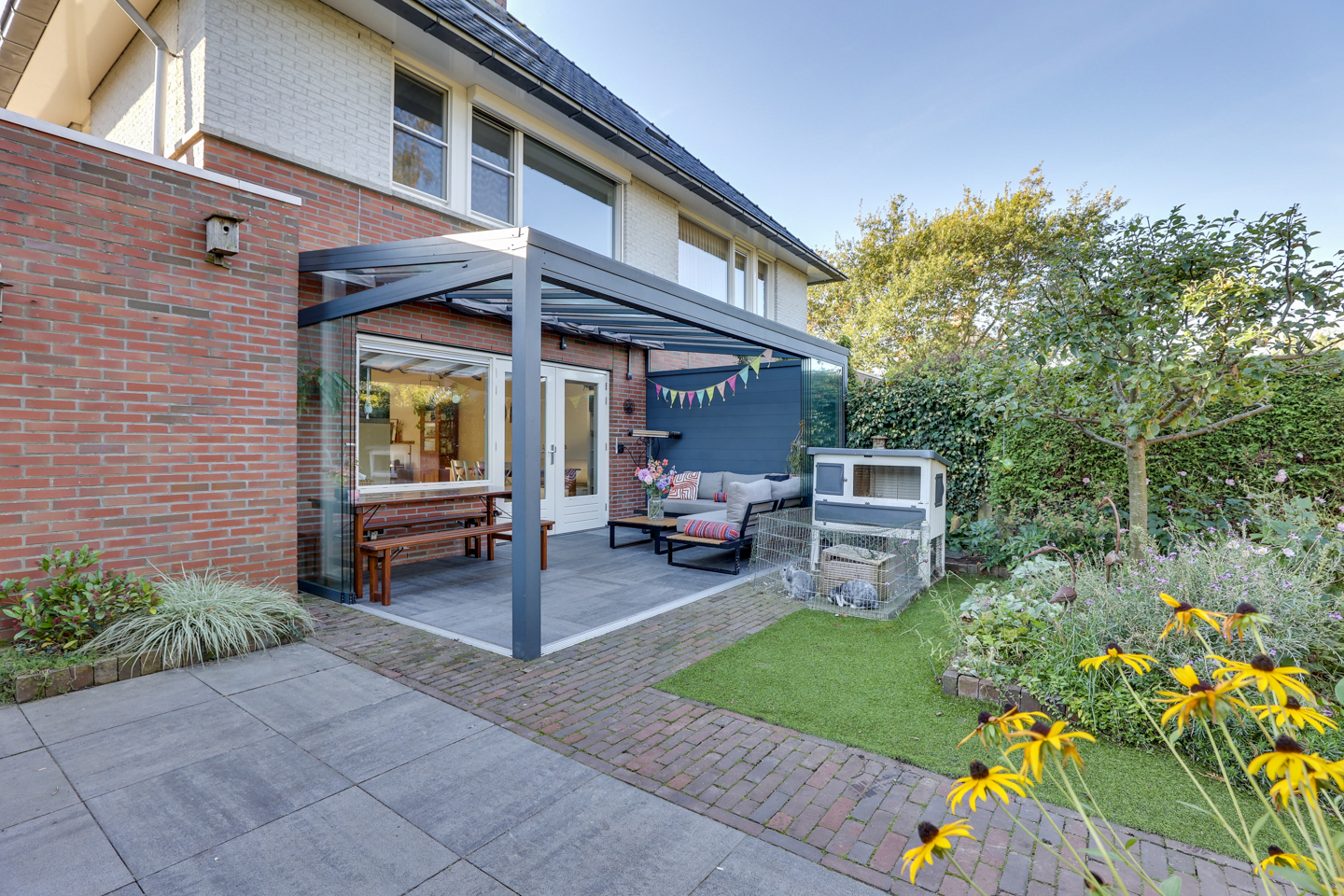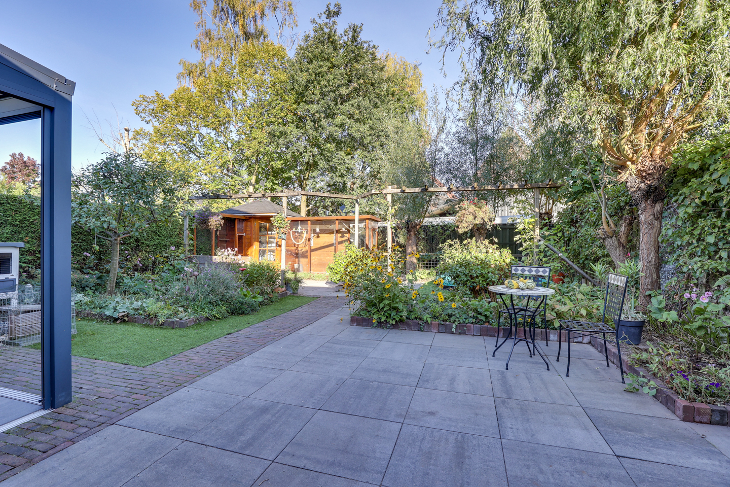 De achtertuin is gelegen op het noordwesten en biedt tot in de avond zon – ideaal voor een ontspannen einde van de dag.