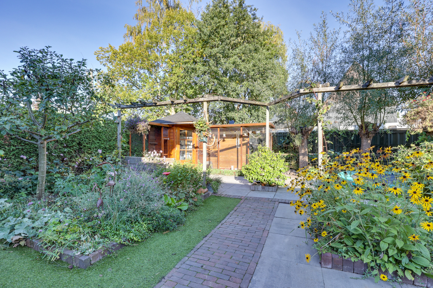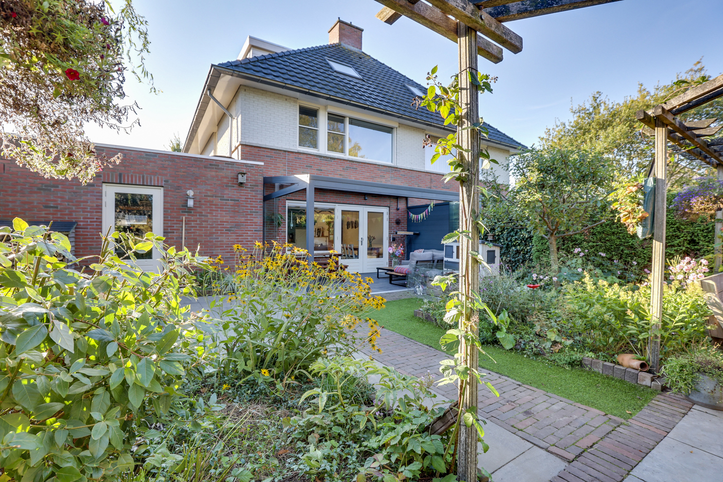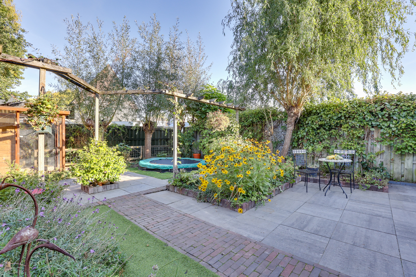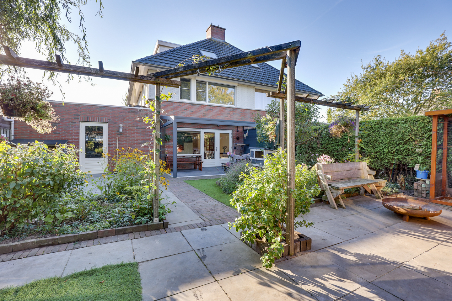 De achtertuin is gelegen op het noordwesten en biedt tot in de avond zon – ideaal voor een ontspannen einde van de dag.