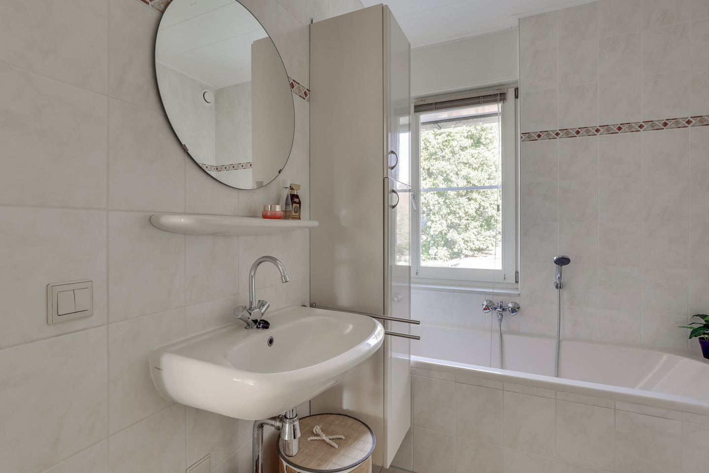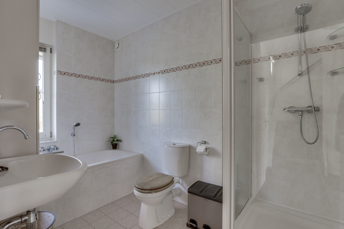 Overloop met bergruimte onder de trap, 3 ruime slaapkamers (voorzien van horren; één met rolluik) en een verzorgde badkamer met inloopdouche, toilet, wastafel en betegeling tot aan het plafond.