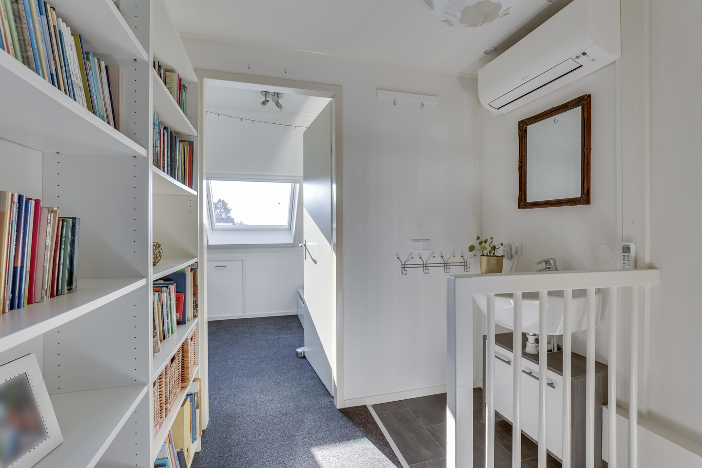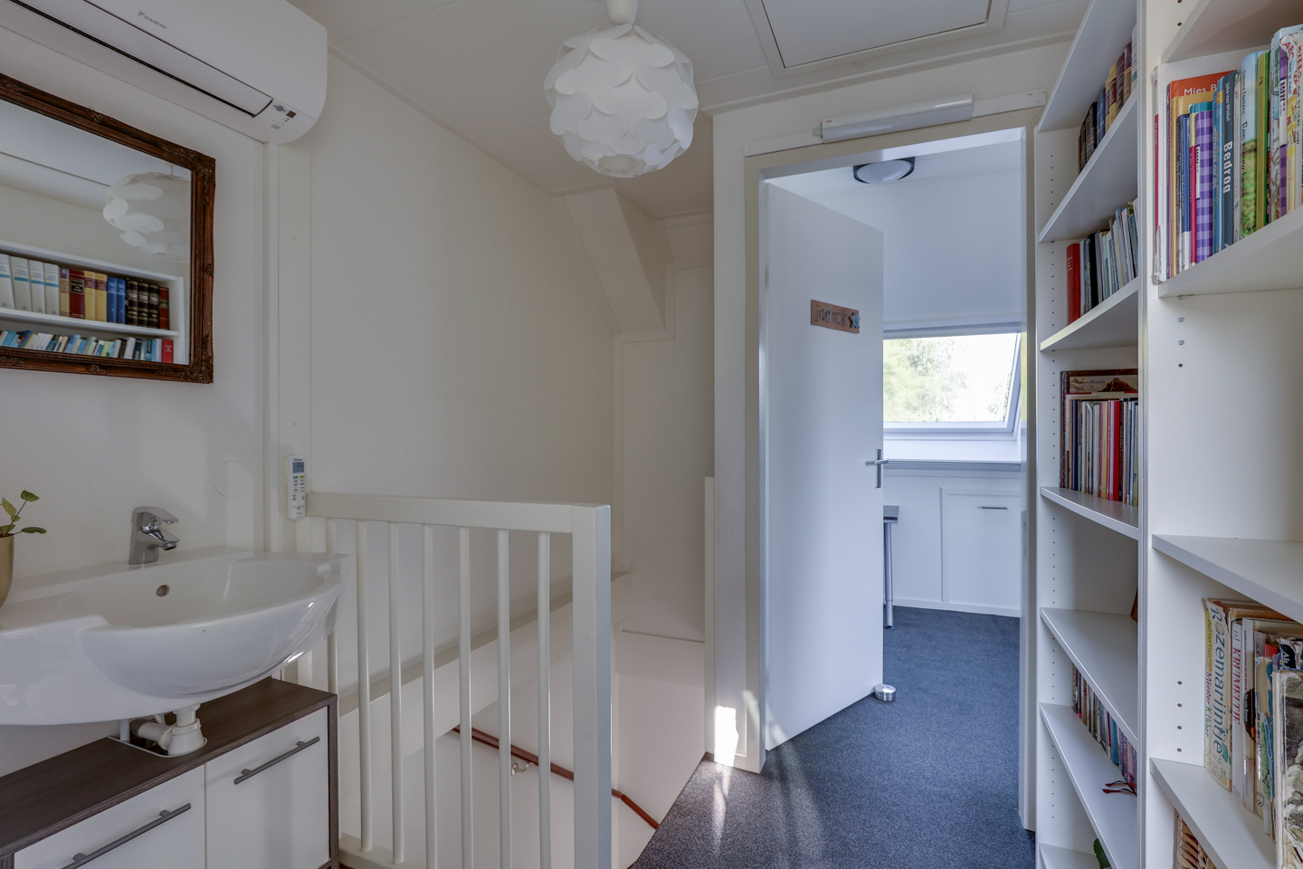 Ruime overloop met wastafel en nieuwe airconditioning (2025) voor verwarmen én koelen. Hier bevinden zich nog twee slaapkamers met dakramen en een dakkapel, én handige bergruimte achter de knieschotten.