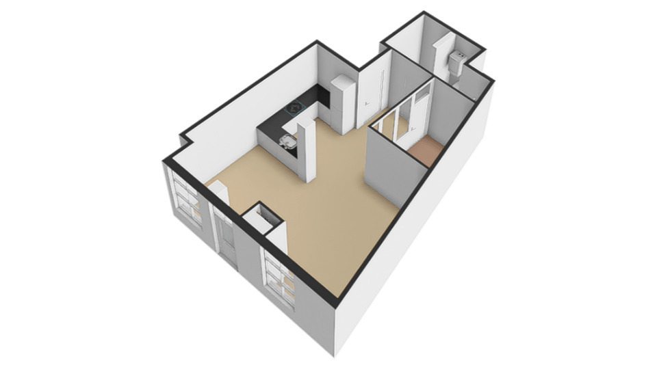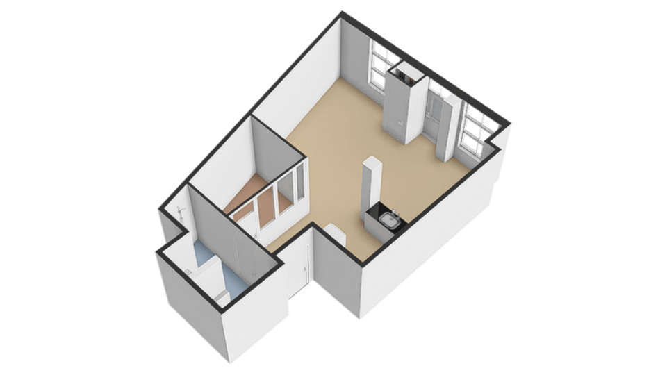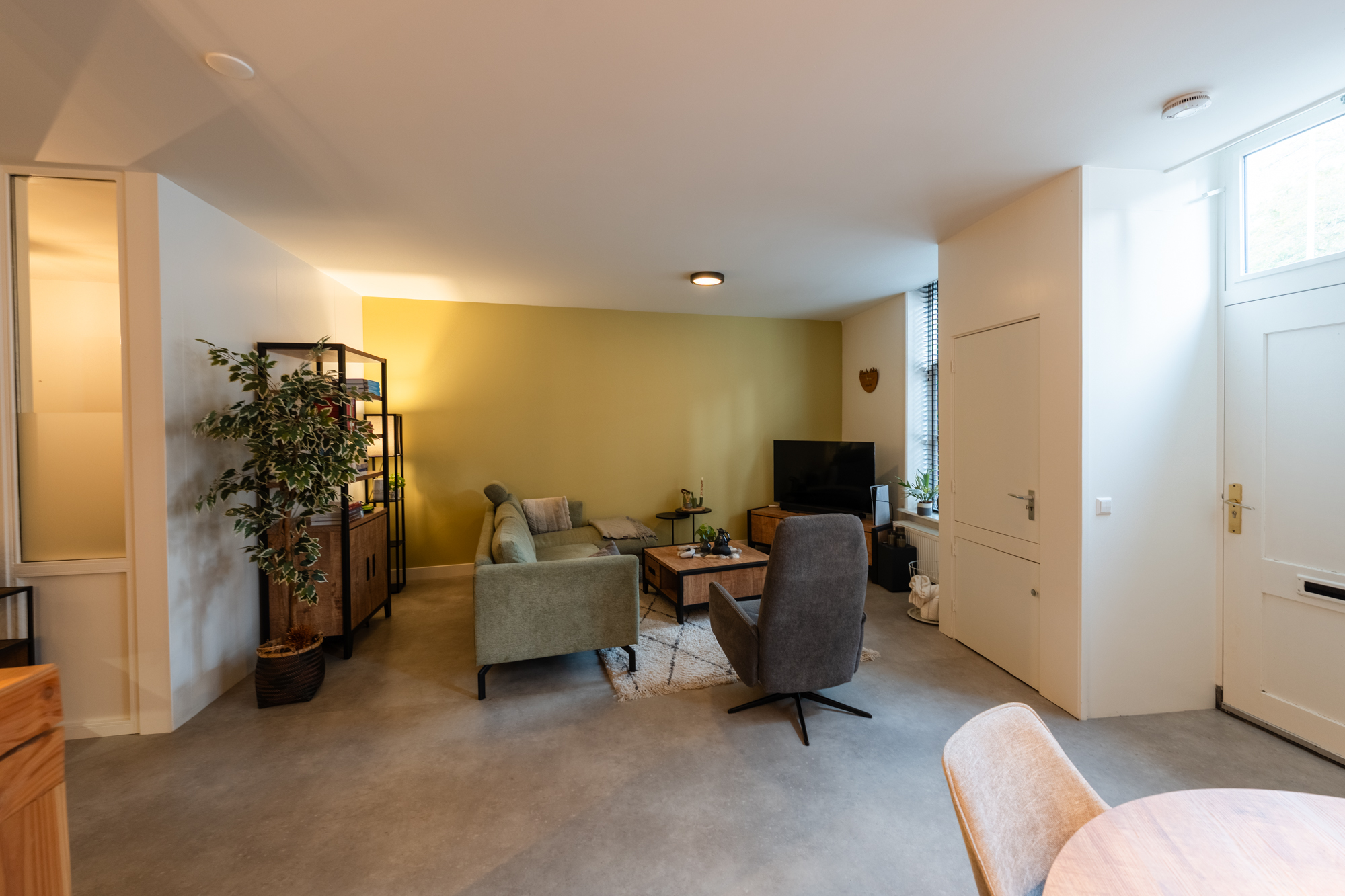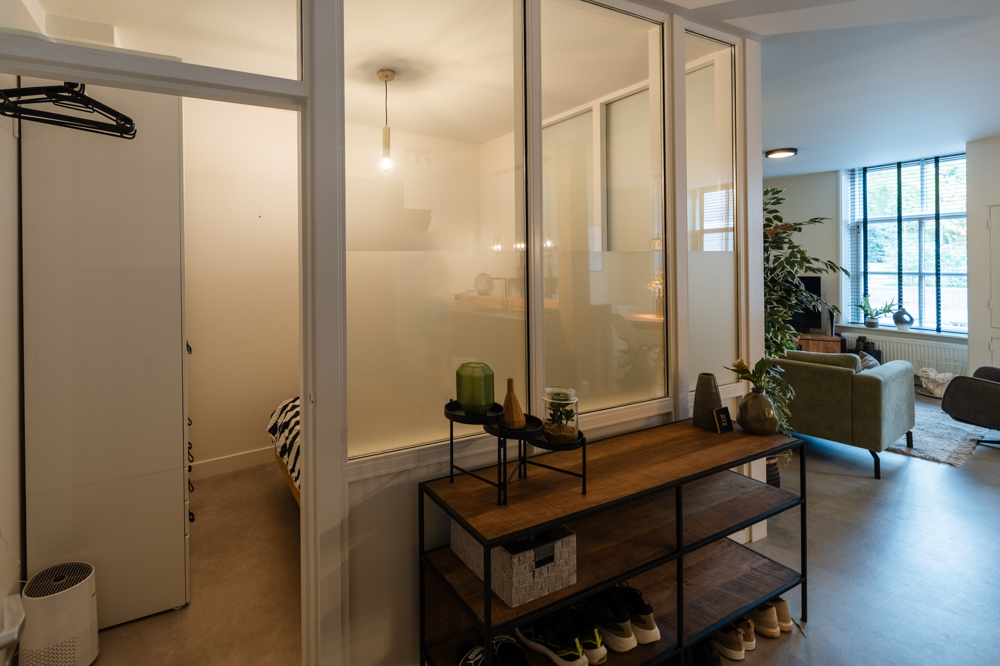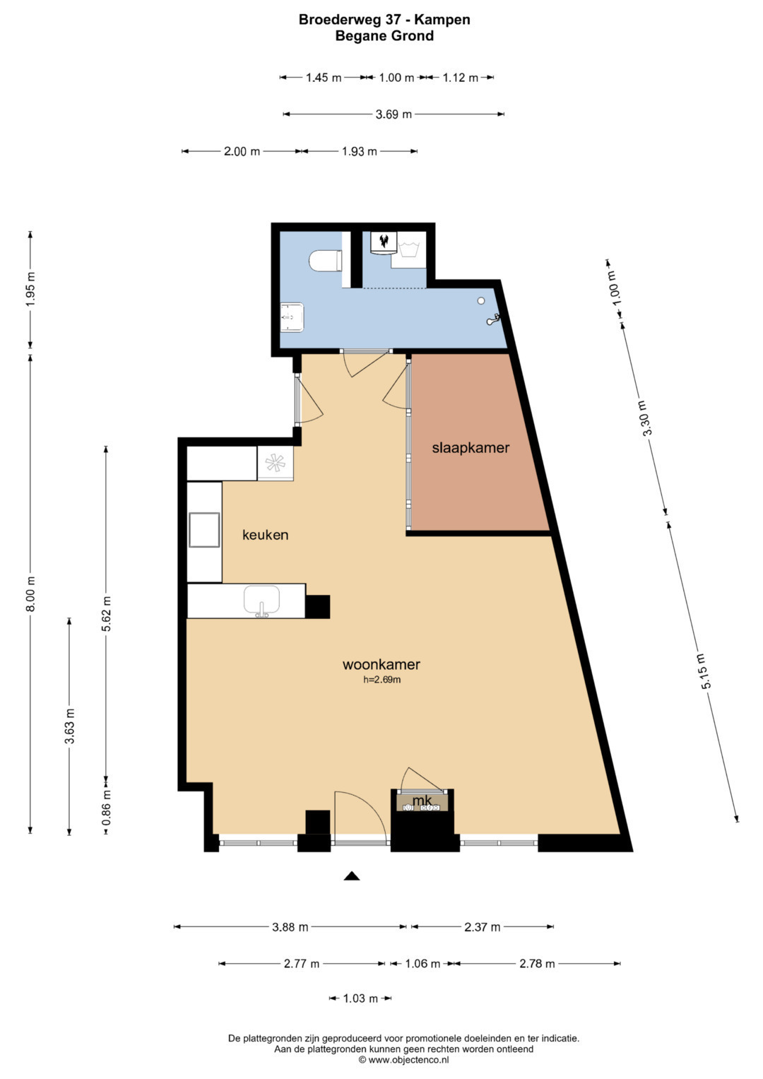Appartement begane grond: entree, deur naar de badkamer, straatgerichte woonkamer met open keuken, kamer om te slapen. Aan de achterzijde van het pand bevindt zich de gezamenlijke fietsenschuur.