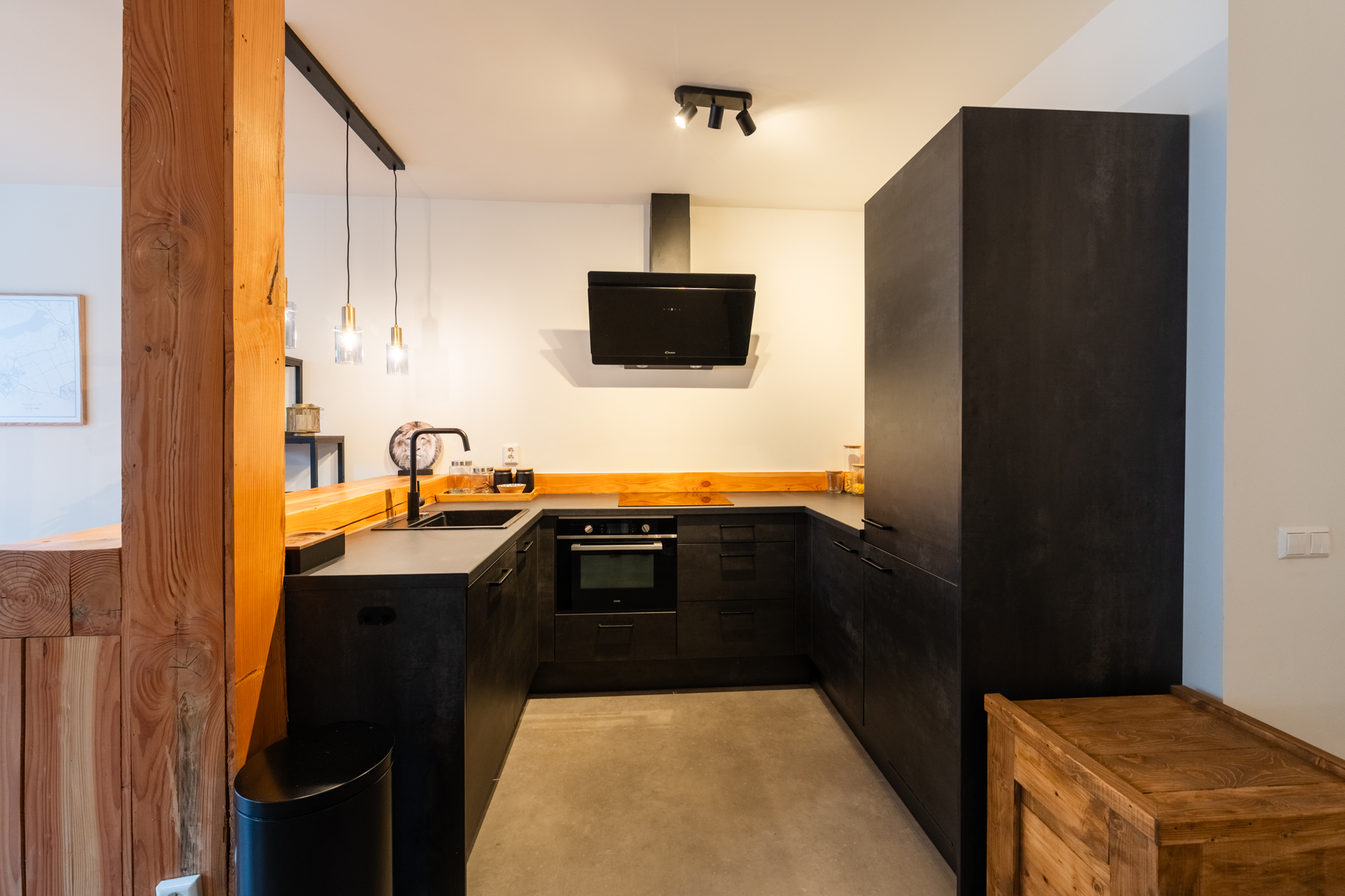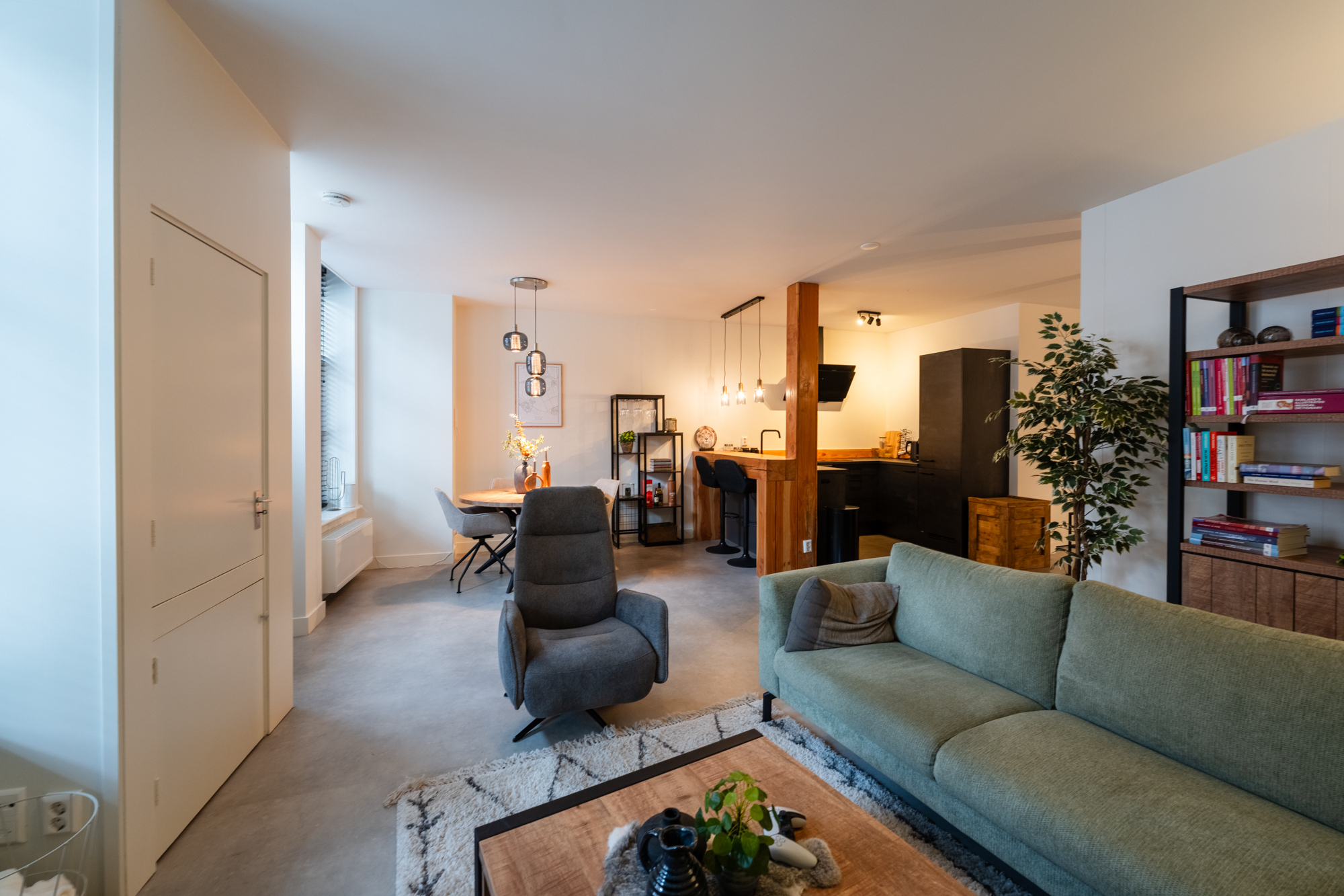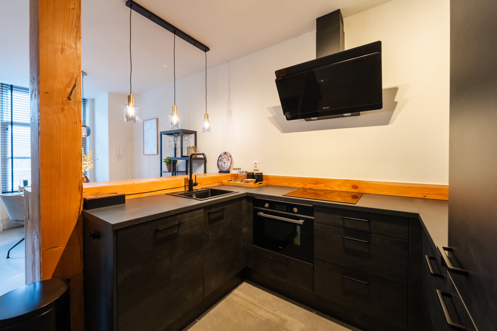 Bij binnenkomst valt direct het hoge afwerkingsniveau op. De PVC-vloer zorgt voor een warme, moderne uitstraling en vormt samen met de zorgvuldig behouden details een sfeervol geheel. De open keuken is het kloppende hart van het appartement. Er is een gezellige bar gerealiseerd en het moderne inbouwapparatuur zoals een vaatwasser, inductiekookplaat, afzuigkap en combi-magnetron maken het compleet.