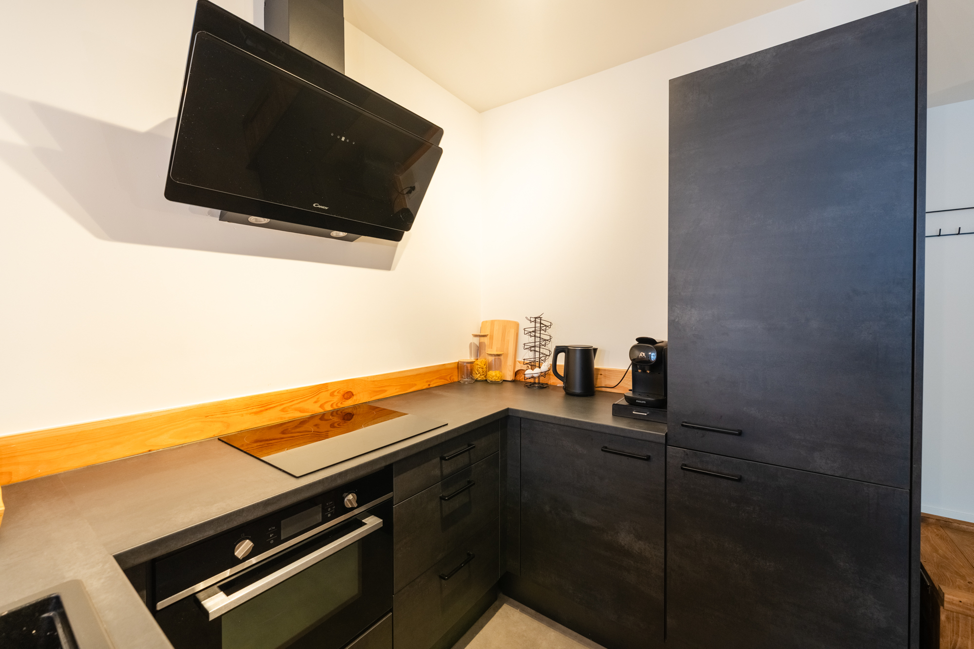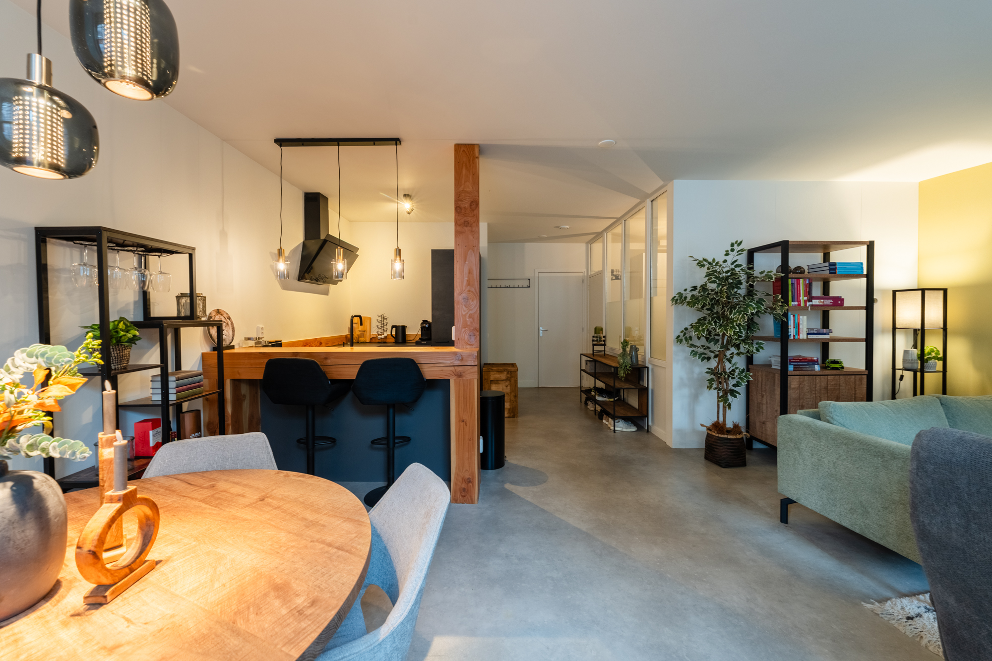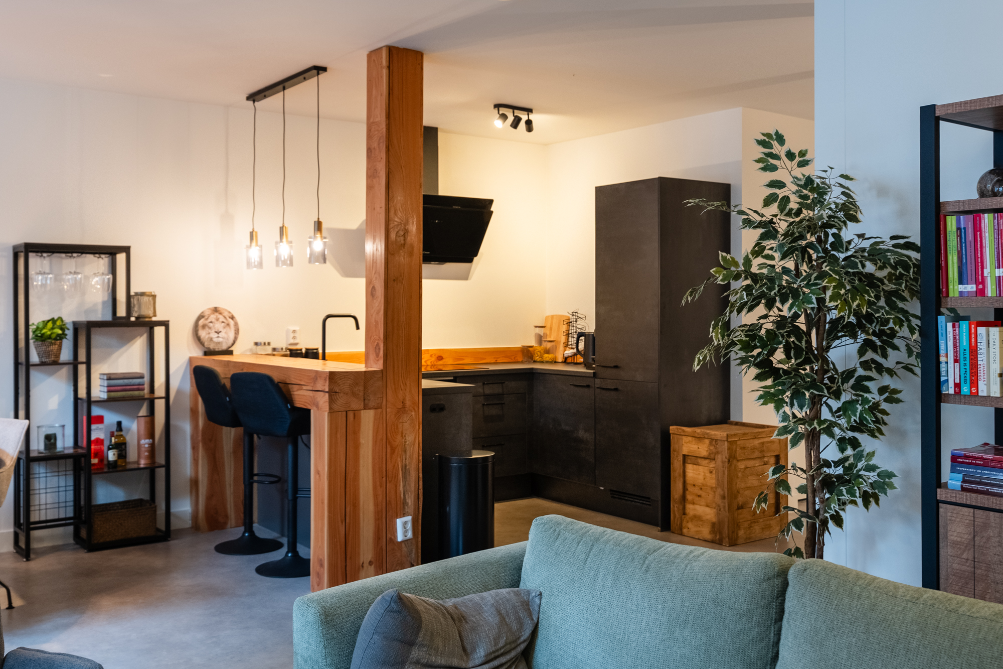 Bij binnenkomst valt direct het hoge afwerkingsniveau op. De PVC-vloer zorgt voor een warme, moderne uitstraling en vormt samen met de zorgvuldig behouden details een sfeervol geheel. De open keuken is het kloppende hart van het appartement. Er is een gezellige bar gerealiseerd en het moderne inbouwapparatuur zoals een vaatwasser, inductiekookplaat, afzuigkap en combi-magnetron maken het compleet.