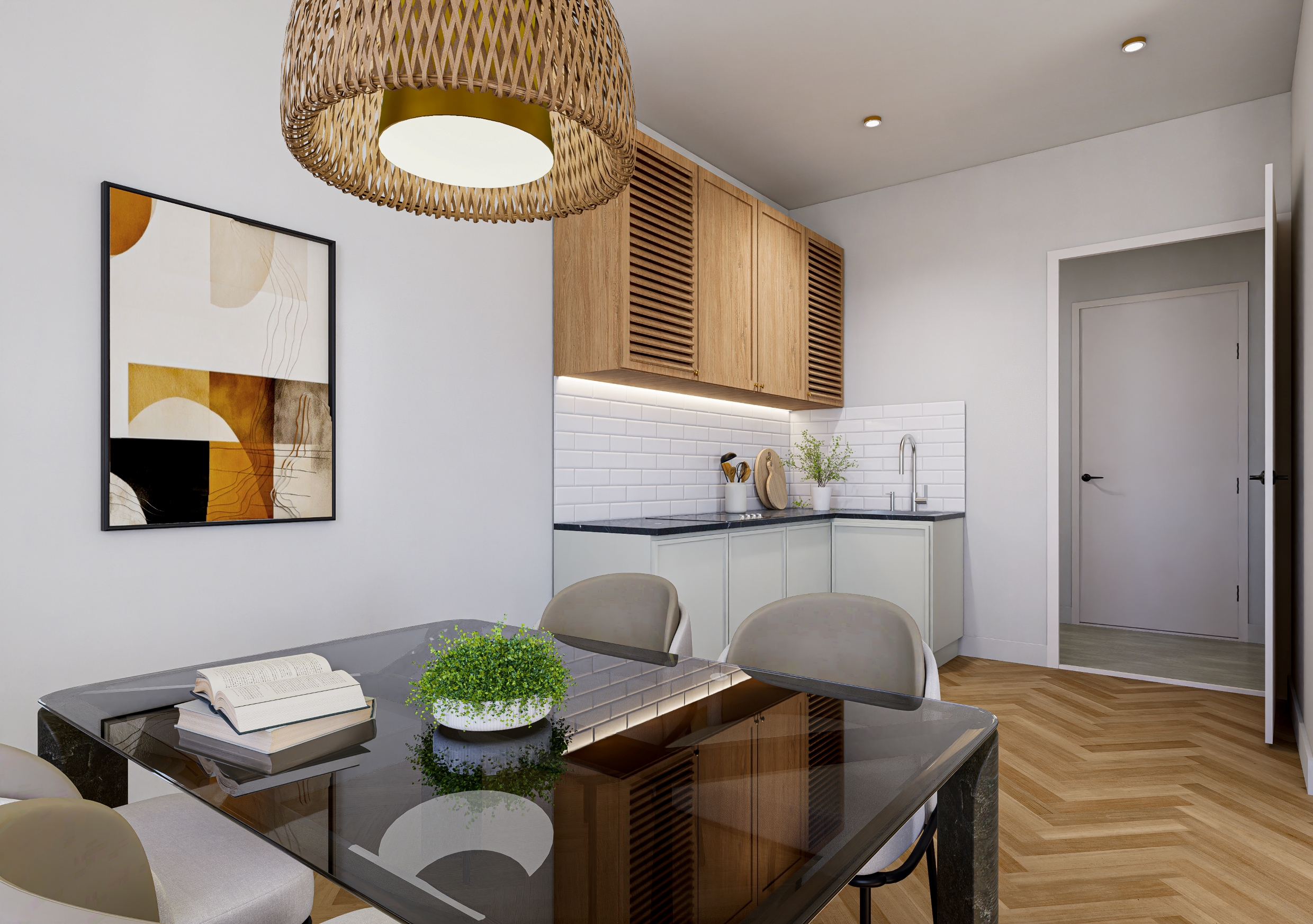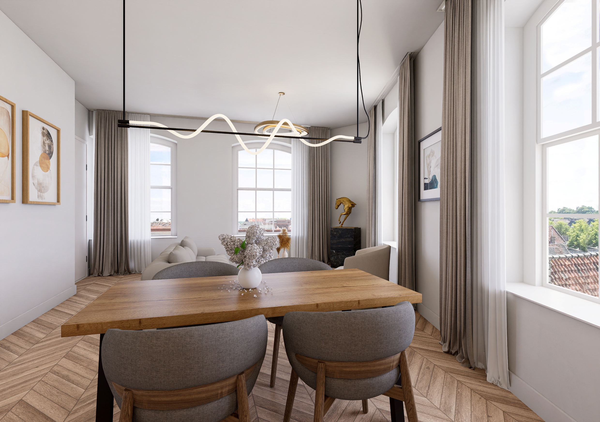 Wat bleef: het statige trappenhuis, de hoge plafonds en de grote ramen die het licht royaal binnenlaten. Wat kwam: slimme plattegronden, duurzame installaties en eigentijdse afwerkingen. De appartementen hebben grotendeels een vergelijkbare indeling, met per verdieping verschillen in ligging en uitzicht.
