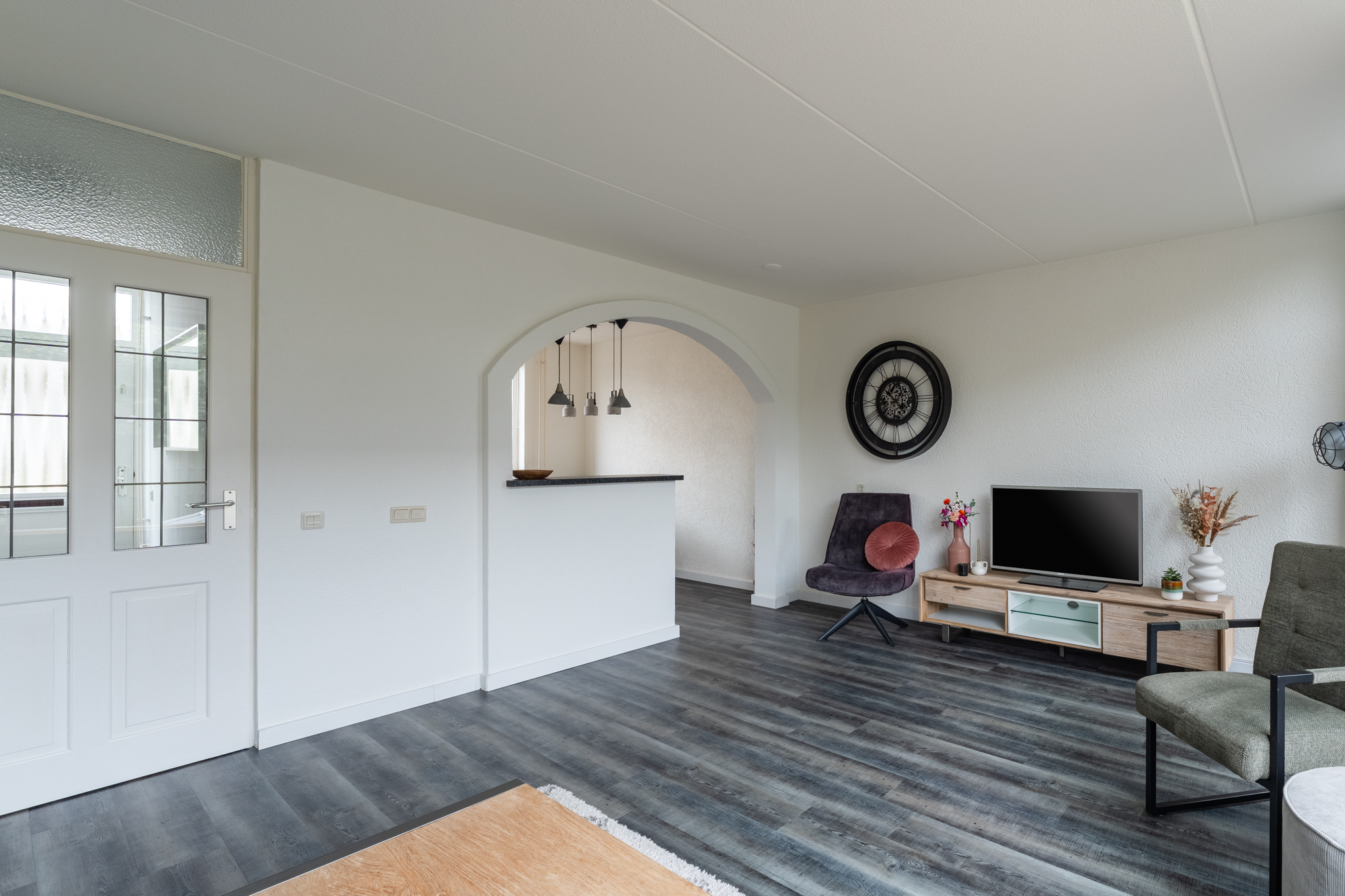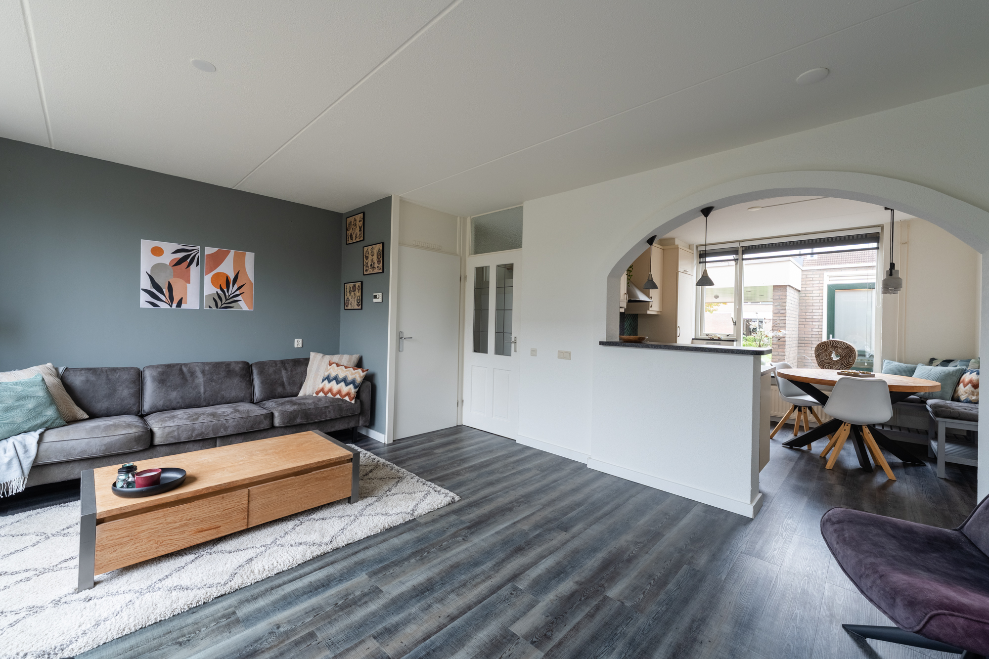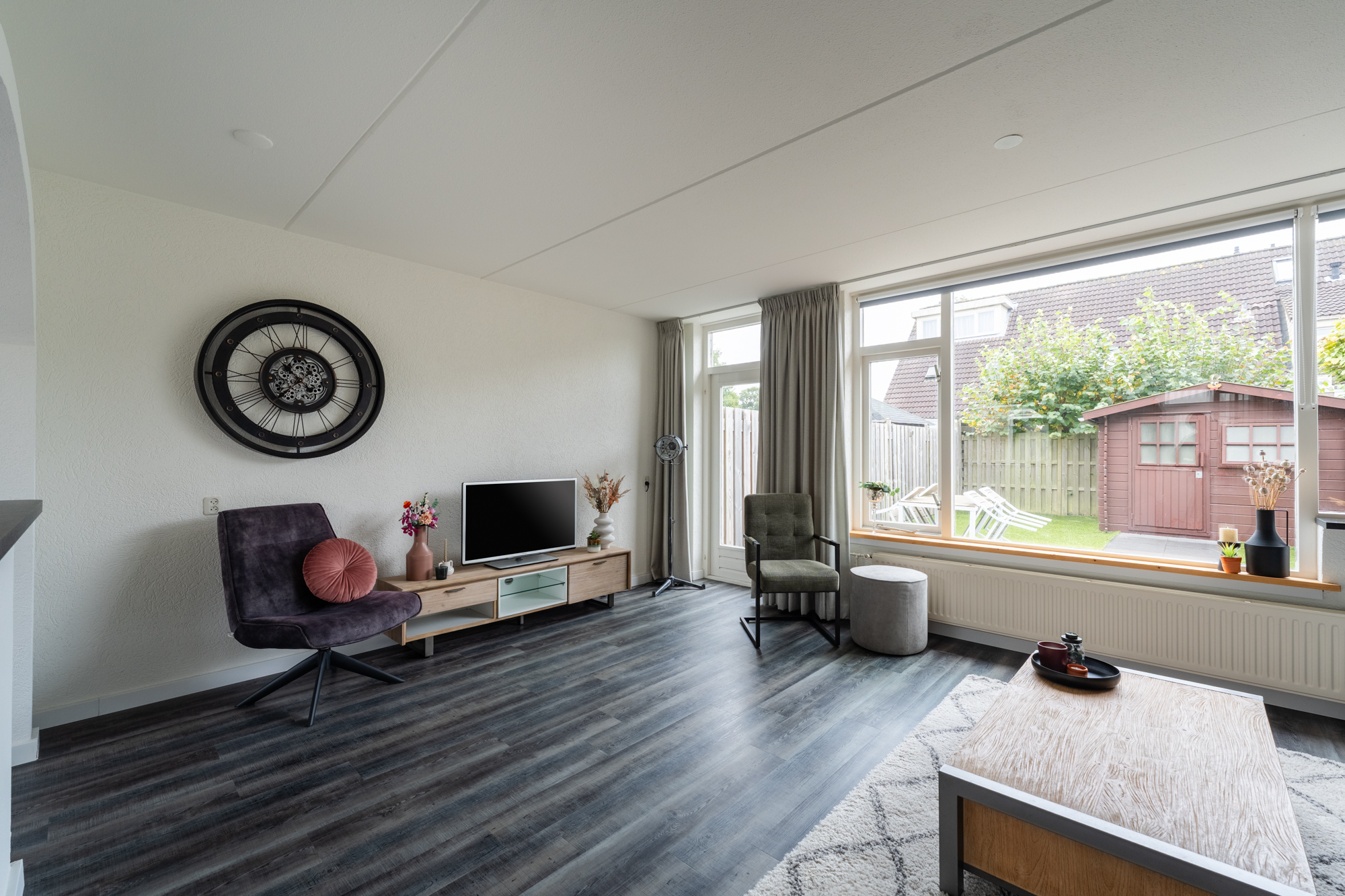 Aan de voorzijde vind je een carport en een stenen berging, ideaal voor fietsen en opslag. Je betreedt de woning via de hal met toilet (hangend closet), meterkast en trapopgang. De woonkamer en keuken zijn voorzien vloerverwarming (bijverwarming), radiatoren en een moderne PVC-vloer. De halfopen hoekkeuken is uitgerust met een vaatwasser, inductiekookplaat, combi-oven/magnetron, afzuigkap, koel-vriescombinatie en boiler. Vanuit de woonkamer heb je toegang tot de zonnige achtertuin op het zuidoosten.