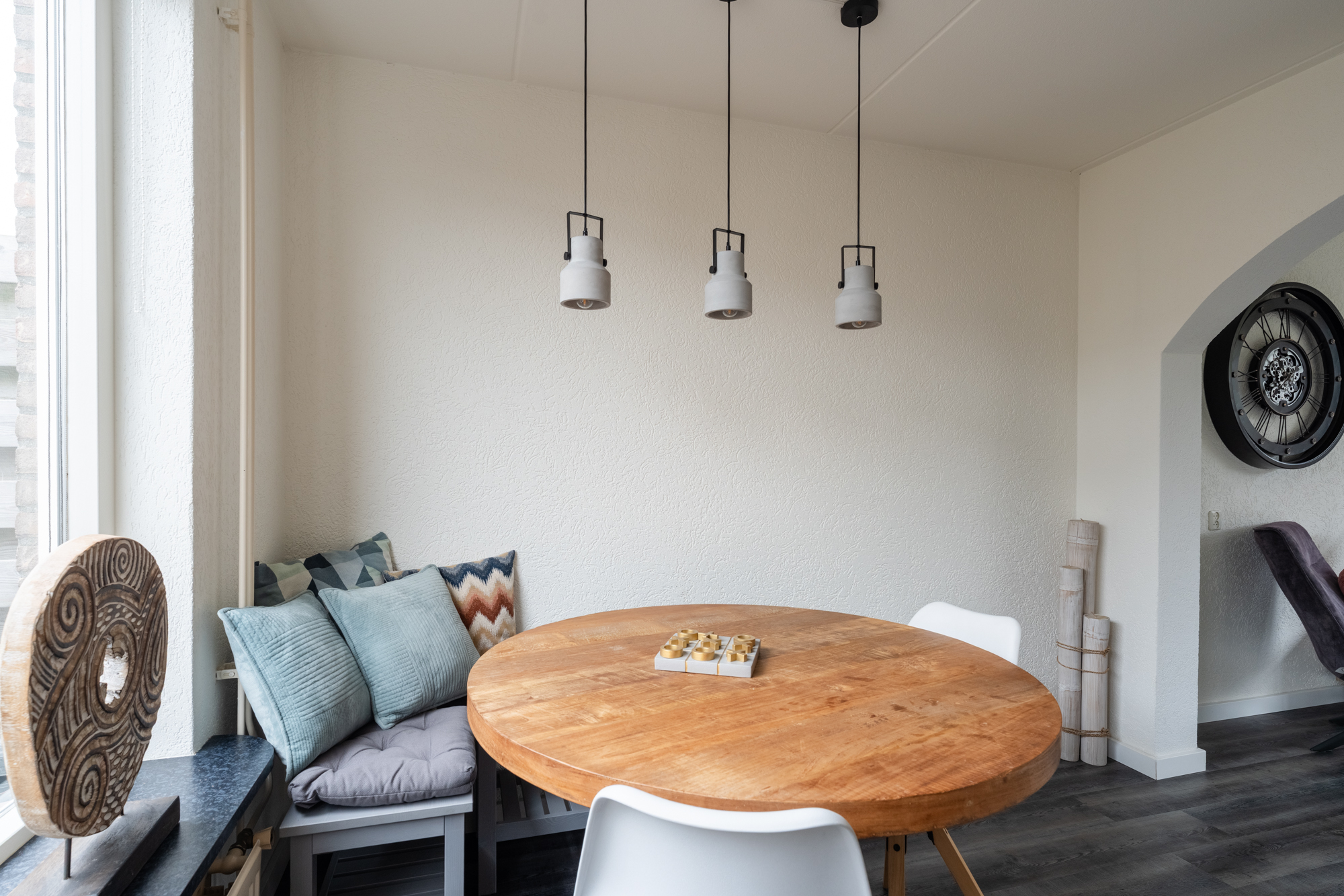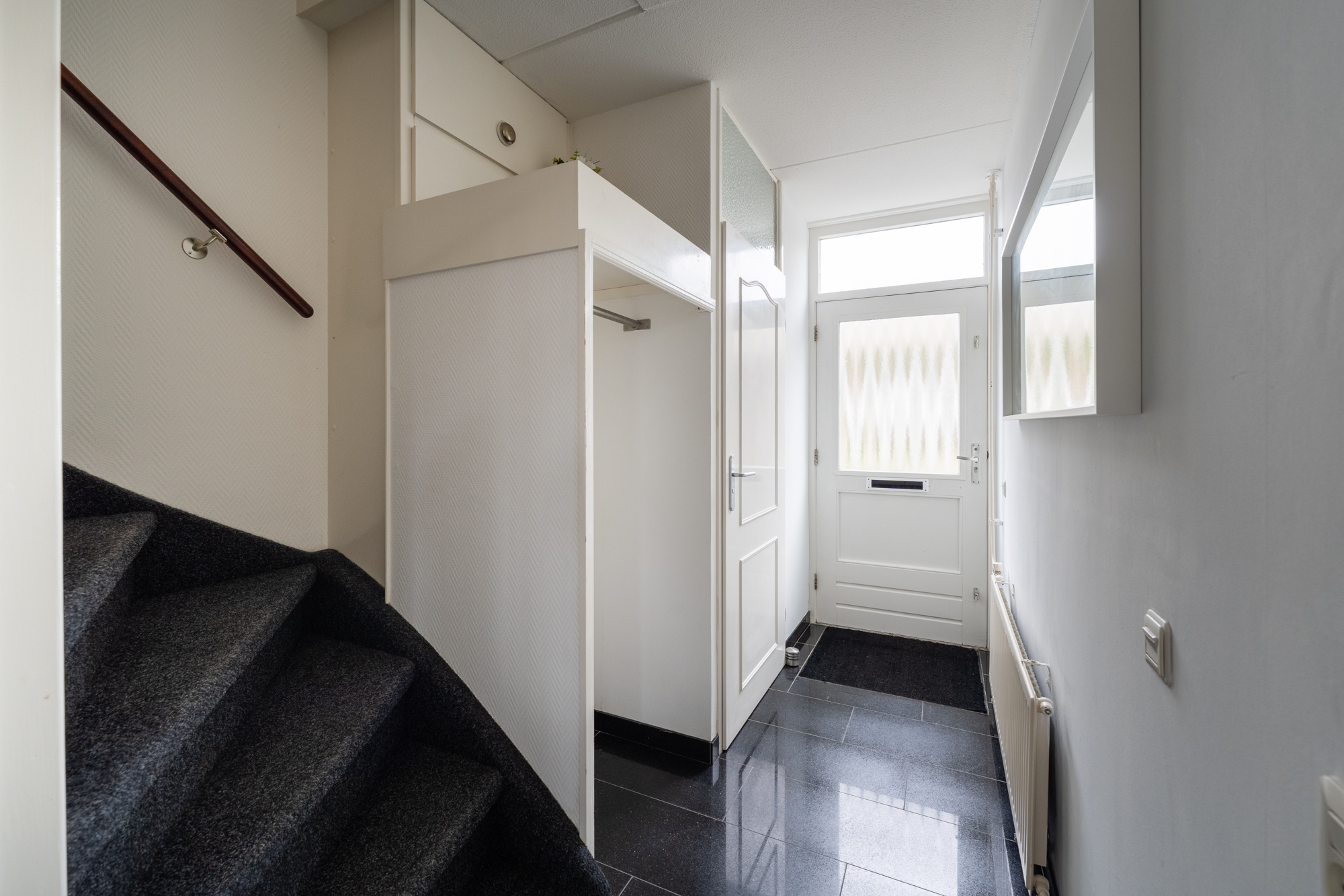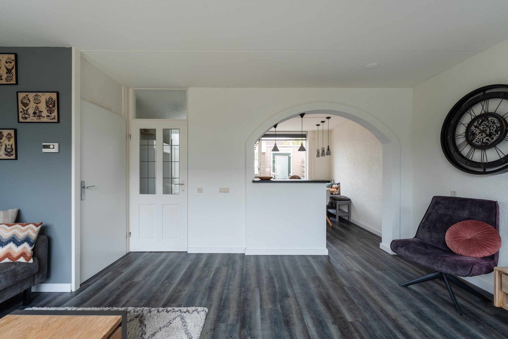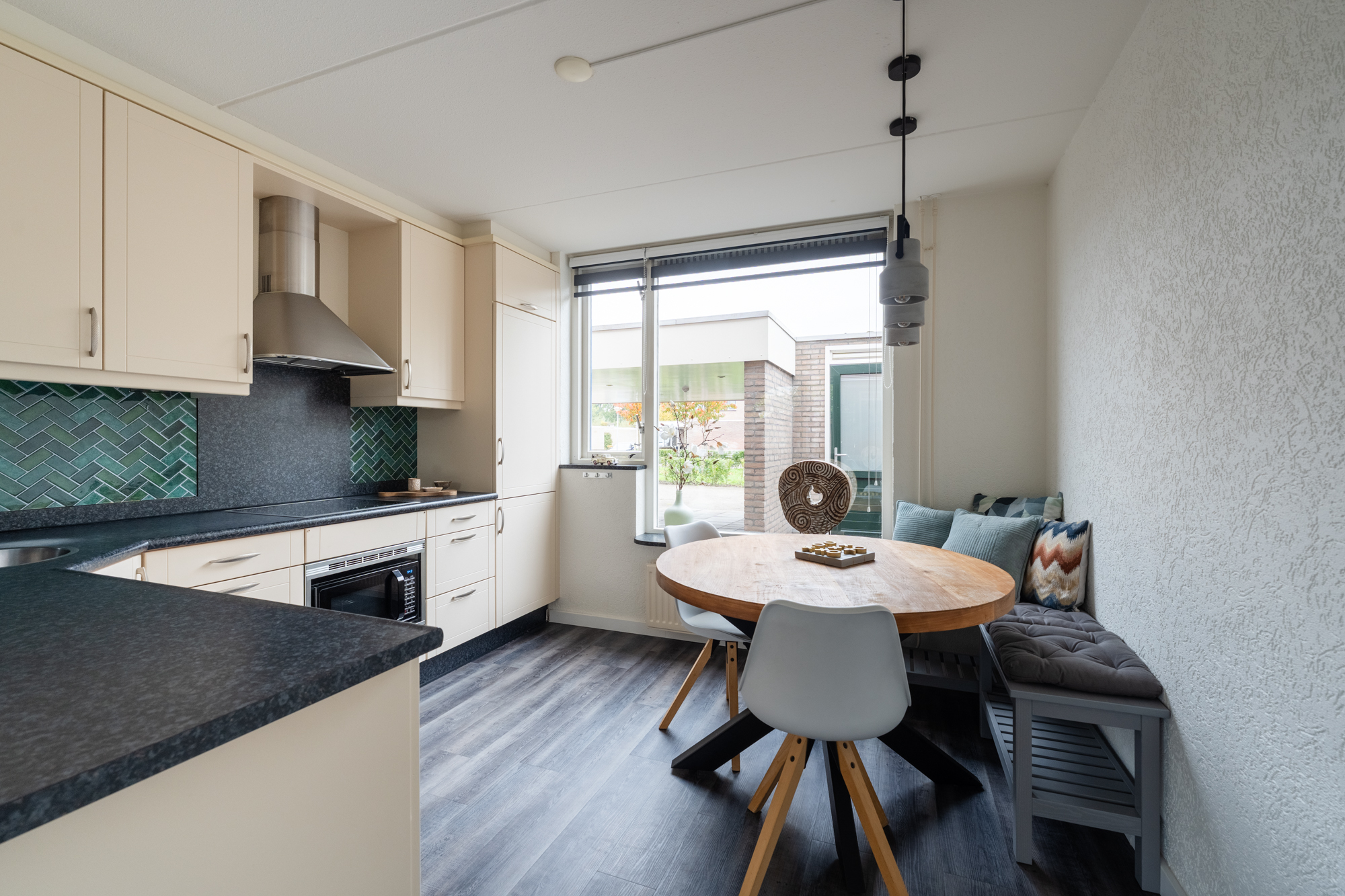Aan de voorzijde vind je een carport en een stenen berging, ideaal voor fietsen en opslag. Je betreedt de woning via de hal met toilet (hangend closet), meterkast en trapopgang. De woonkamer en keuken zijn voorzien vloerverwarming (bijverwarming), radiatoren en een moderne PVC-vloer. De halfopen hoekkeuken is uitgerust met een vaatwasser, inductiekookplaat, combi-oven/magnetron, afzuigkap, koel-vriescombinatie en boiler. Vanuit de woonkamer heb je toegang tot de zonnige achtertuin op het zuidoosten.