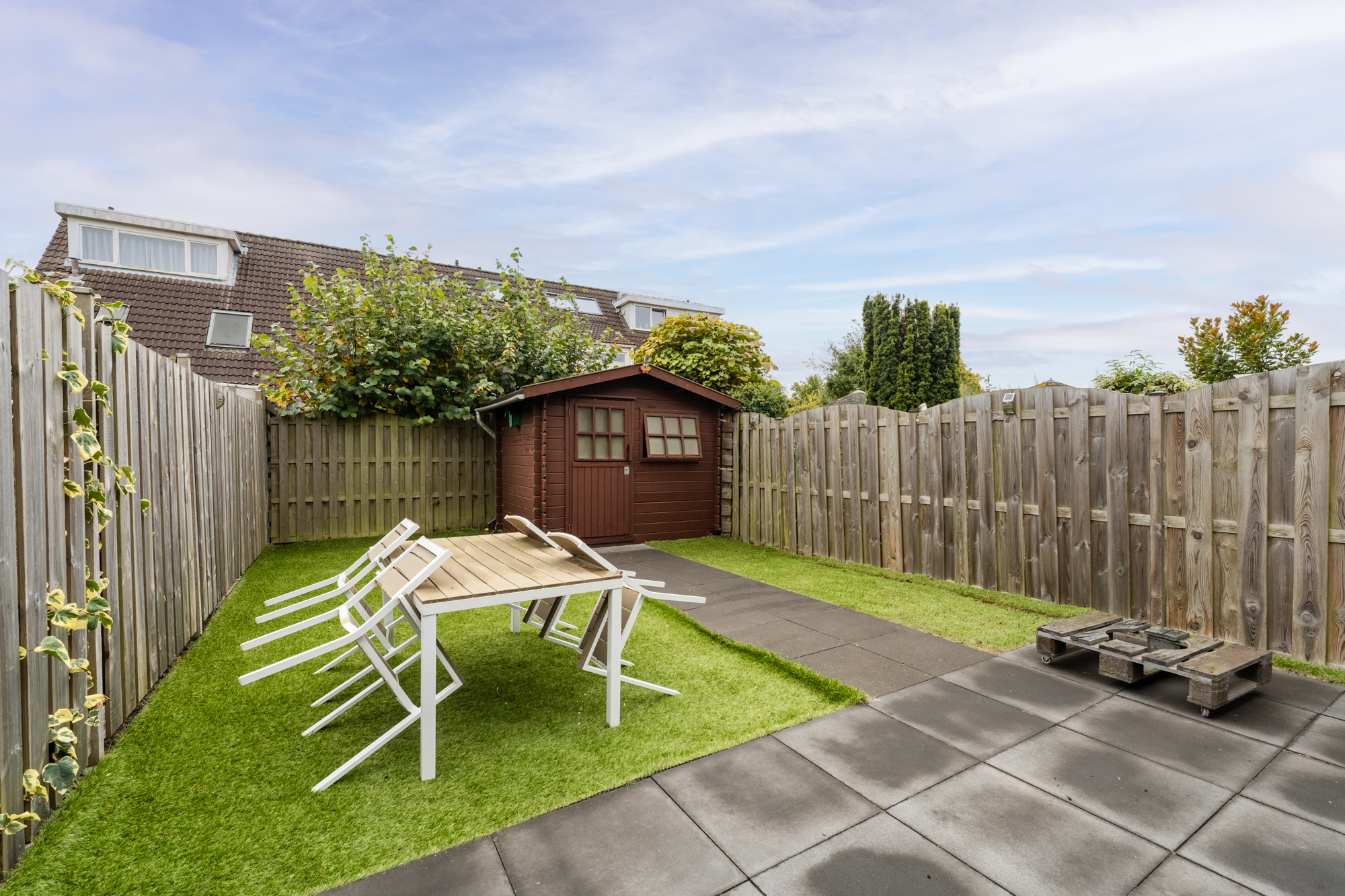 De zonnige achtertuin, gelegen op het zuidoosten, is onderhoudsvriendelijk ingericht met kunstgras en een ruim terras. Zowel aan de voor- als achterzijde is een buitenkraan aanwezig. In de achtertuin staat bovendien een houten berging met elektra, ideaal voor tuingereedschap of extra opslag.