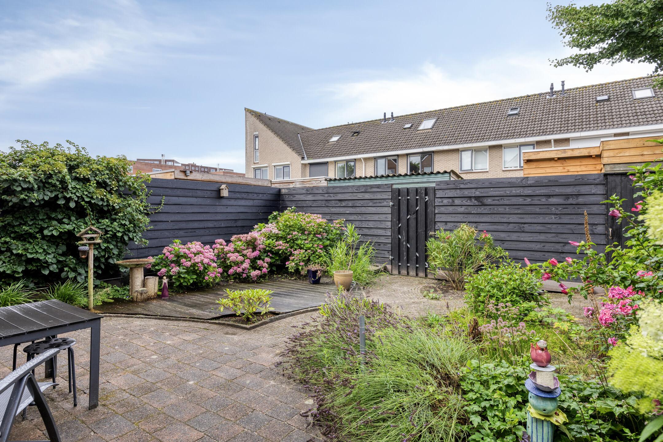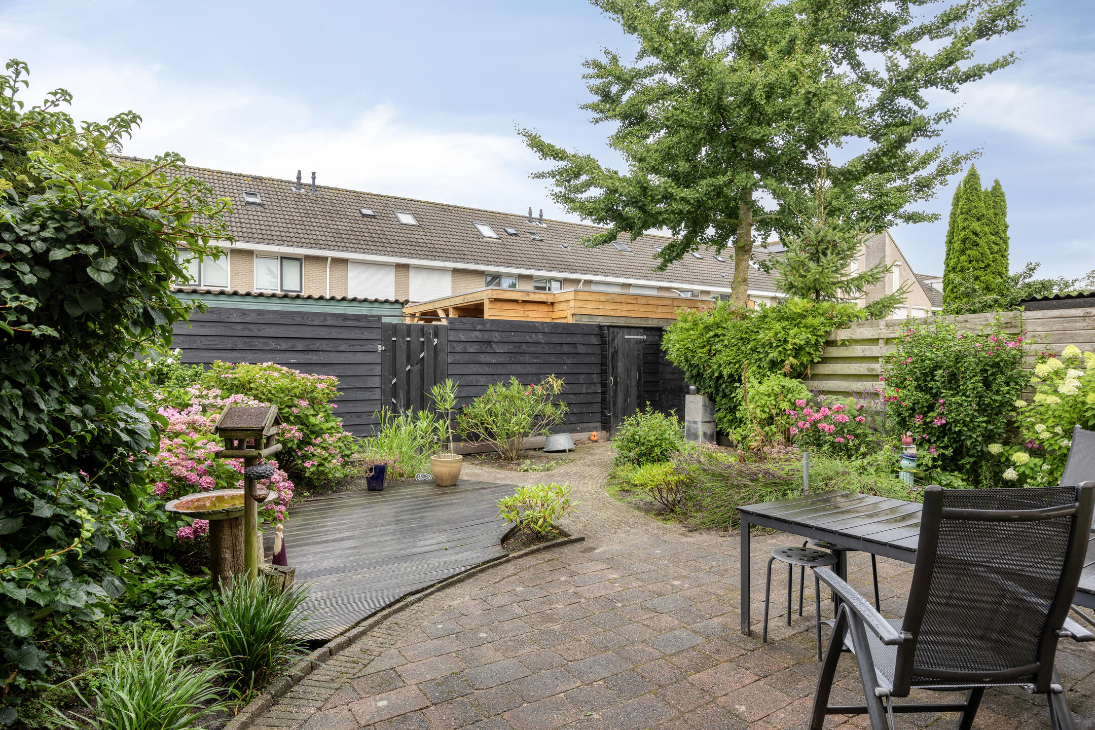 De achtertuin is zonnig gelegen op het westen en biedt volop privacy. Dankzij de openslaande deuren vanuit de woonkamer en een achterom is de tuin goed bereikbaar en praktisch in gebruik. Recent is er nog een nieuw zonnescherm gemonteerd.