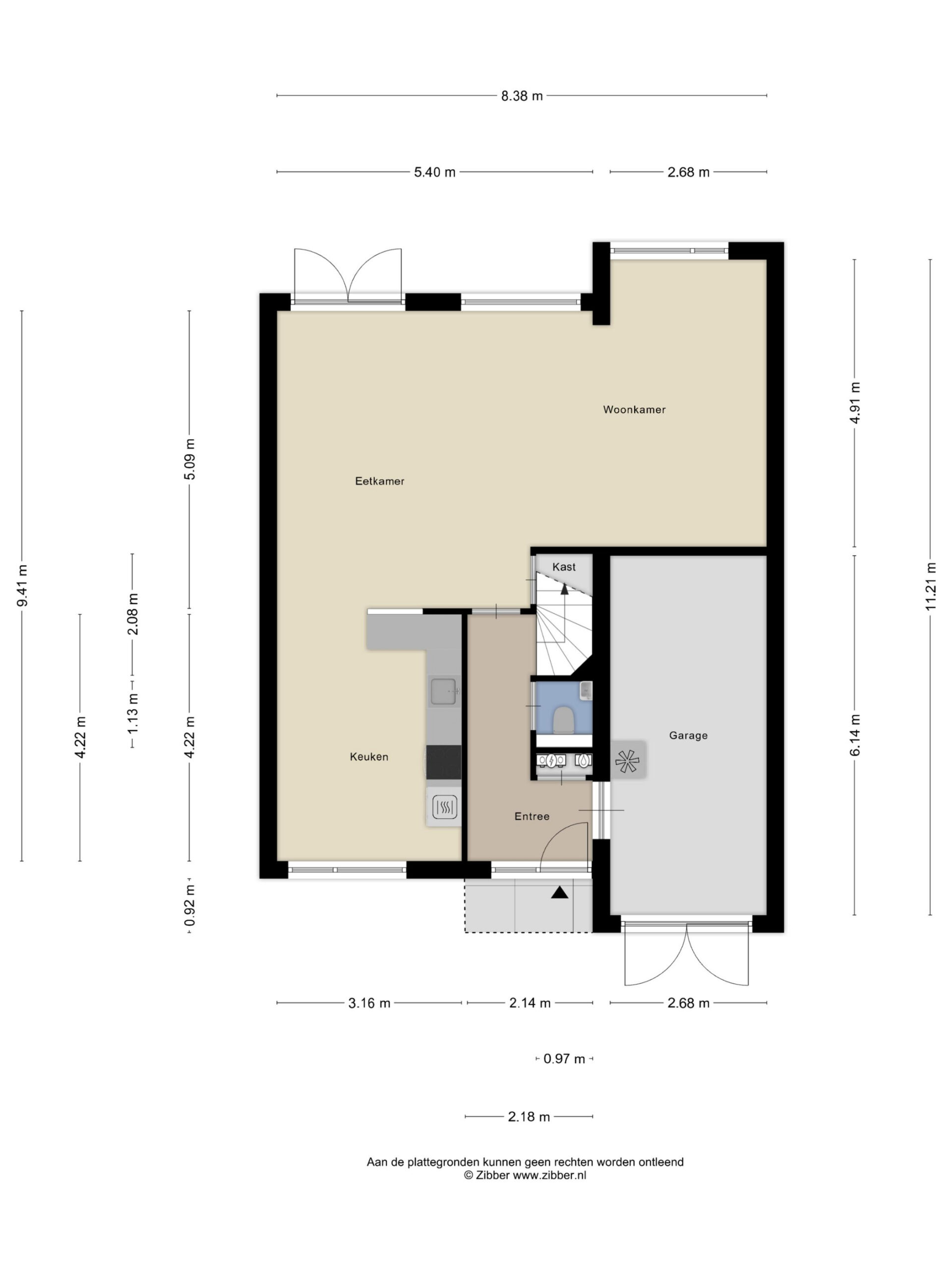 Voortuin, entree, hal met meterkast, separaat toilet, toegang tot inpandige garage en trapopgang. Tuingerichte woonkamer met openslaande deuren en moderne open keuken aan de voorzijde.