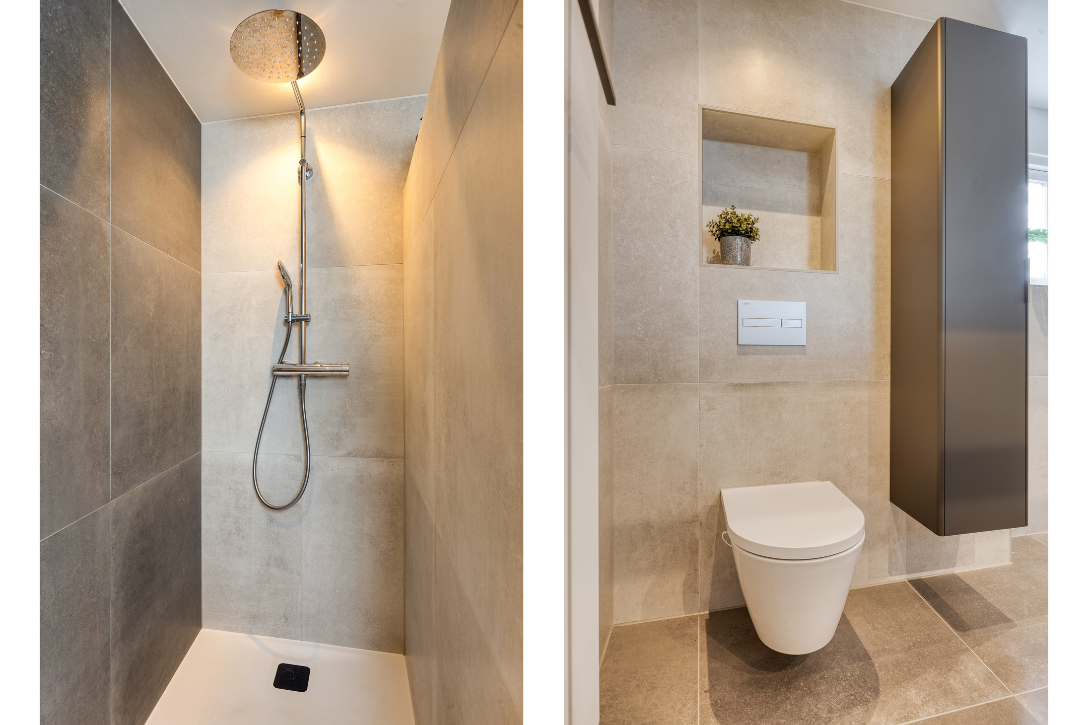 Overloop, twee slaapkamers en moderne badkamer met inloopdouche, tweede toilet en wastafelmeubel.