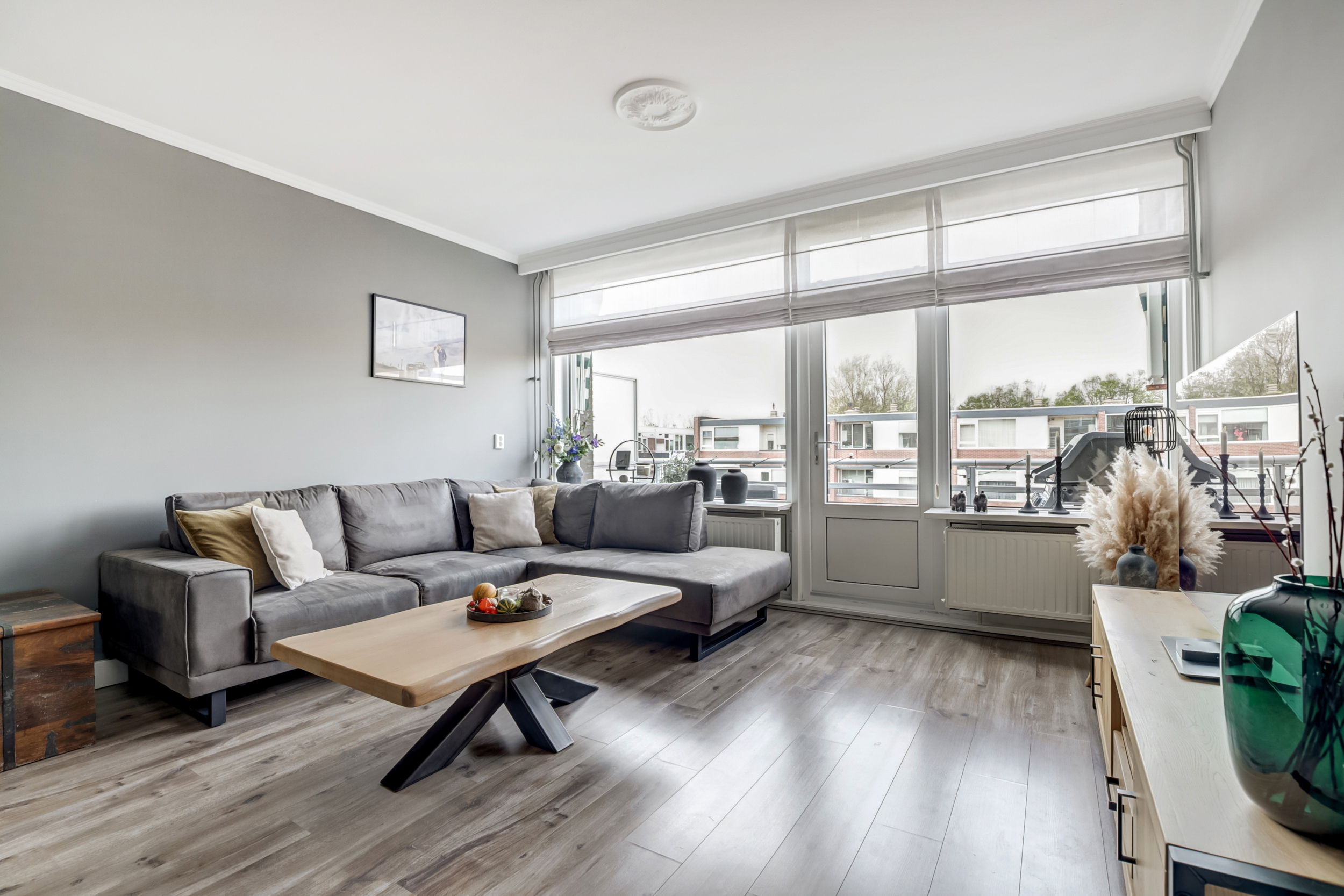 De woonkamer is ruim van opzet en strekt zich uit over de volledige breedte van de woning. Grote ramen zorgen voor een overvloed aan daglicht en bieden een fraai uitzicht over de omgeving. De muren zijn strak gestuukt en afgewerkt in een zachte grijsgroene tint, die perfect combineert met de lichte laminaatvloer. De ruimte biedt volop mogelijkheden voor een royale zithoek en een grote eettafel. Via de woonkamer heeft u toegang tot het ruime balkon, waar u geniet van de ochtendzon en een vrij uitzicht!