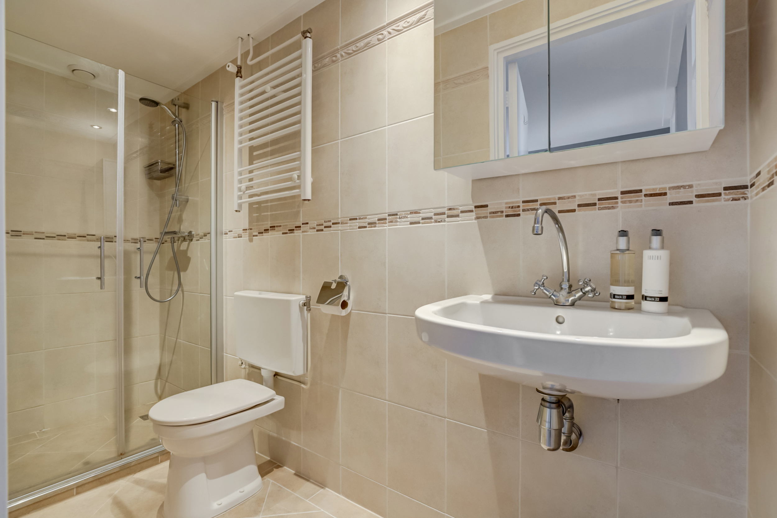 De badkamer is compleet en stijlvol afgewerkt met zandkleurige wand- en vloertegels, een decoratieve mozaïekrand en moderne sanitaire voorzieningen. Er is een ruime inloopdouche met glazen schuifwand, een wastafel met spiegelkast en een toilet.