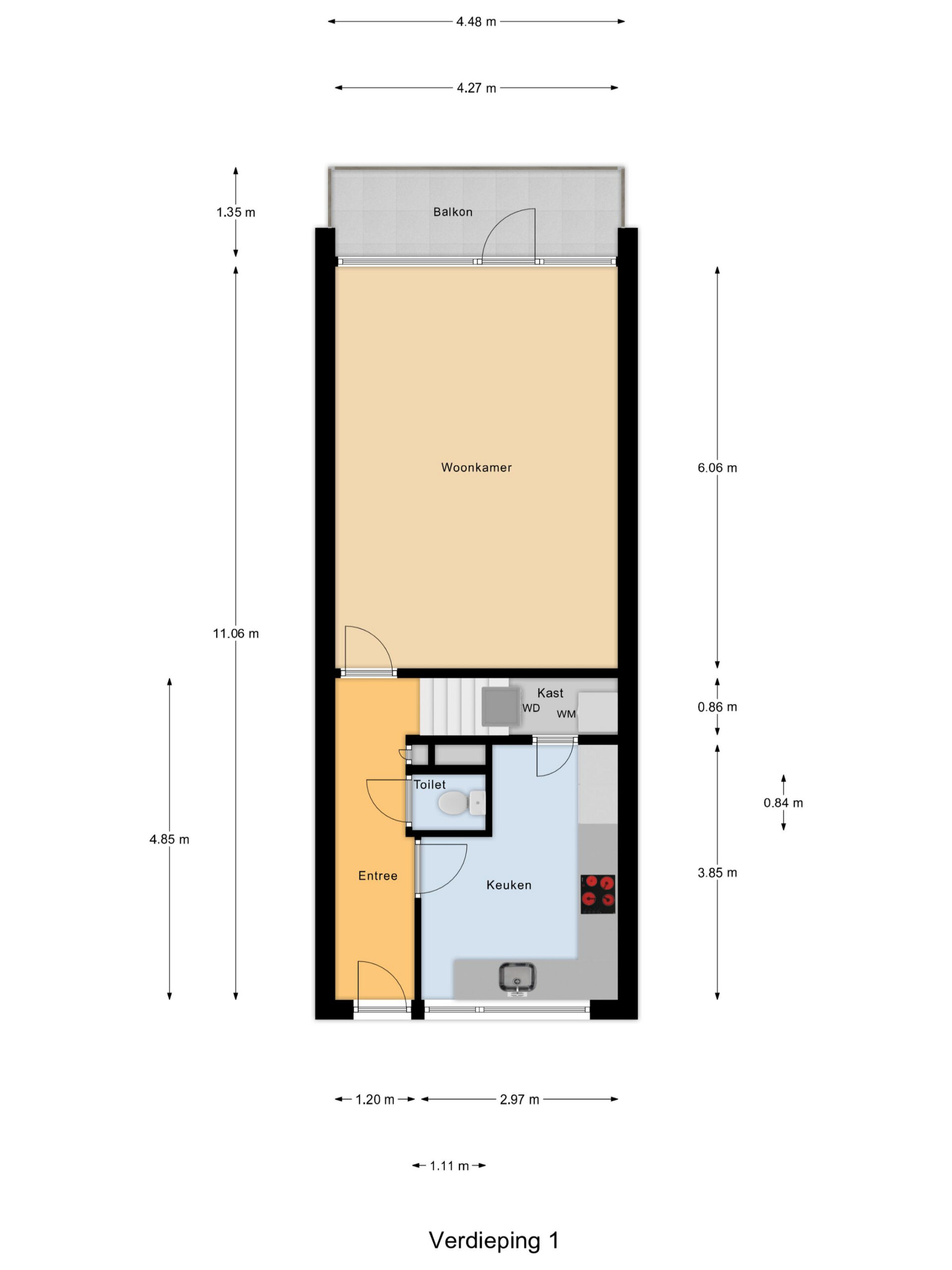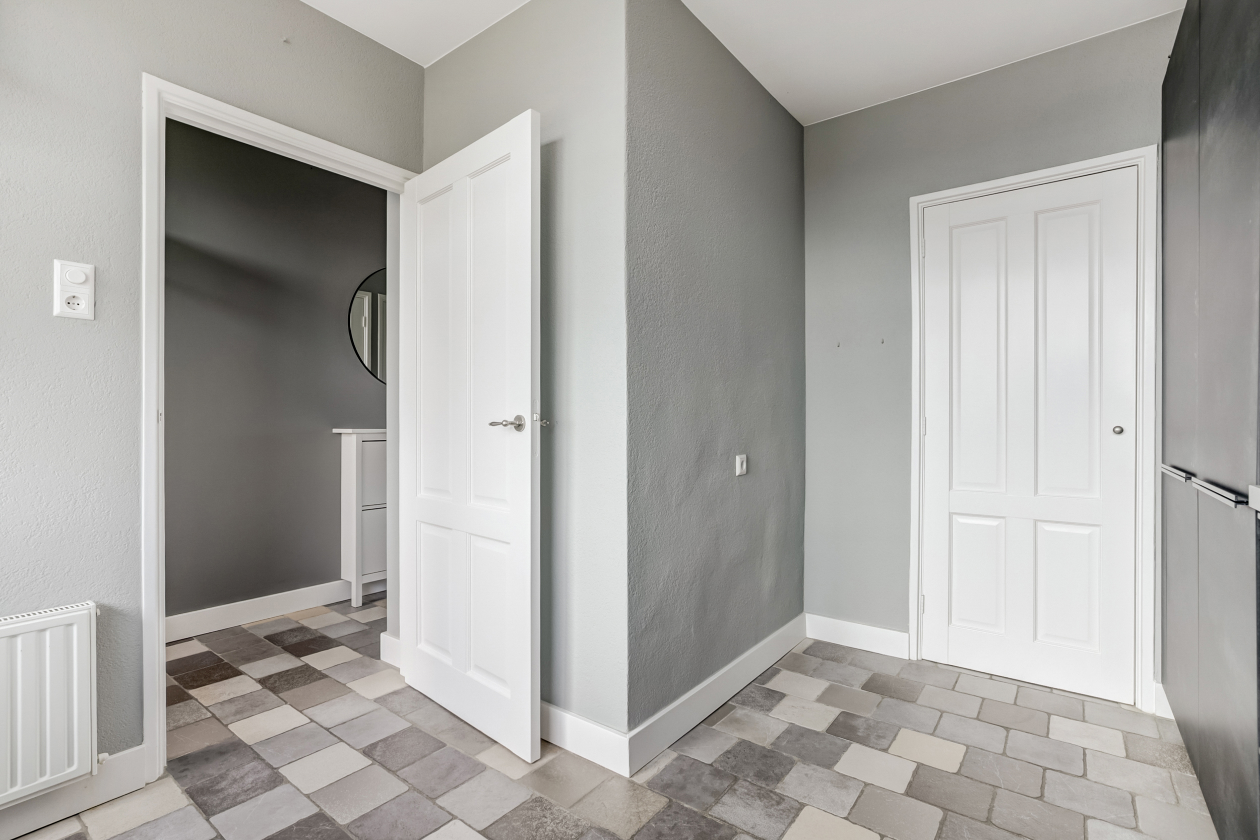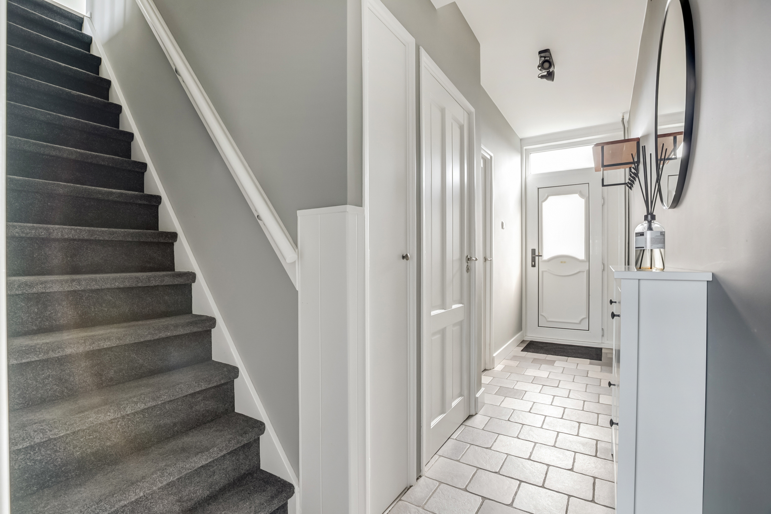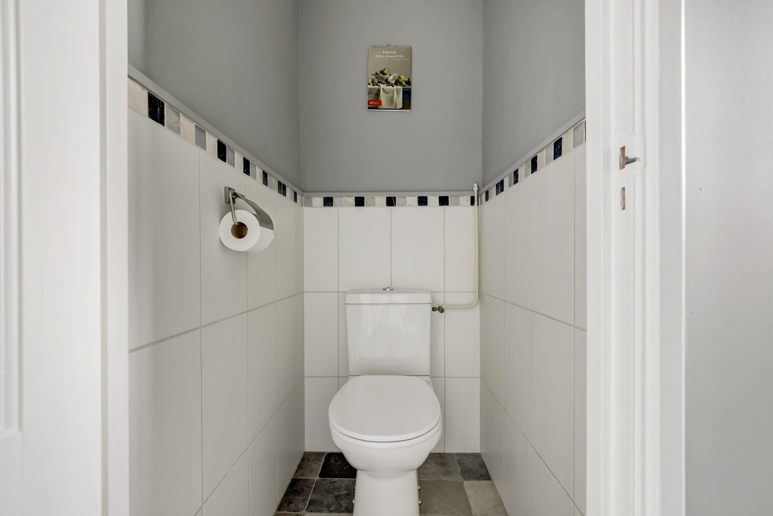 U betreedt de woning via de entreehal met moderne toiletruimte, uitgevoerd met lichte tegels en een wandcloset. Vanuit de hal heeft u toegang tot de trapopgang, en tot zowel de keuken als de woonkamer.