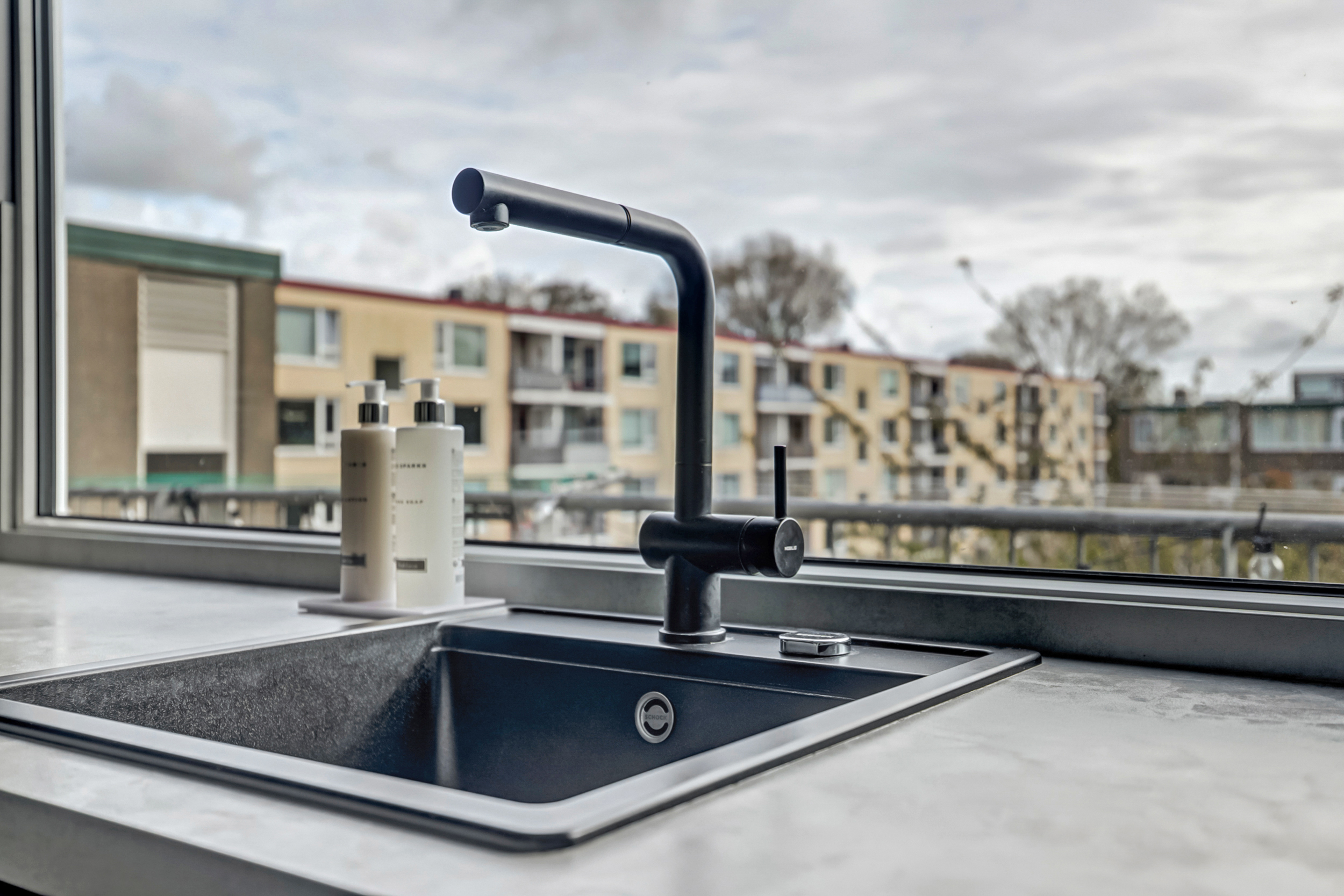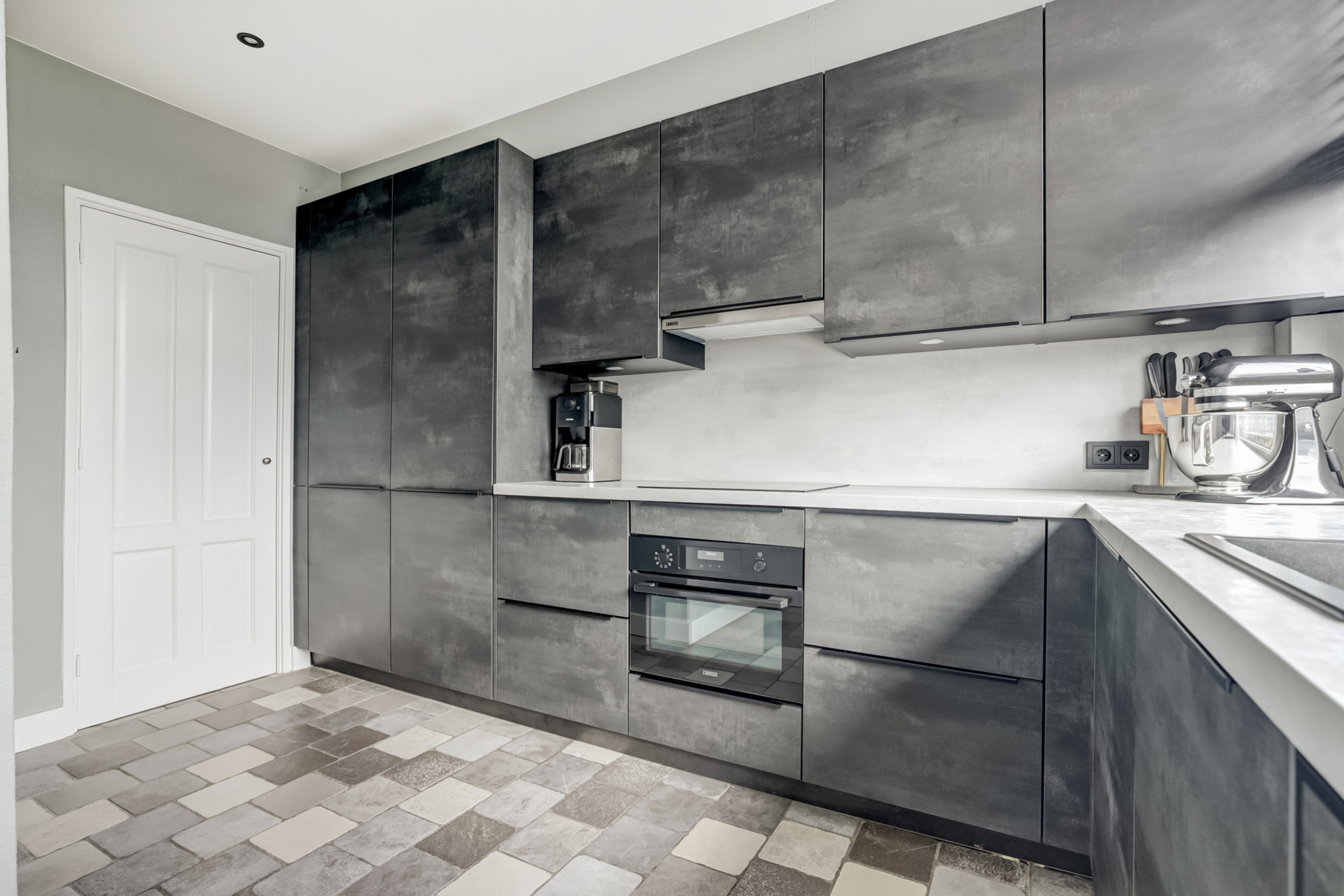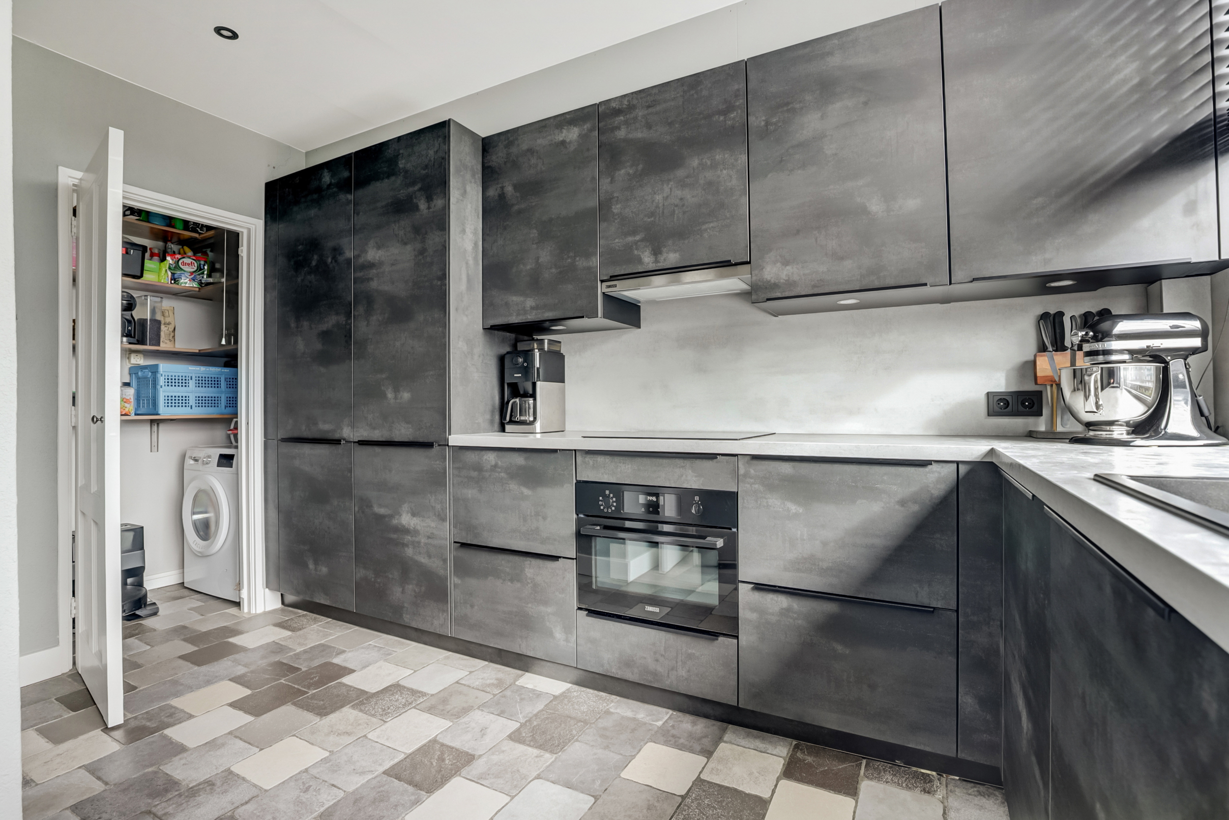 De keuken aan de voorzijde (vernieuwd in 2023) is een absolute blikvanger, uitgevoerd in een stijlvolle donkergrijze betonlook met greeploze kastfronten, een strak licht werkblad en moderne inbouwapparatuur, waaronder een inductiekookplaat, afzuigkap, oven en vaatwasser. De samenstelling is praktisch en esthetisch tegelijk, met voldoende opbergruimte en een frisse, industriële uitstraling. Aangrenzend bevindt zich de bijkeuken/wasruimte, waar plaats is voor de wasmachine, droger en extra opslag!