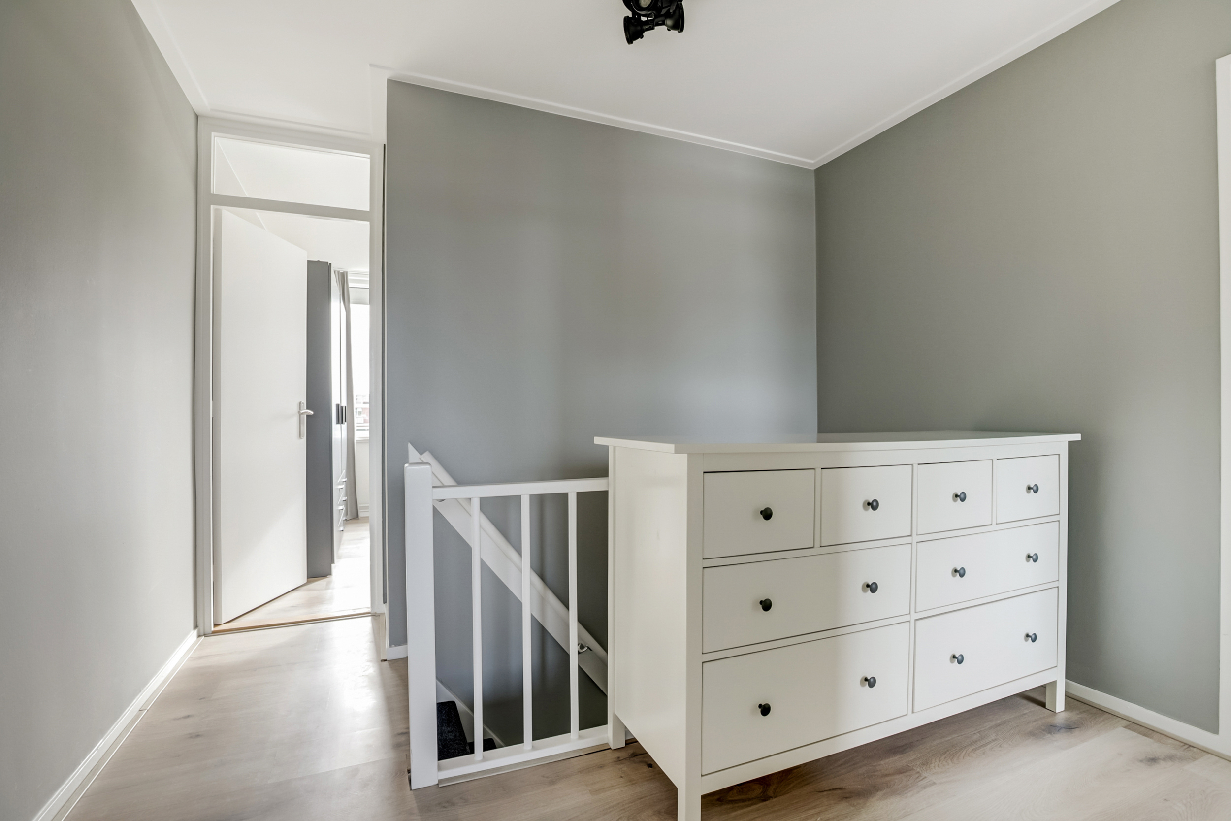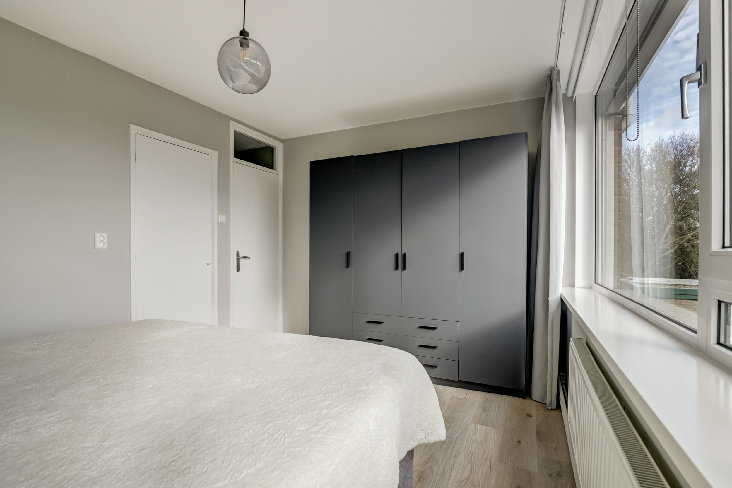 De hoofdslaapkamer aan de voorzijde is royaal bemeten, voorzien van rolluiken en geniet van veel licht dankzij de brede raampartij over de gehele gevelbreedte. De kamer is modern ingericht met een grijze wandkleur en een lichte vloer, wat zorgt voor een serene sfeer!