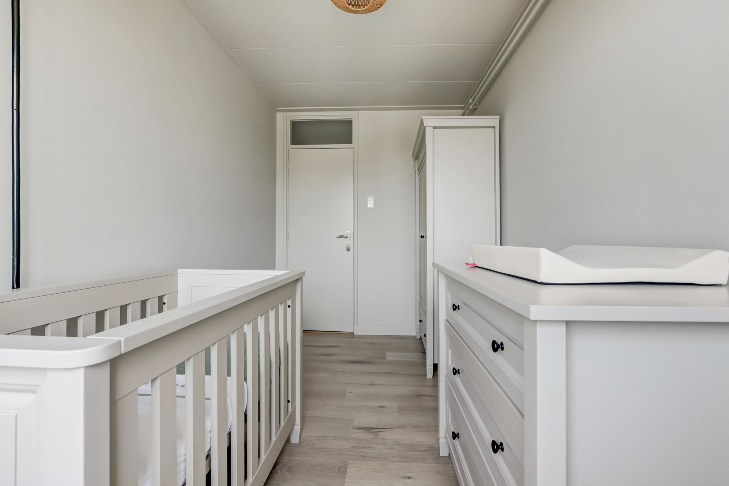 De tweede slaapkamer is eveneens goed van formaat en kan dienen als logeer- of kinderkamer. De derde kamer is ideaal als thuiswerkplek of hobbykamer, met ruimte voor een bureau en kastruimte. Alle kamers zijn voorzien van dezelfde moderne vloerafwerking en rustige kleurtinten, waardoor eenheid en rust worden gecreëerd.