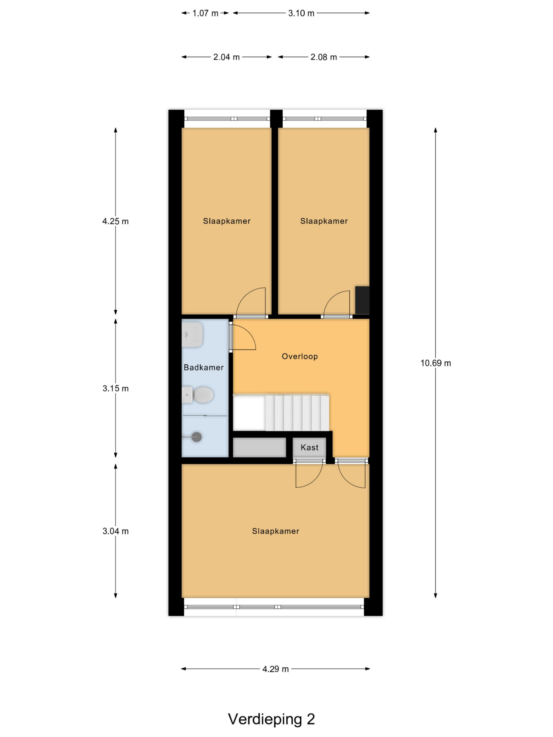 Via de trap bereikt u de tweede woonlaag met de overloop, drie slaapkamers en de badkamer.