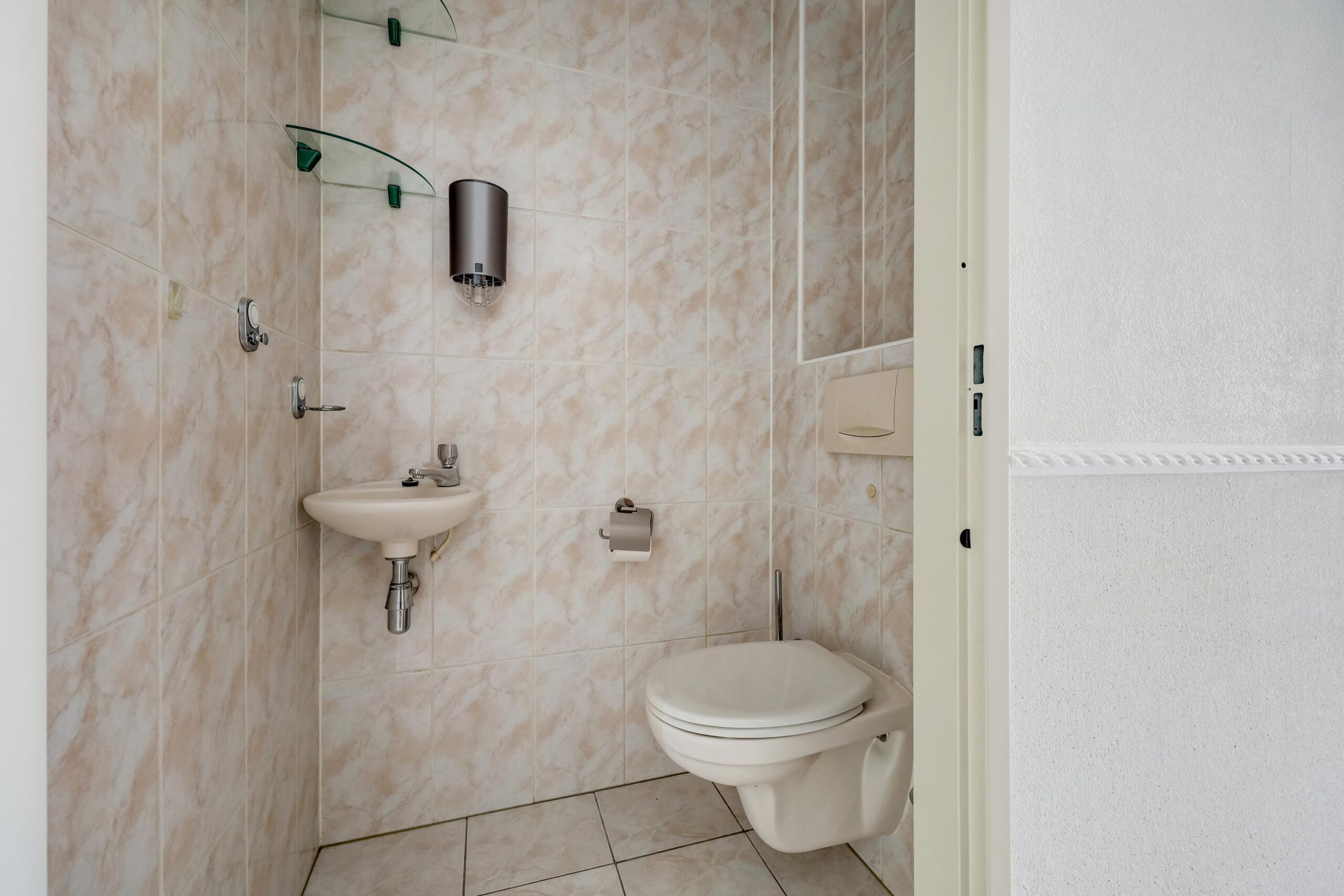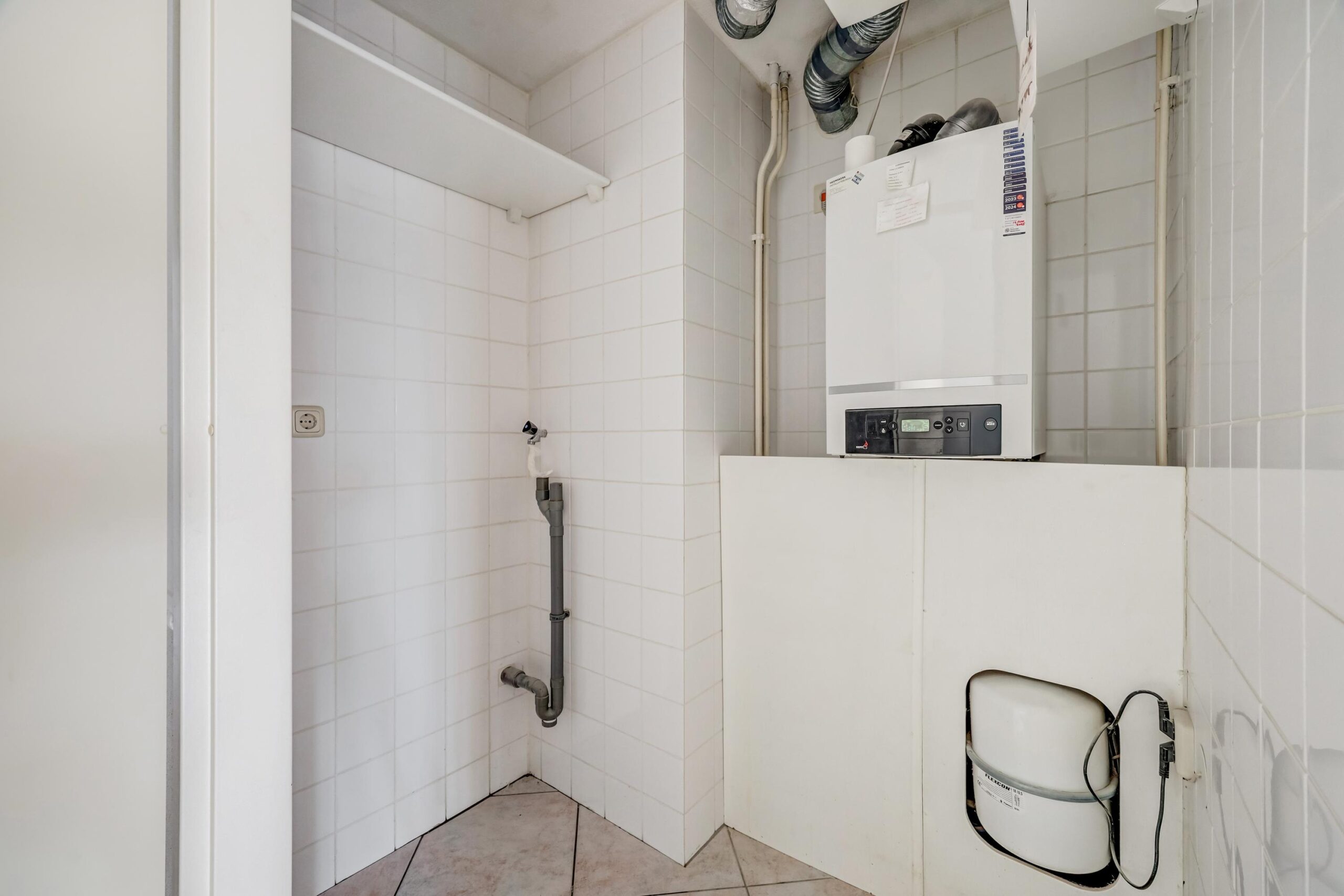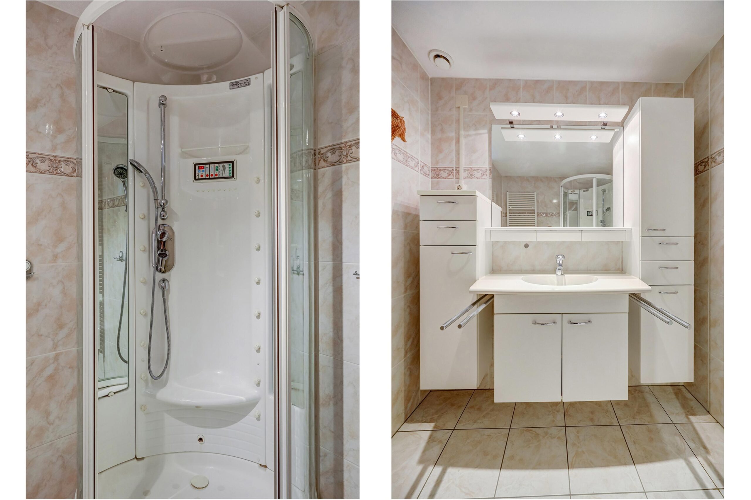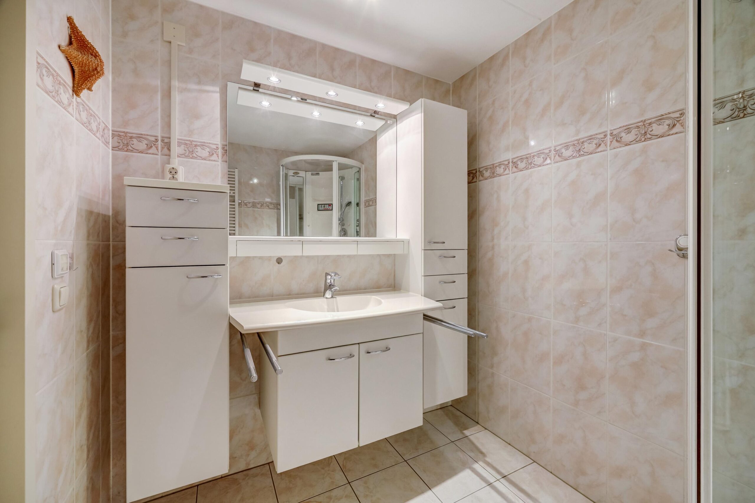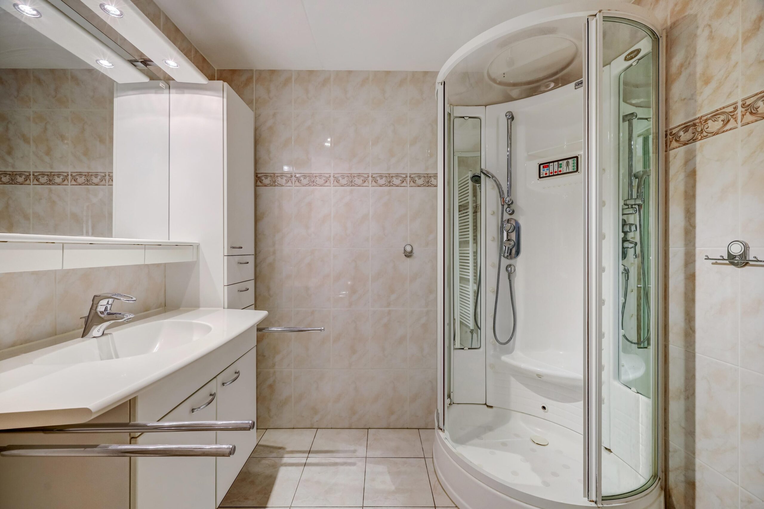 De badkamer is volledig betegeld en voorzien van een ruime douchecabine, een wastafelmeubel met kastruimte en een designradiator. Het geheel is netjes onderhouden. In de hal bevinden zich verder een aparte toiletruimte met fonteintje en een handige bergkast met de cv-installatie.