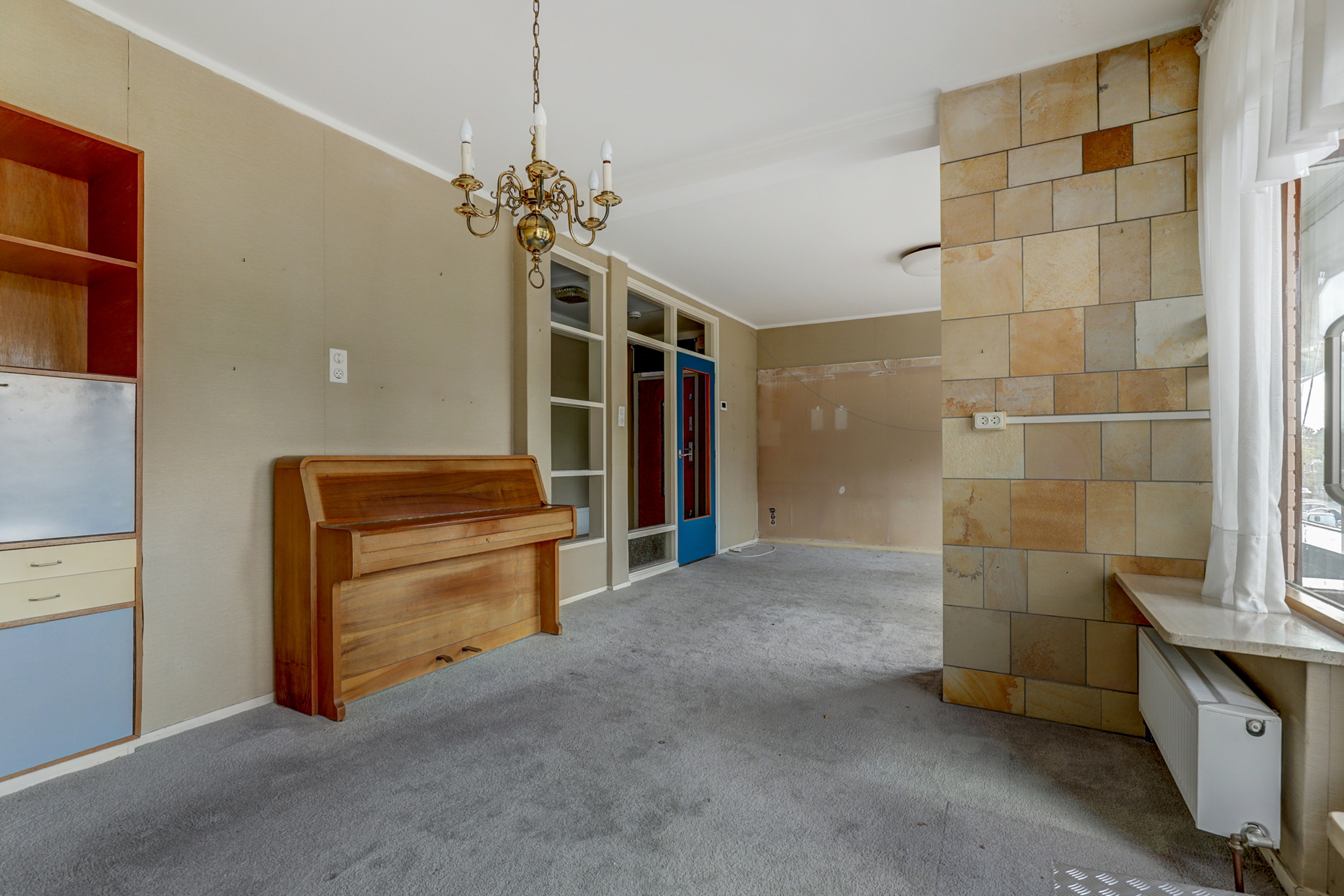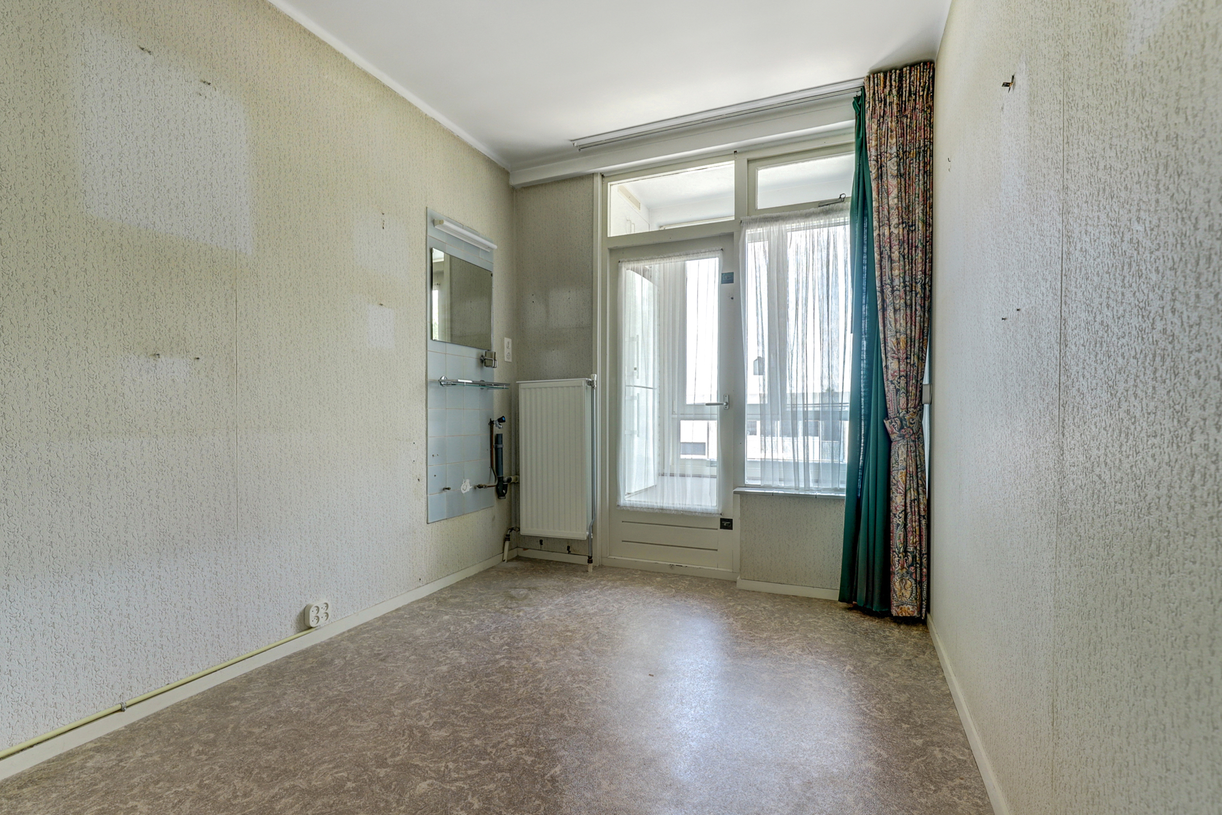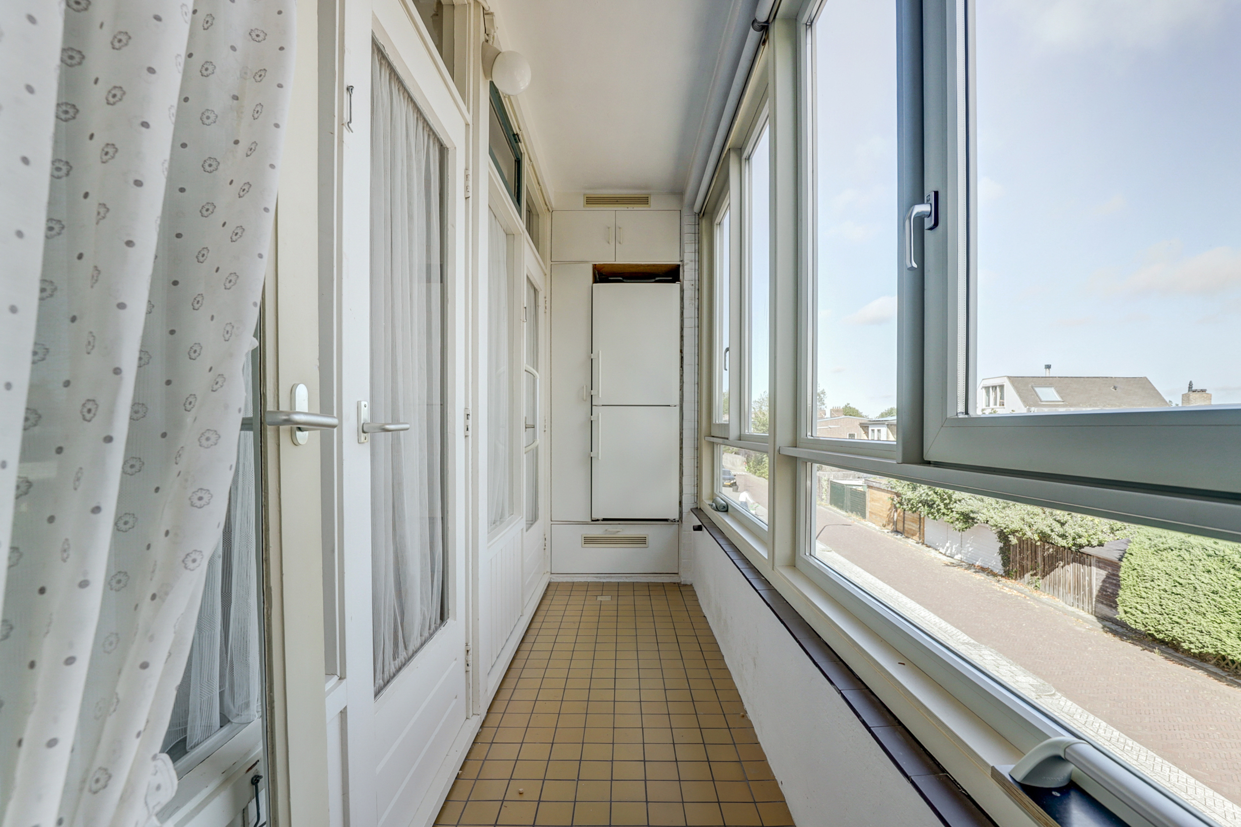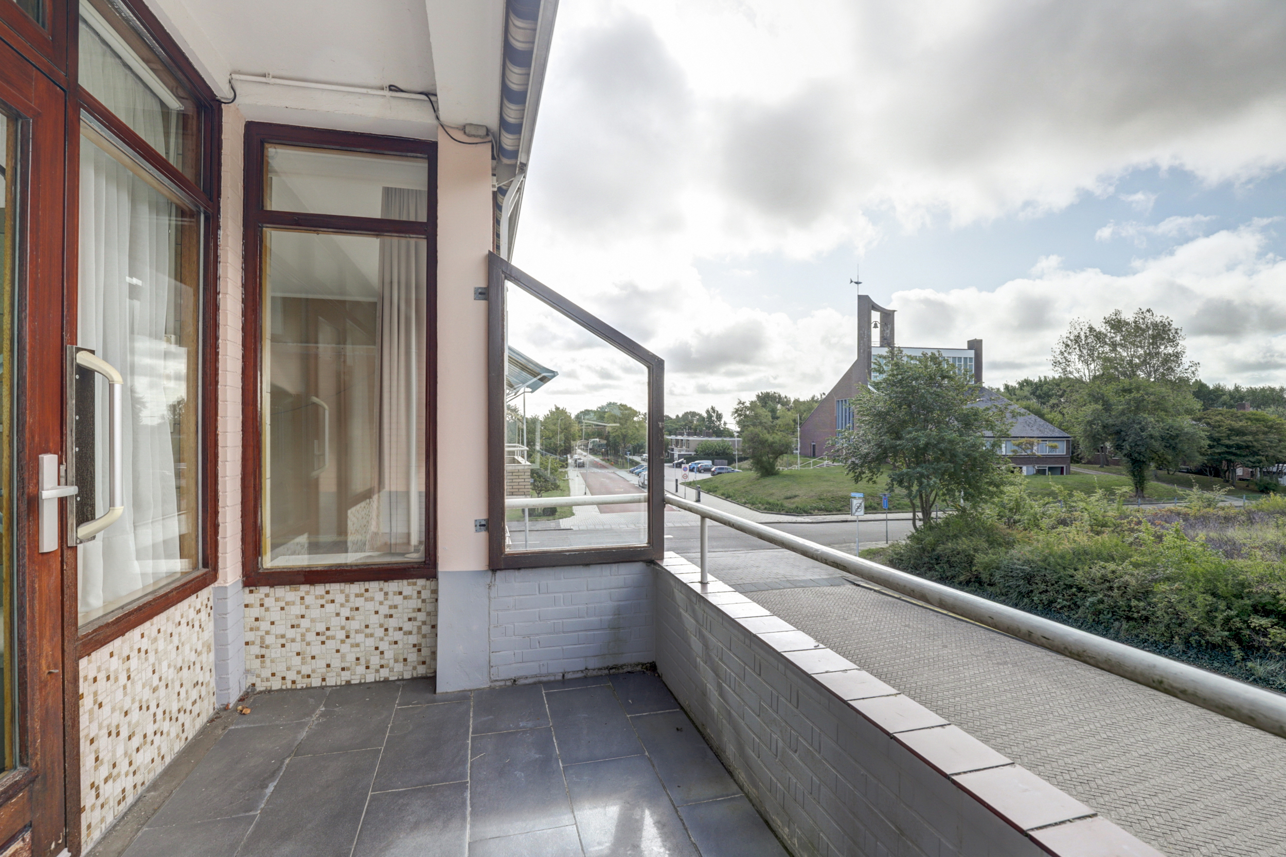 De woonverdieping bereikt u via de portiek (2de etage). Achter de blauwe voordeur komt u in de lichte entree met toegang tot alle vertrekken. De doorzonkamer strekt vrijwel de volledige breedte van de woning en heeft aan beide zijden grote ramen met houten kozijnen, waardoor u fraai uitkijkt op het groen. Bovendien beschikt de woonkamerzijde over een eigen balkon, waardoor u ook aan de voorzijde heerlijk buiten kunt zitten. In het midden staat een markante schouw/kolom bekleed met warme zandkleurige natuursteentegels. De kamer is voorzien van een doorlopende grijze vloerbedekking, radiatoren onder de ramen en inbouwkasten aan de kopse zijde, een sfeervolle basis om geheel naar uw smaak te moderniseren. Met wat creativiteit en oog voor detail kan hier een prachtig eigentijds woonhart ontstaan, de royale afmetingen en het vele licht bieden een heerlijke basis om mee te werken. De gesloten keuken is een heerlijke knipoog naar de jaren ’70: mosterdgele fronten met aluminium grepen, een betegelde achterwand met groen-oranje bloemmotief en een donkerbruine tegelvloer. Er is een ingebouwde gaskookplaat met afzuigkap en een oven, plus een groot raam boven het werkblad dat prettig licht en zicht naar buiten geeft! Aan de gang liggen een separate toiletruimte en de badkamer. De badkamer is neutraal wit betegeld met een grijze tegelvloer en is voorzien van een wastafel, spiegelkast, douche met opklapbare zitting en diverse steunbeugels. Aan de rustige achterzijde bevinden zich twee slaapkamers met toegang tot het andere balkon. Het balkon is afgewerkt met donkergrijze tegels, heeft een gemetselde borstwering met mozaïekplint en een metalen leuning. Vanuit hier kijkt u vrij weg richting de buurt en de nabijgelegen kerk.