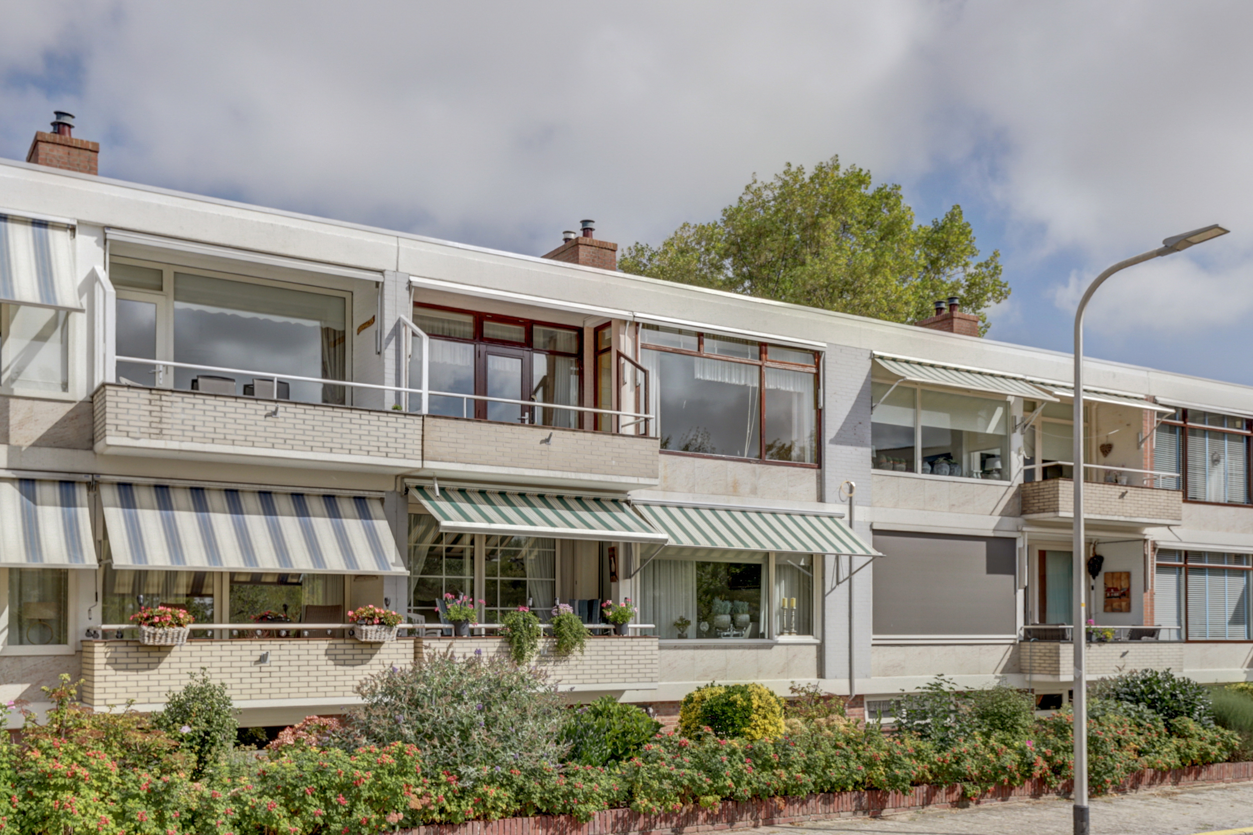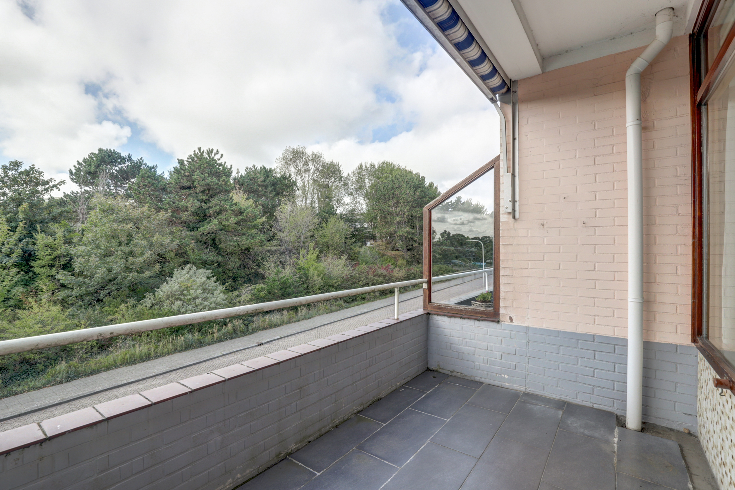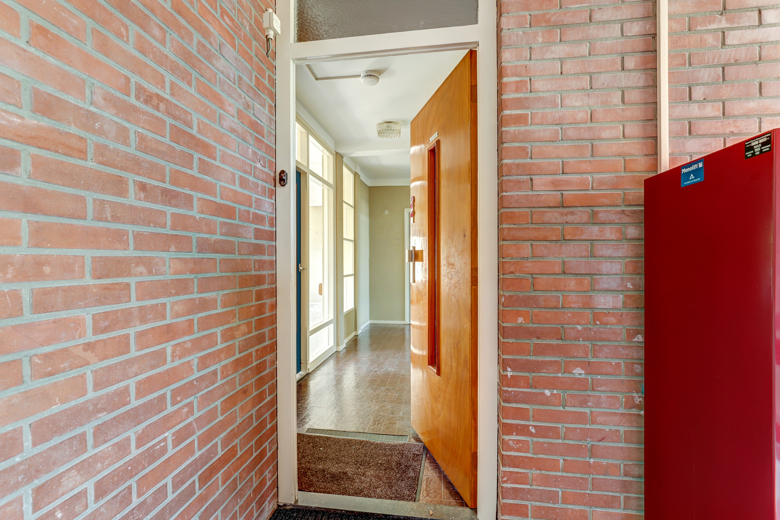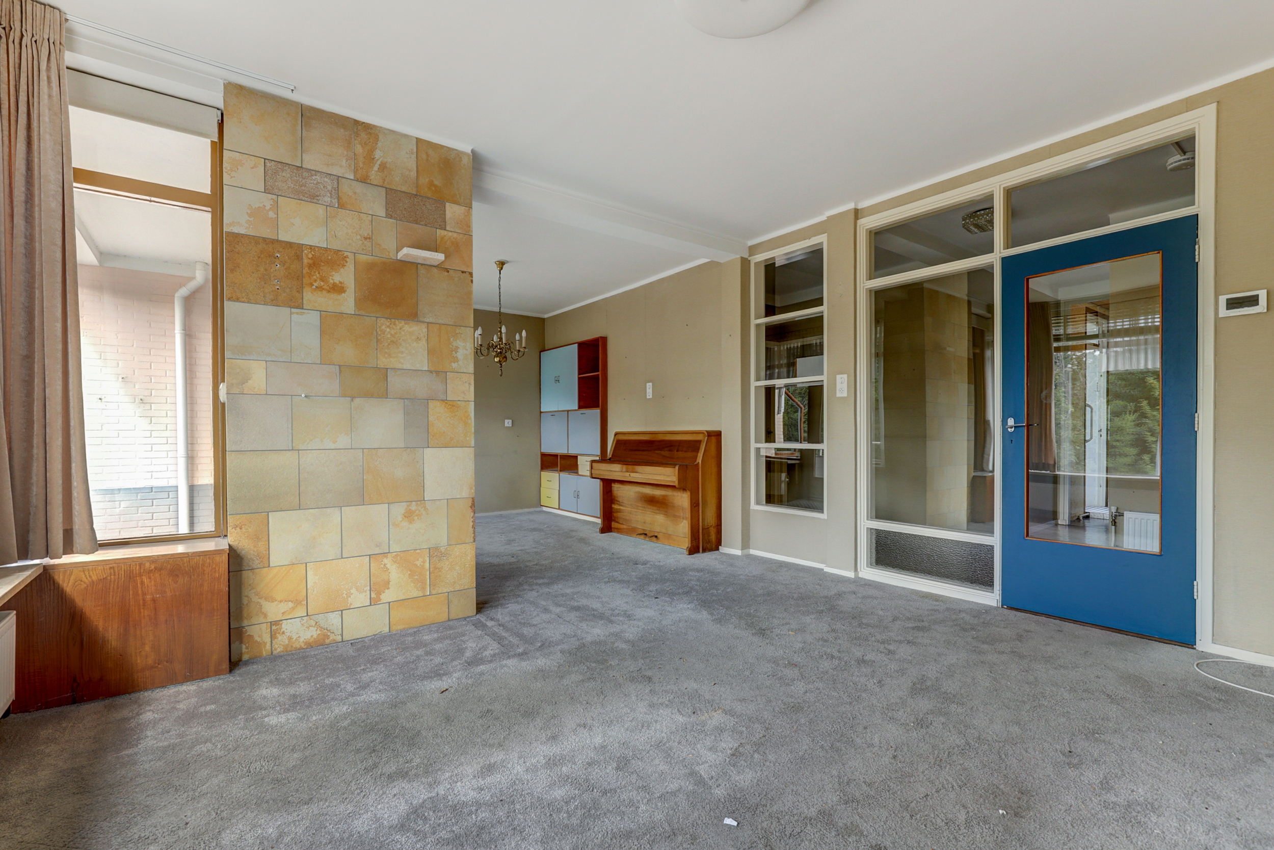 De woonverdieping bereikt u via de portiek (2de etage). Achter de blauwe voordeur komt u in de lichte entree met toegang tot alle vertrekken. De doorzonkamer strekt vrijwel de volledige breedte van de woning en heeft aan beide zijden grote ramen met houten kozijnen, waardoor u fraai uitkijkt op het groen. Bovendien beschikt de woonkamerzijde over een eigen balkon, waardoor u ook aan de voorzijde heerlijk buiten kunt zitten. In het midden staat een markante schouw/kolom bekleed met warme zandkleurige natuursteentegels. De kamer is voorzien van een doorlopende grijze vloerbedekking, radiatoren onder de ramen en inbouwkasten aan de kopse zijde, een sfeervolle basis om geheel naar uw smaak te moderniseren. Met wat creativiteit en oog voor detail kan hier een prachtig eigentijds woonhart ontstaan, de royale afmetingen en het vele licht bieden een heerlijke basis om mee te werken. De gesloten keuken is een heerlijke knipoog naar de jaren ’70: mosterdgele fronten met aluminium grepen, een betegelde achterwand met groen-oranje bloemmotief en een donkerbruine tegelvloer. Er is een ingebouwde gaskookplaat met afzuigkap en een oven, plus een groot raam boven het werkblad dat prettig licht en zicht naar buiten geeft! Aan de gang liggen een separate toiletruimte en de badkamer. De badkamer is neutraal wit betegeld met een grijze tegelvloer en is voorzien van een wastafel, spiegelkast, douche met opklapbare zitting en diverse steunbeugels. Aan de rustige achterzijde bevinden zich twee slaapkamers met toegang tot het andere balkon. Het balkon is afgewerkt met donkergrijze tegels, heeft een gemetselde borstwering met mozaïekplint en een metalen leuning. Vanuit hier kijkt u vrij weg richting de buurt en de nabijgelegen kerk.