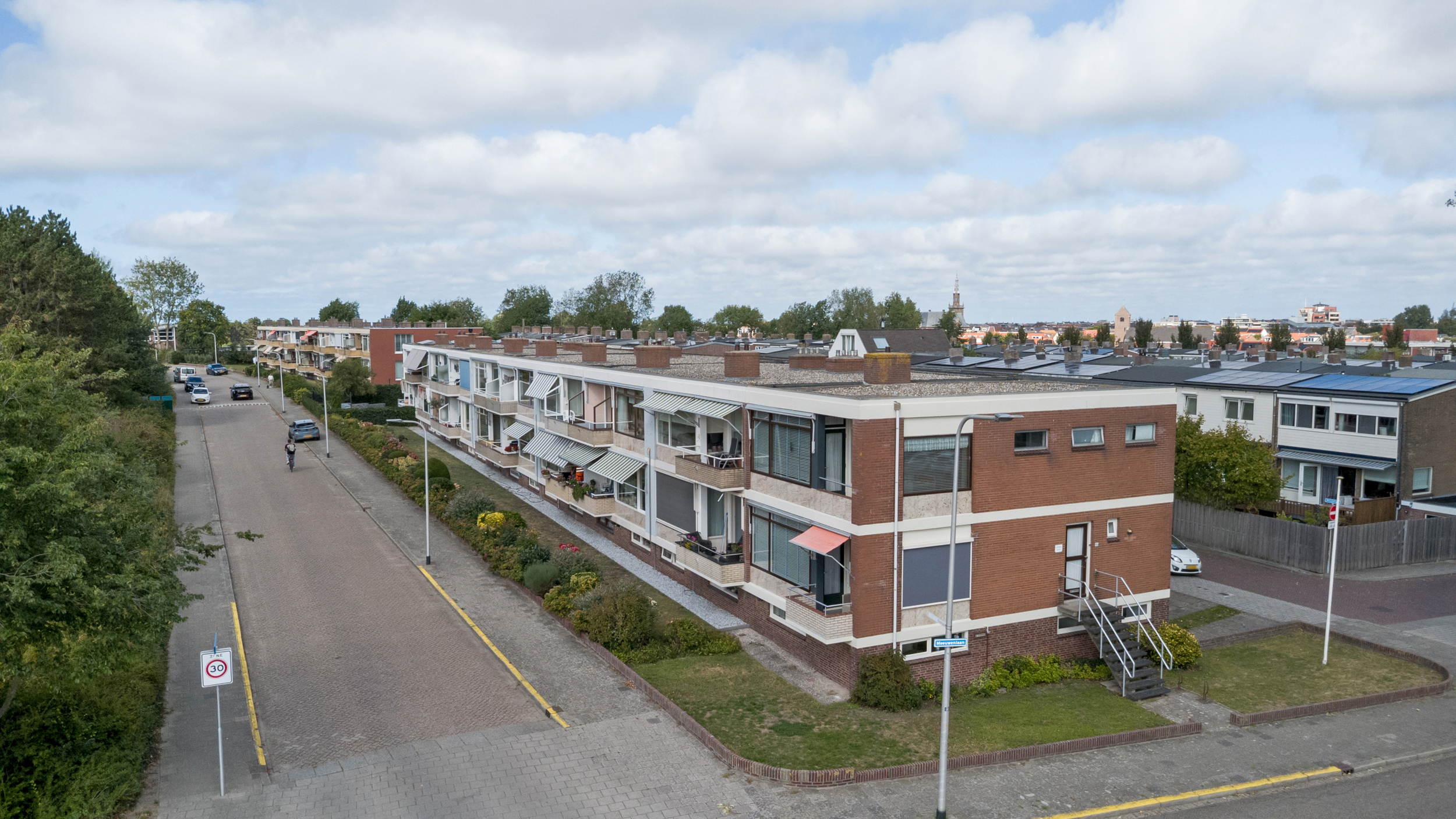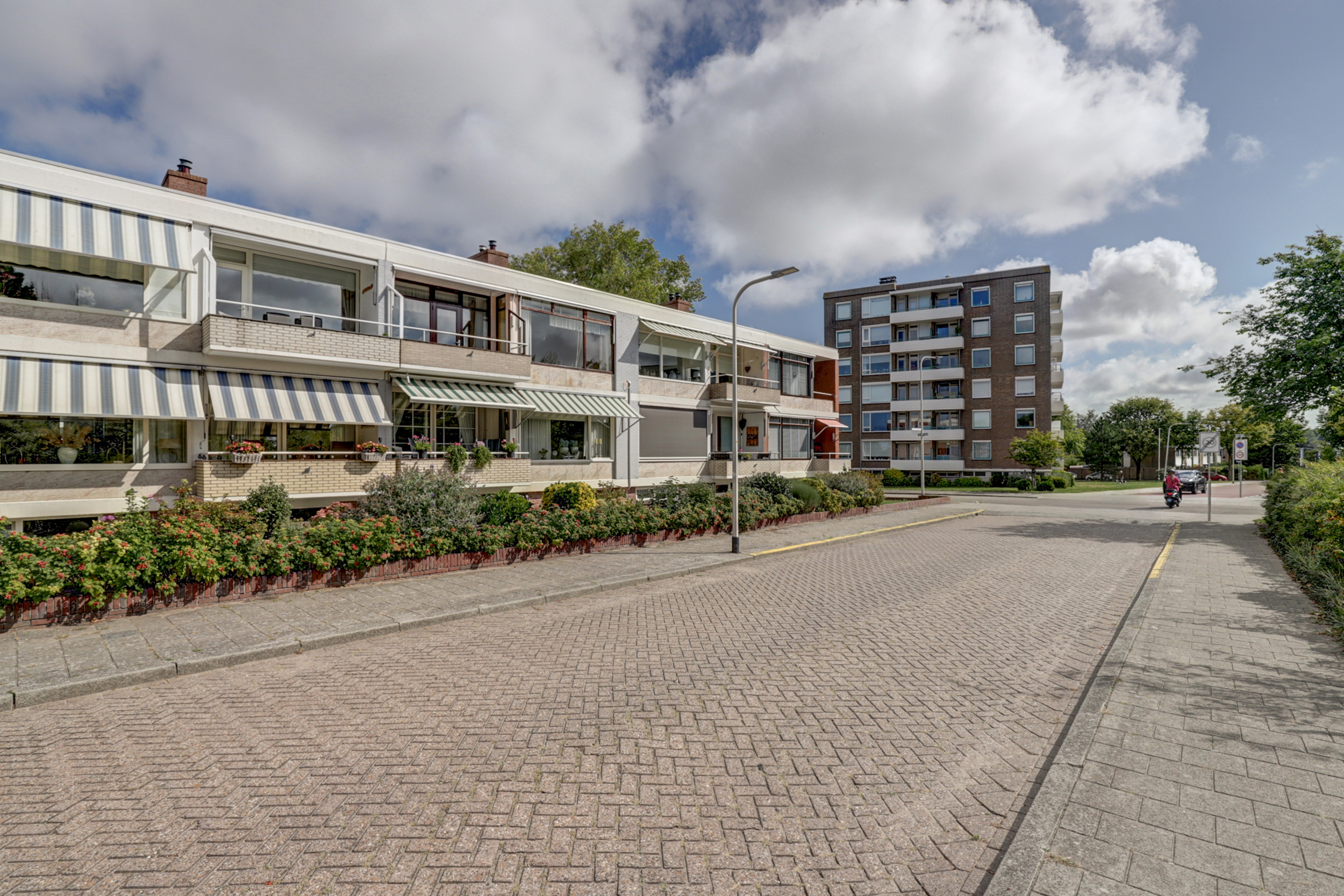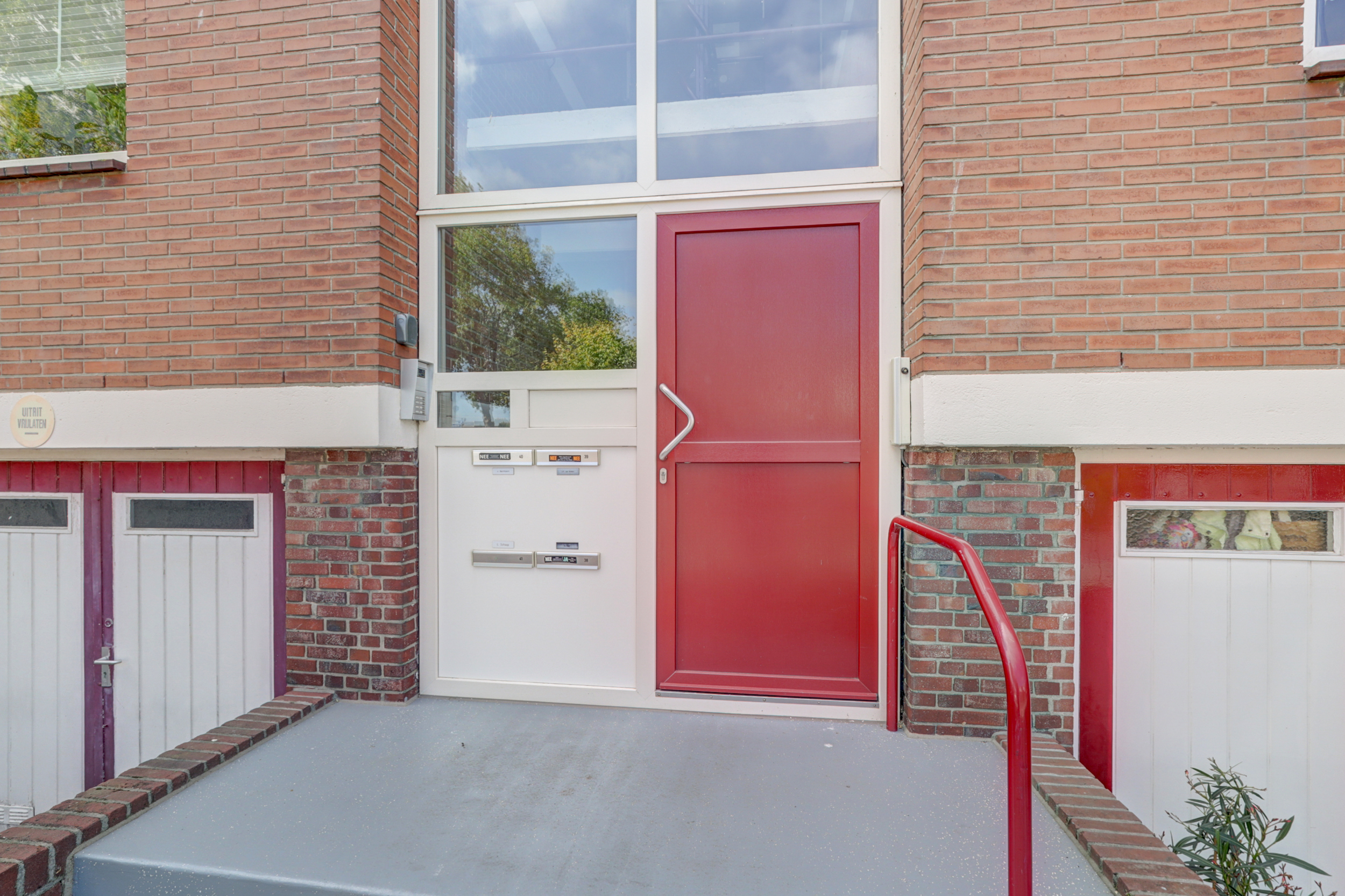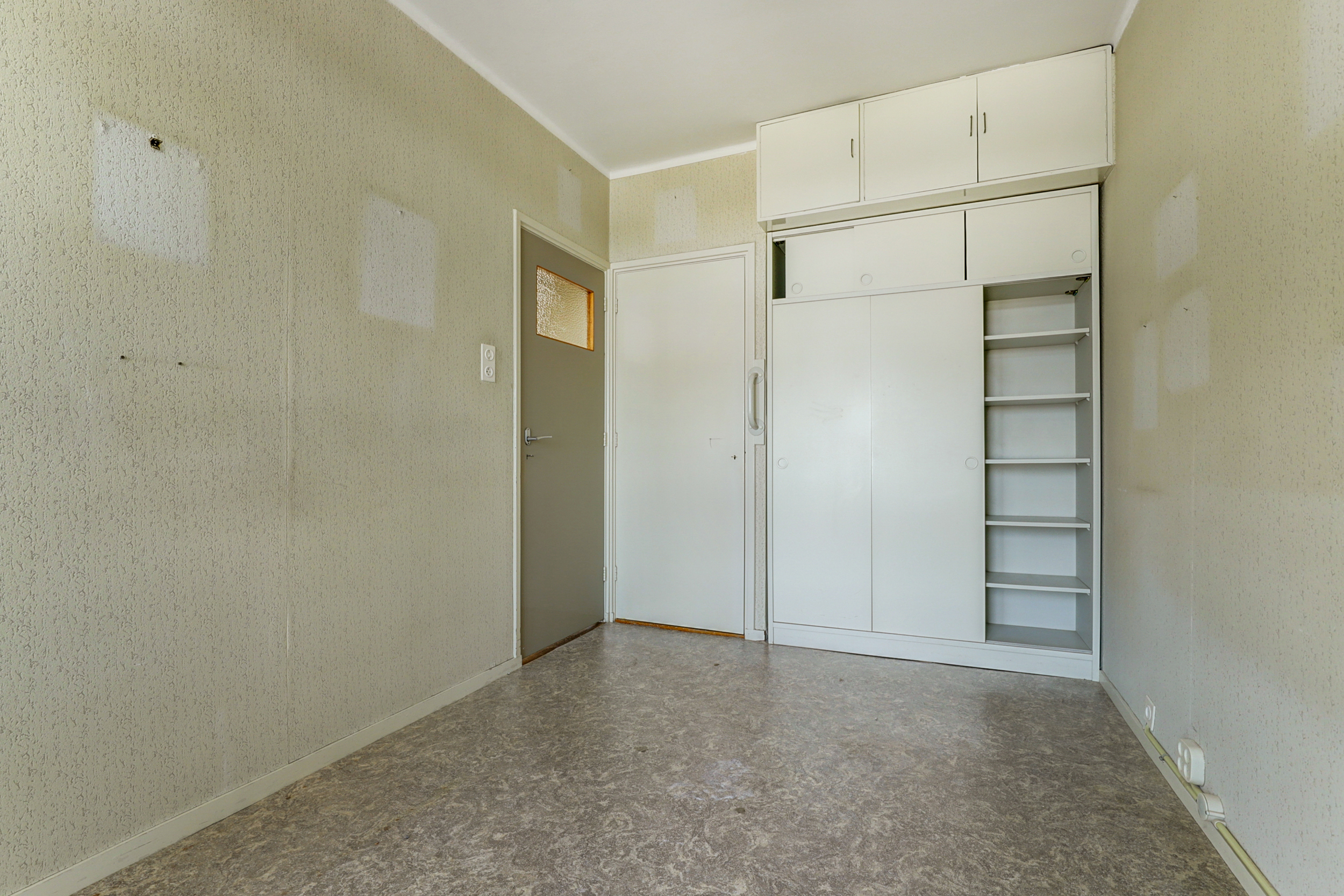 De woonverdieping bereikt u via de portiek (2de etage). Achter de blauwe voordeur komt u in de lichte entree met toegang tot alle vertrekken. De doorzonkamer strekt vrijwel de volledige breedte van de woning en heeft aan beide zijden grote ramen met houten kozijnen, waardoor u fraai uitkijkt op het groen. Bovendien beschikt de woonkamerzijde over een eigen balkon, waardoor u ook aan de voorzijde heerlijk buiten kunt zitten. In het midden staat een markante schouw/kolom bekleed met warme zandkleurige natuursteentegels. De kamer is voorzien van een doorlopende grijze vloerbedekking, radiatoren onder de ramen en inbouwkasten aan de kopse zijde, een sfeervolle basis om geheel naar uw smaak te moderniseren. Met wat creativiteit en oog voor detail kan hier een prachtig eigentijds woonhart ontstaan, de royale afmetingen en het vele licht bieden een heerlijke basis om mee te werken. De gesloten keuken is een heerlijke knipoog naar de jaren ’70: mosterdgele fronten met aluminium grepen, een betegelde achterwand met groen-oranje bloemmotief en een donkerbruine tegelvloer. Er is een ingebouwde gaskookplaat met afzuigkap en een oven, plus een groot raam boven het werkblad dat prettig licht en zicht naar buiten geeft! Aan de gang liggen een separate toiletruimte en de badkamer. De badkamer is neutraal wit betegeld met een grijze tegelvloer en is voorzien van een wastafel, spiegelkast, douche met opklapbare zitting en diverse steunbeugels. Aan de rustige achterzijde bevinden zich twee slaapkamers met toegang tot het andere balkon. Het balkon is afgewerkt met donkergrijze tegels, heeft een gemetselde borstwering met mozaïekplint en een metalen leuning. Vanuit hier kijkt u vrij weg richting de buurt en de nabijgelegen kerk.