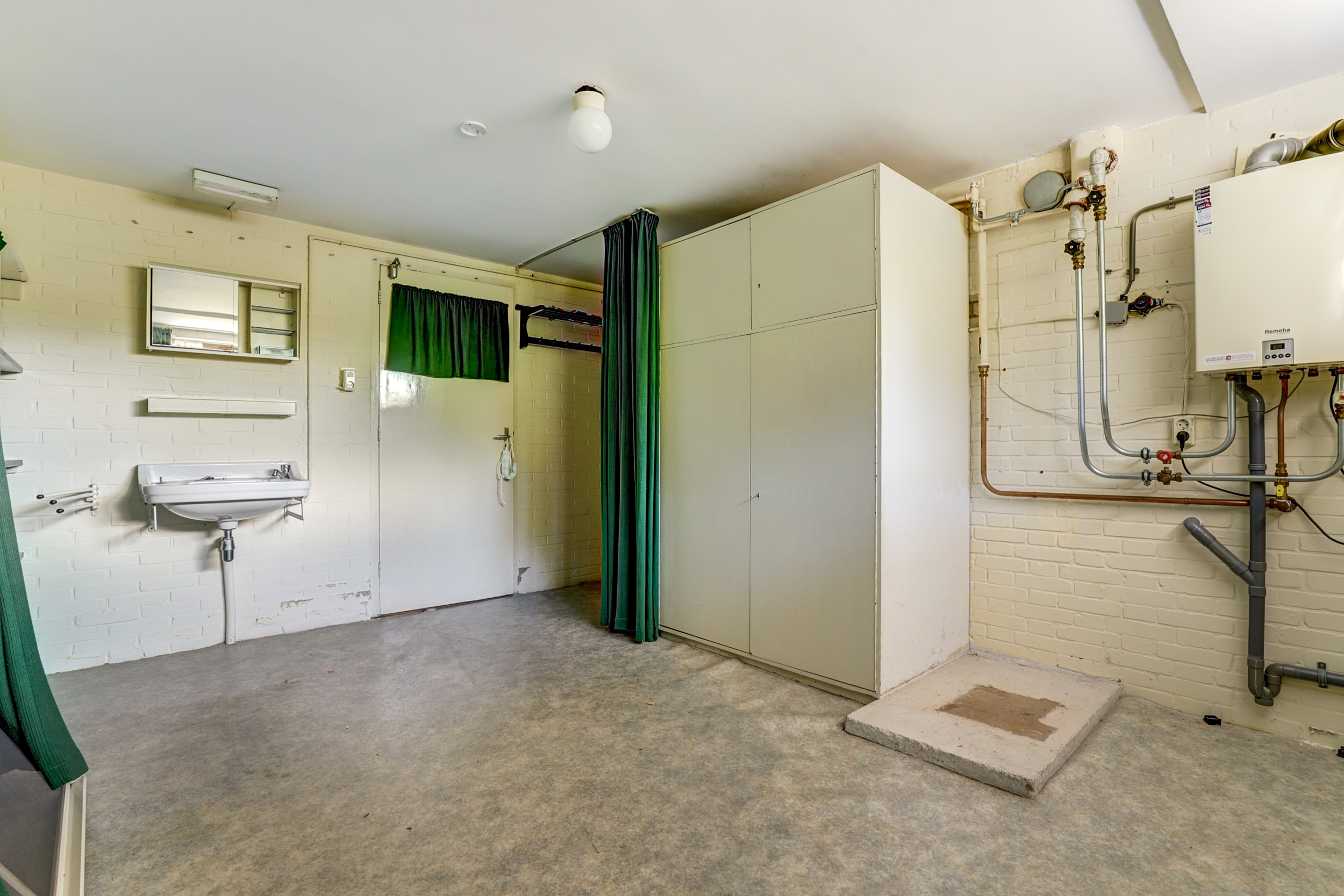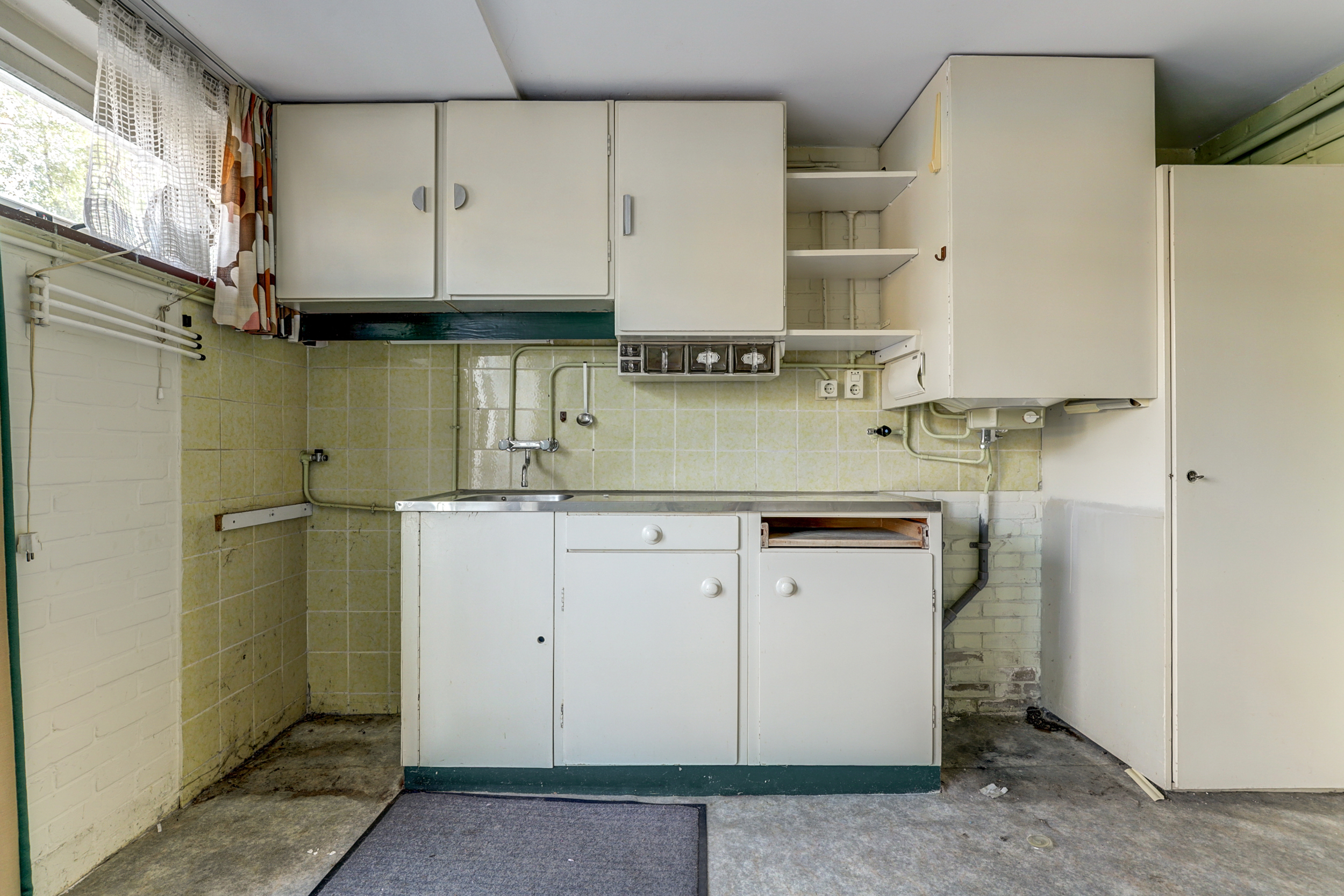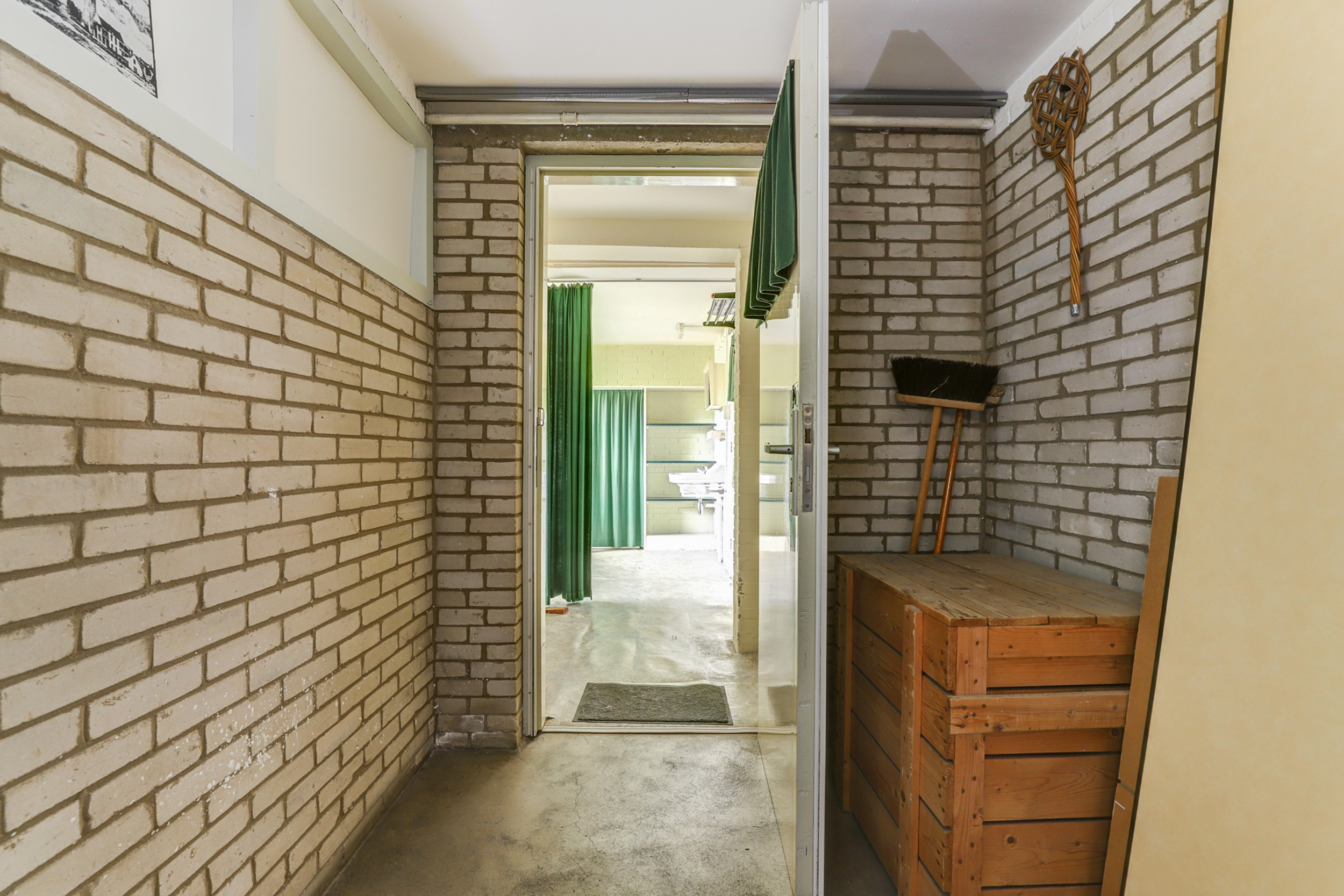 Via de deur op straatniveau bereikt u de ruime souterrain laag. Hier ligt een multifunctionele ruimte met veel kastruimte en daglicht via de hoge ramen aan de voorzijde. De wanden zijn (gedeeltelijk) in lichtgroene baksteen uitgevoerd, de vloer is afgewerkt met grijs zeil en er hangen praktische Tl-armaturen. Aan de gevelzijde is een eenvoudige pantry geplaatst met witte fronten, ronde knoppen, een rvs-werkblad en lichtgele wandtegels. Deze laag vraagt duidelijk om modernisering: een toekomstige eigenaar kan hier met een eigentijdse afwerking en nieuwe materialen een prachtige werk-/hobbyruimte, atelier of extra woon-/speelruimte creëren. U treft hier ook diverse aansluitingen en een extra spoelbak. Op deze laag bevindt zich bovendien een separaat halletje met meterkast, een vaste kast met cv-opstelling en een toiletruimte.