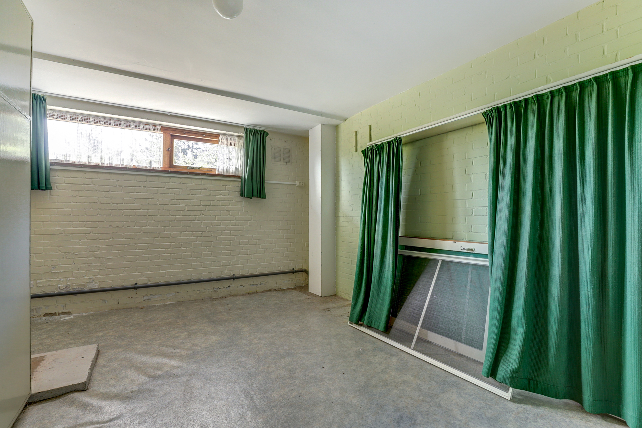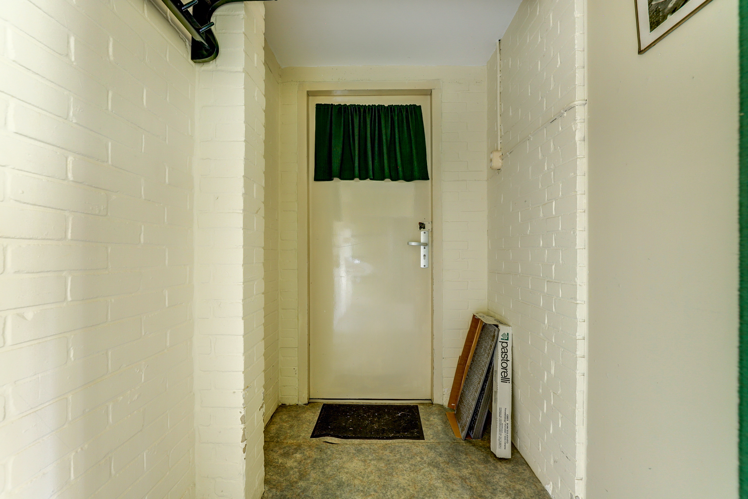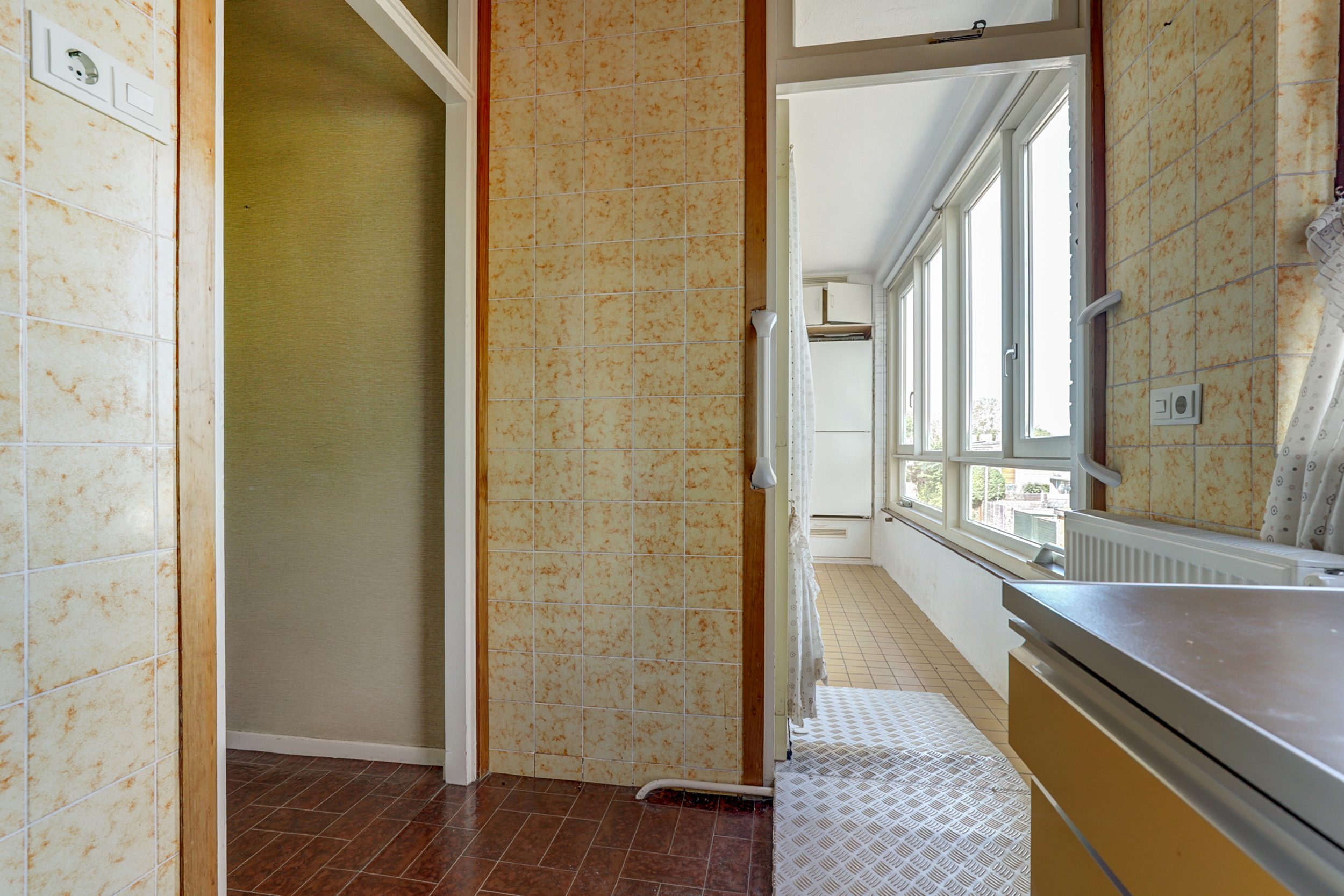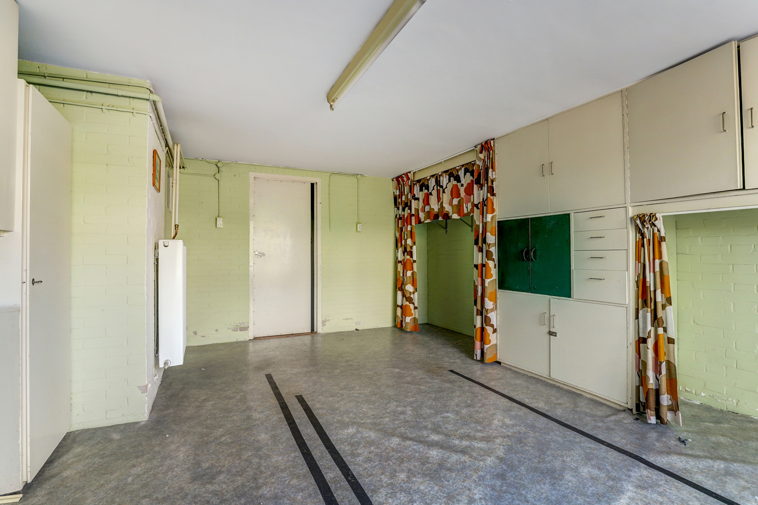 Via de deur op straatniveau bereikt u de ruime souterrain laag. Hier ligt een multifunctionele ruimte met veel kastruimte en daglicht via de hoge ramen aan de voorzijde. De wanden zijn (gedeeltelijk) in lichtgroene baksteen uitgevoerd, de vloer is afgewerkt met grijs zeil en er hangen praktische Tl-armaturen. Aan de gevelzijde is een eenvoudige pantry geplaatst met witte fronten, ronde knoppen, een rvs-werkblad en lichtgele wandtegels. Deze laag vraagt duidelijk om modernisering: een toekomstige eigenaar kan hier met een eigentijdse afwerking en nieuwe materialen een prachtige werk-/hobbyruimte, atelier of extra woon-/speelruimte creëren. U treft hier ook diverse aansluitingen en een extra spoelbak. Op deze laag bevindt zich bovendien een separaat halletje met meterkast, een vaste kast met cv-opstelling en een toiletruimte.