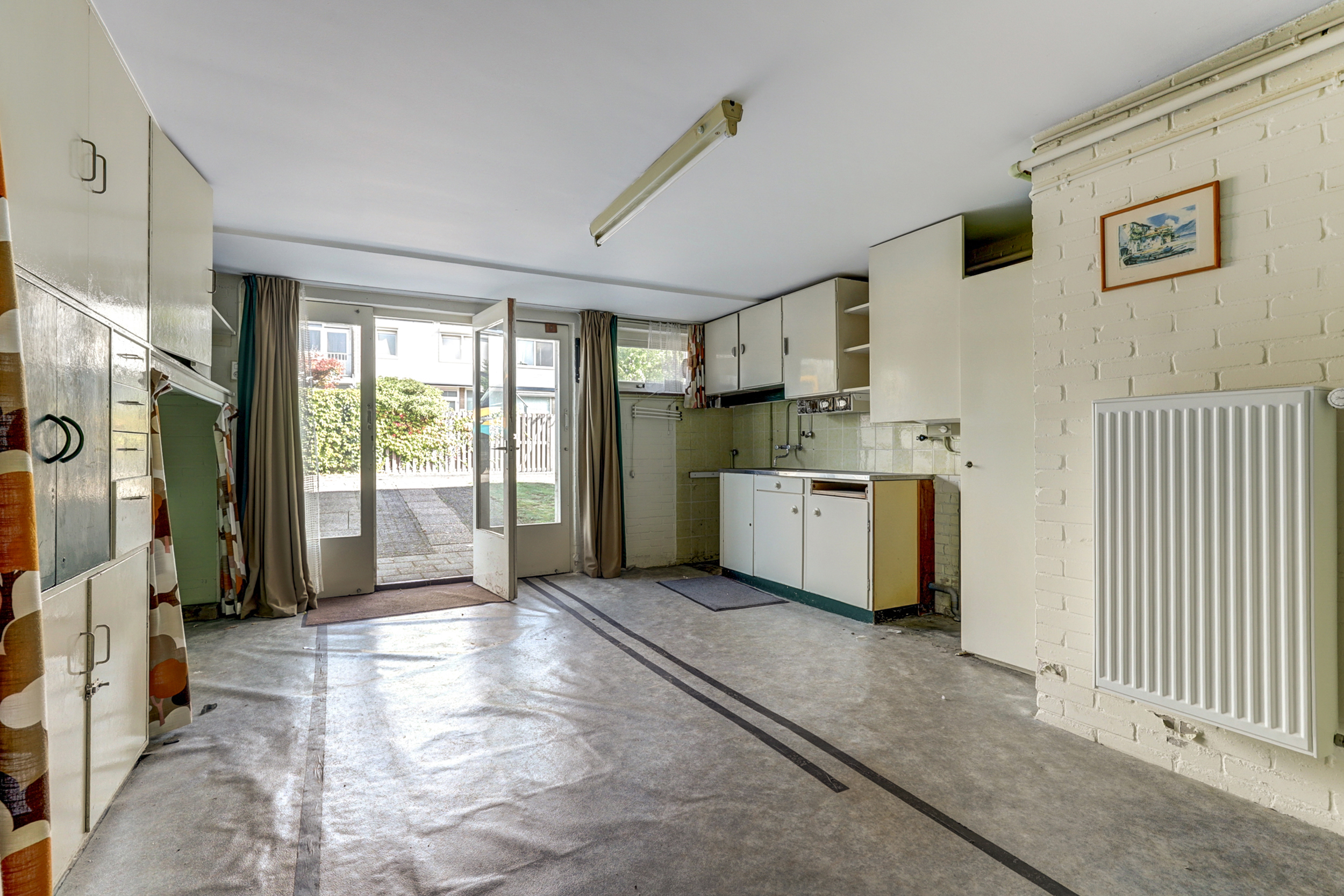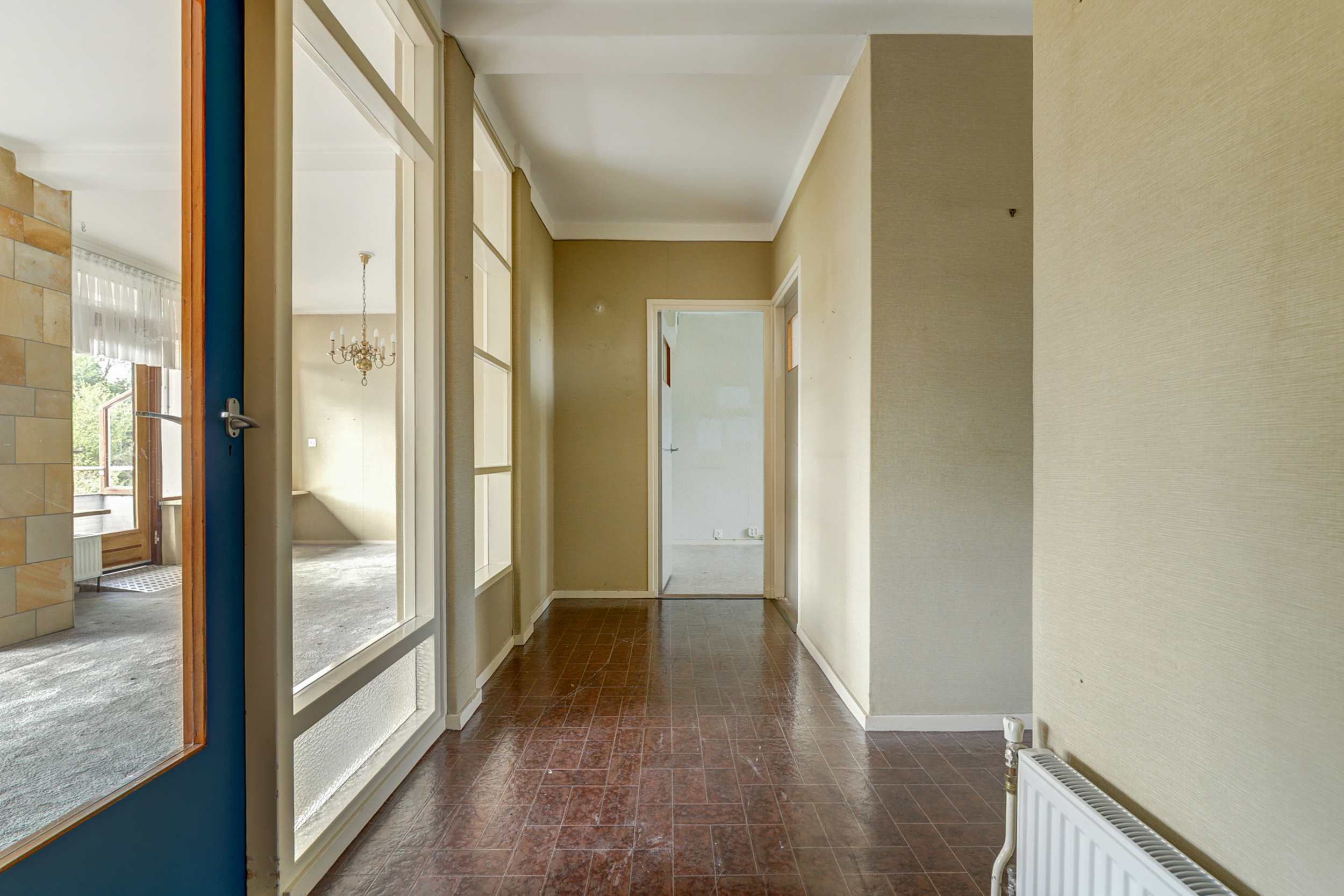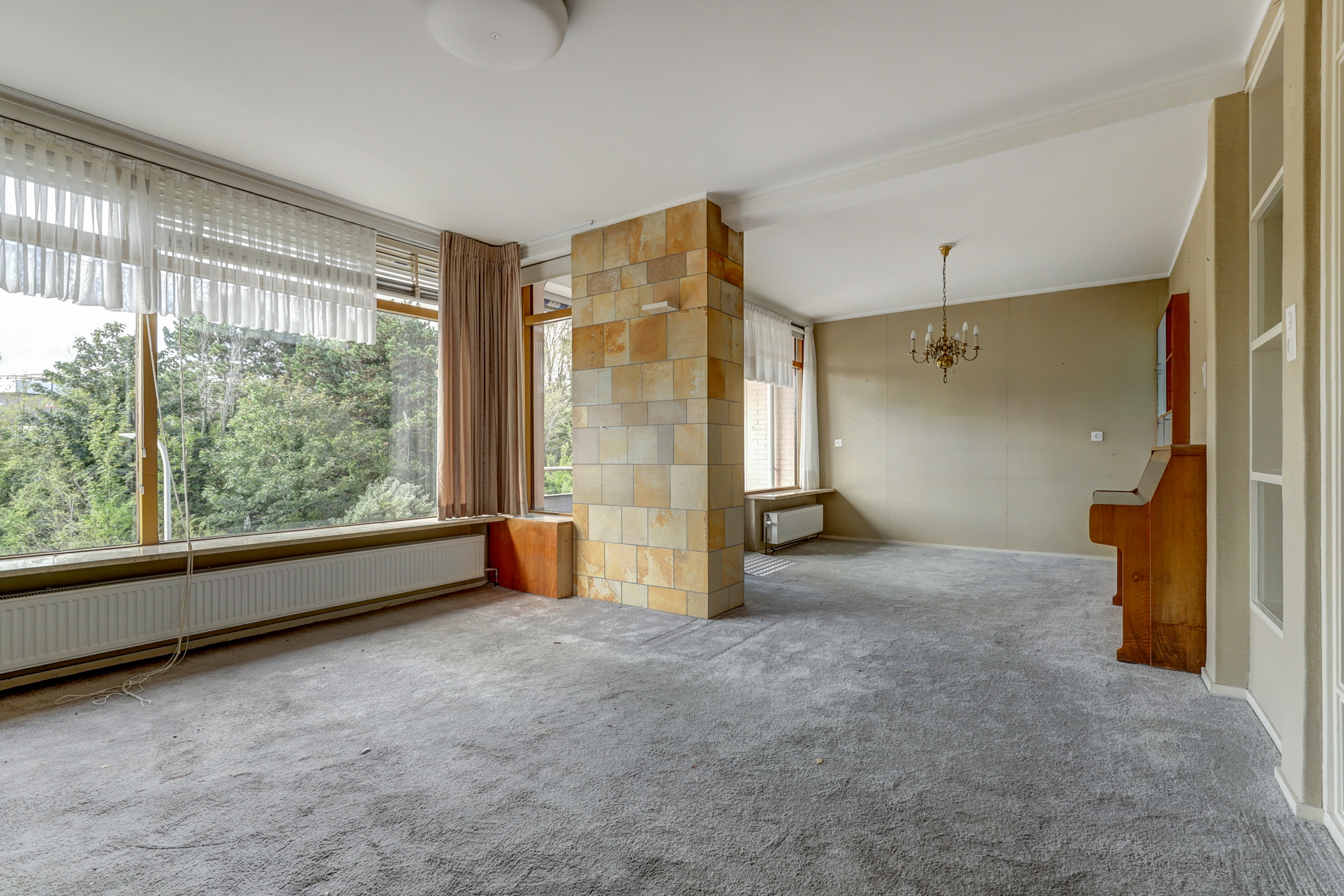 • Houten kozijnen, grote raampartijen en radiatoren onder de ramen.
