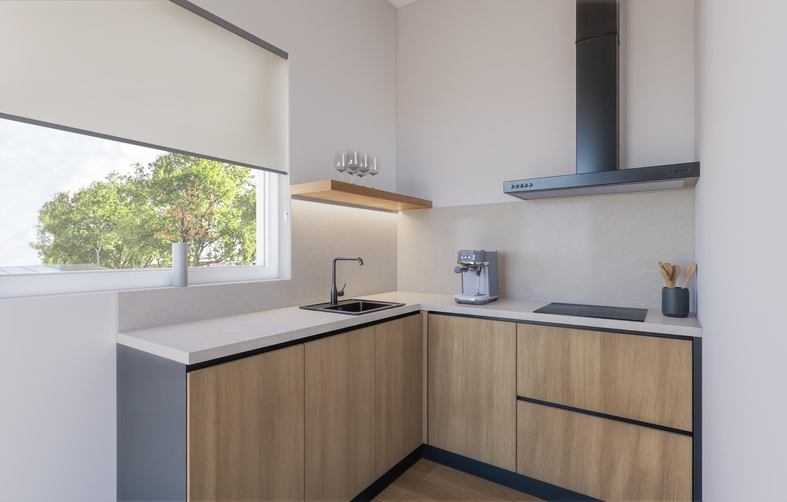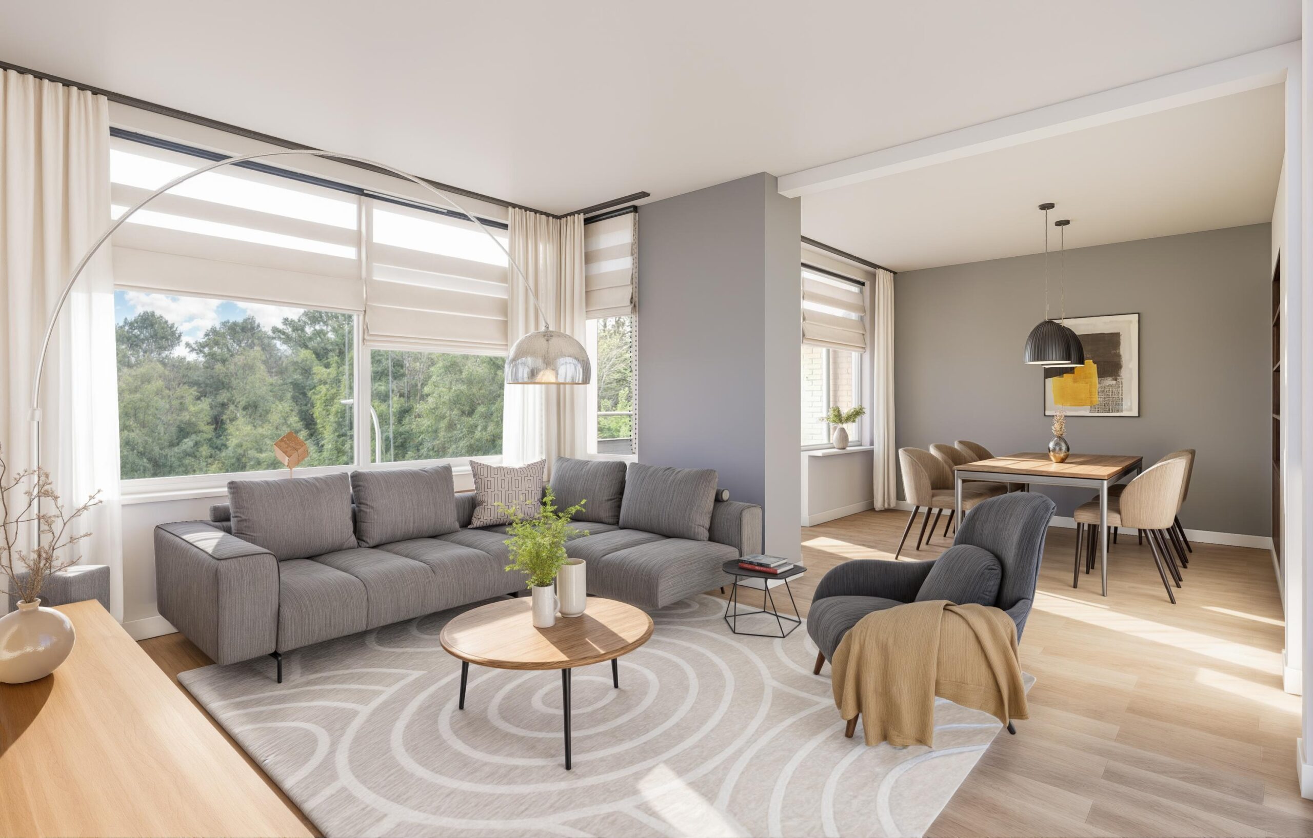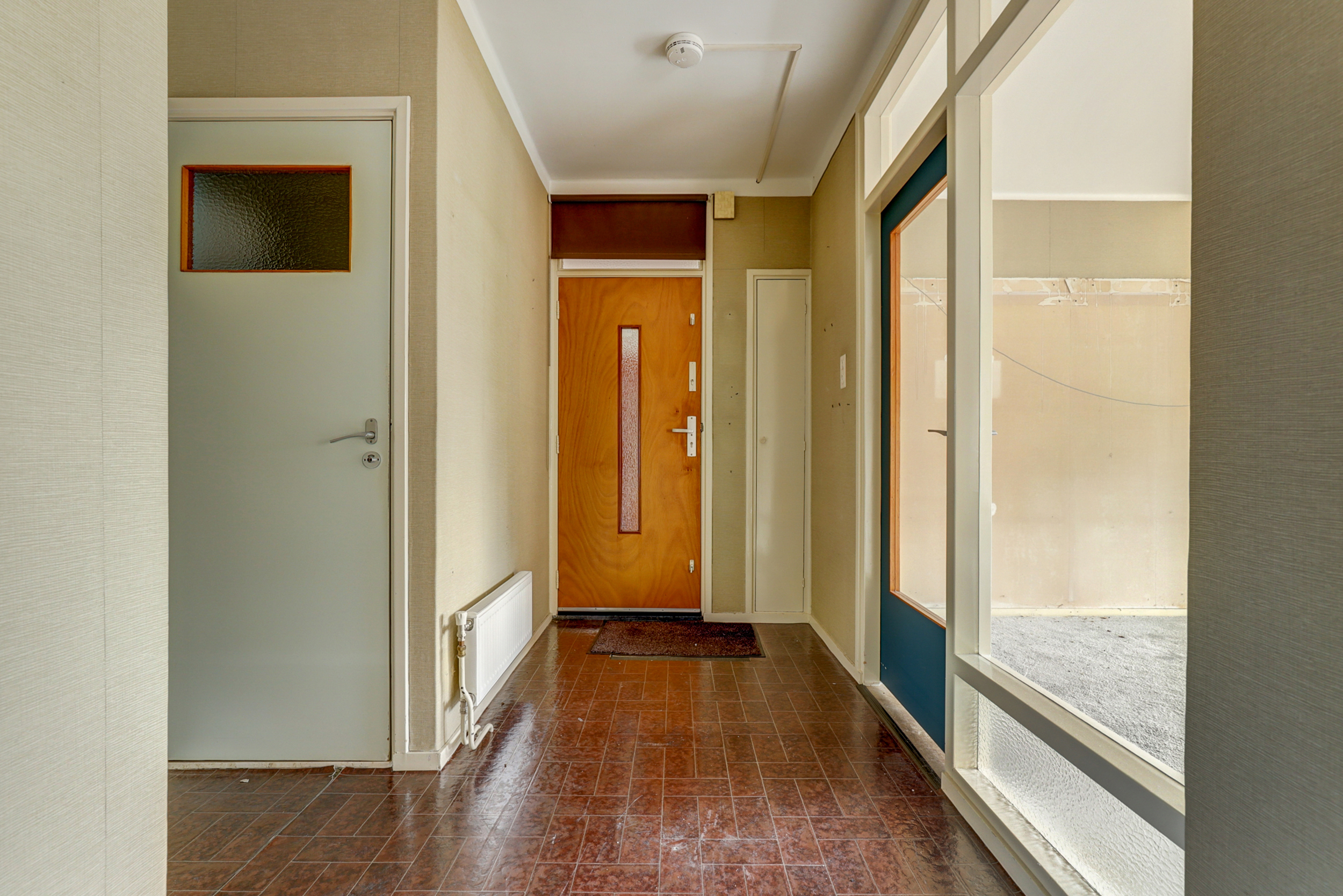 • Houten kozijnen, grote raampartijen en radiatoren onder de ramen.