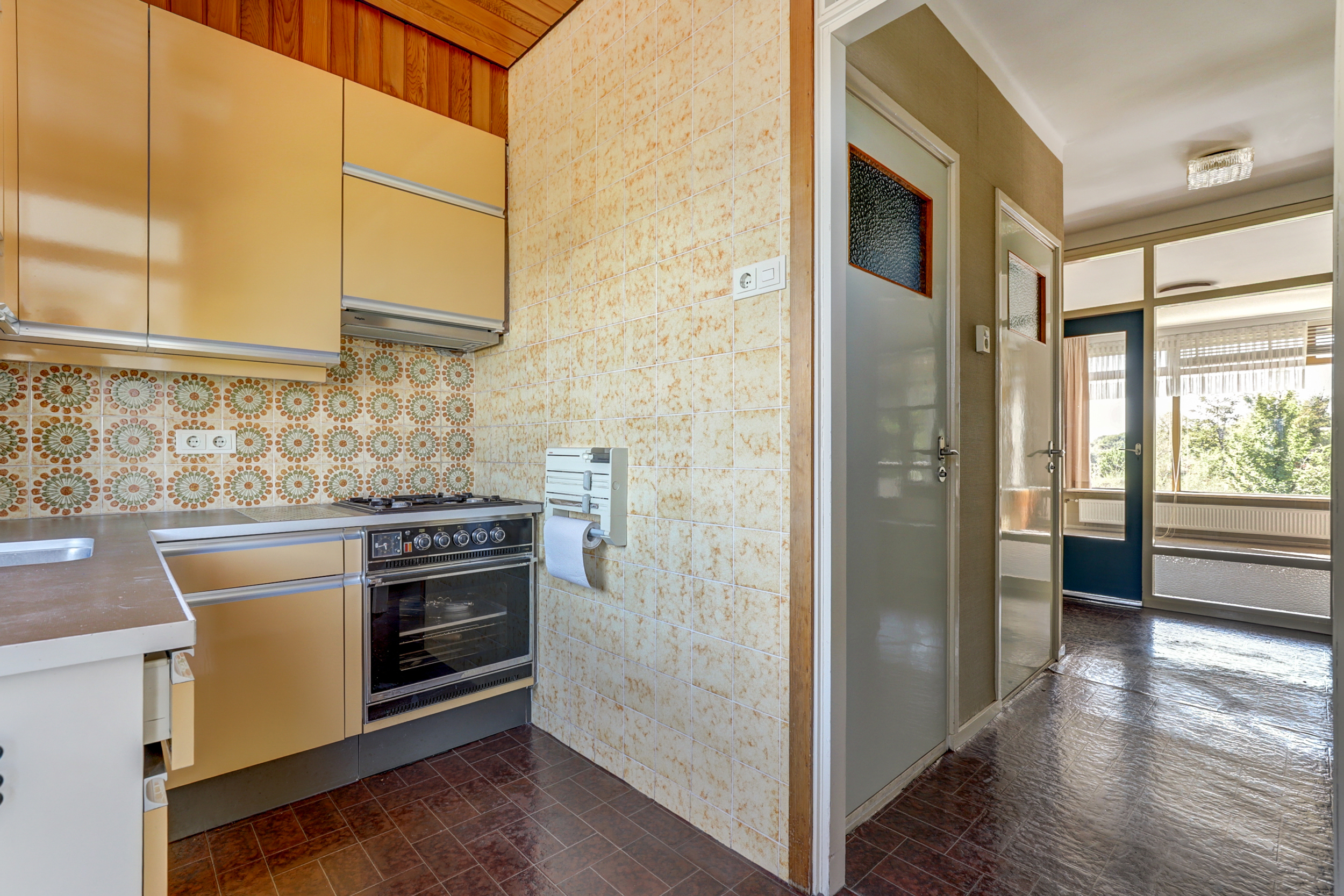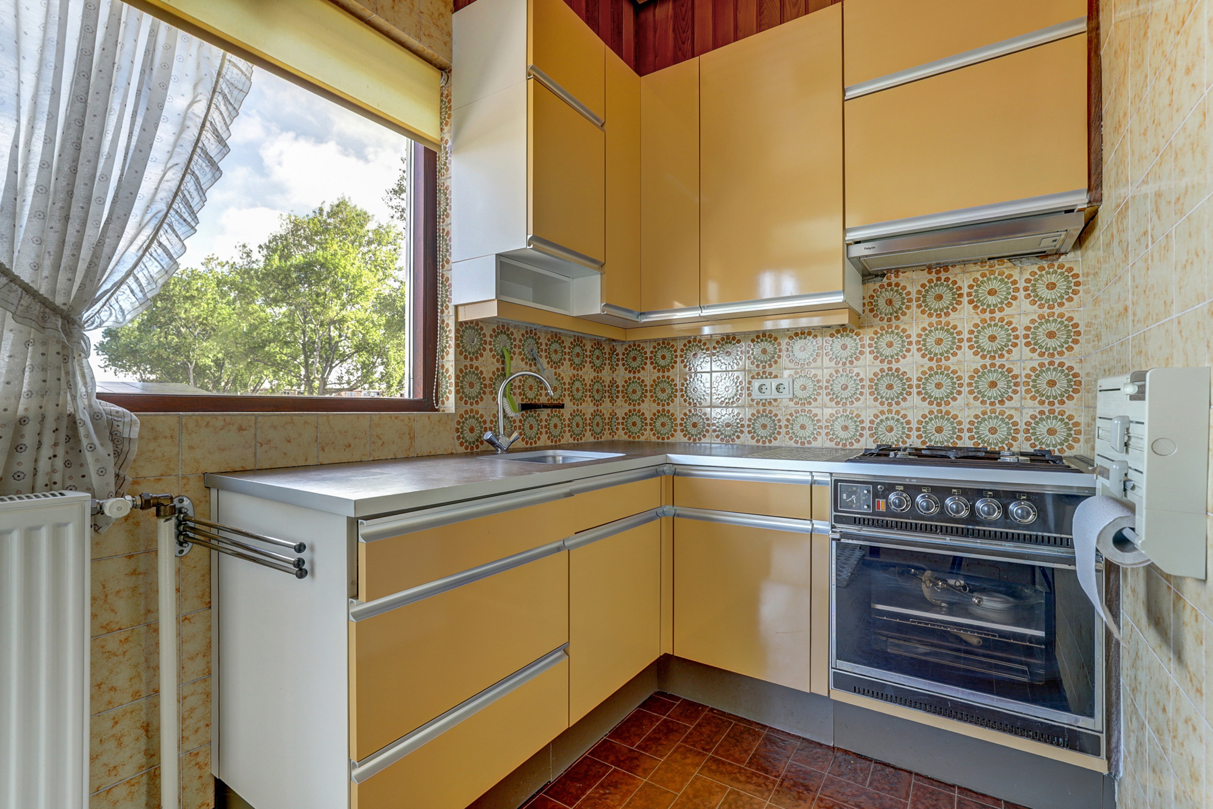 • Keuken met originele mosterdgele kasten en retro wandtegels.
