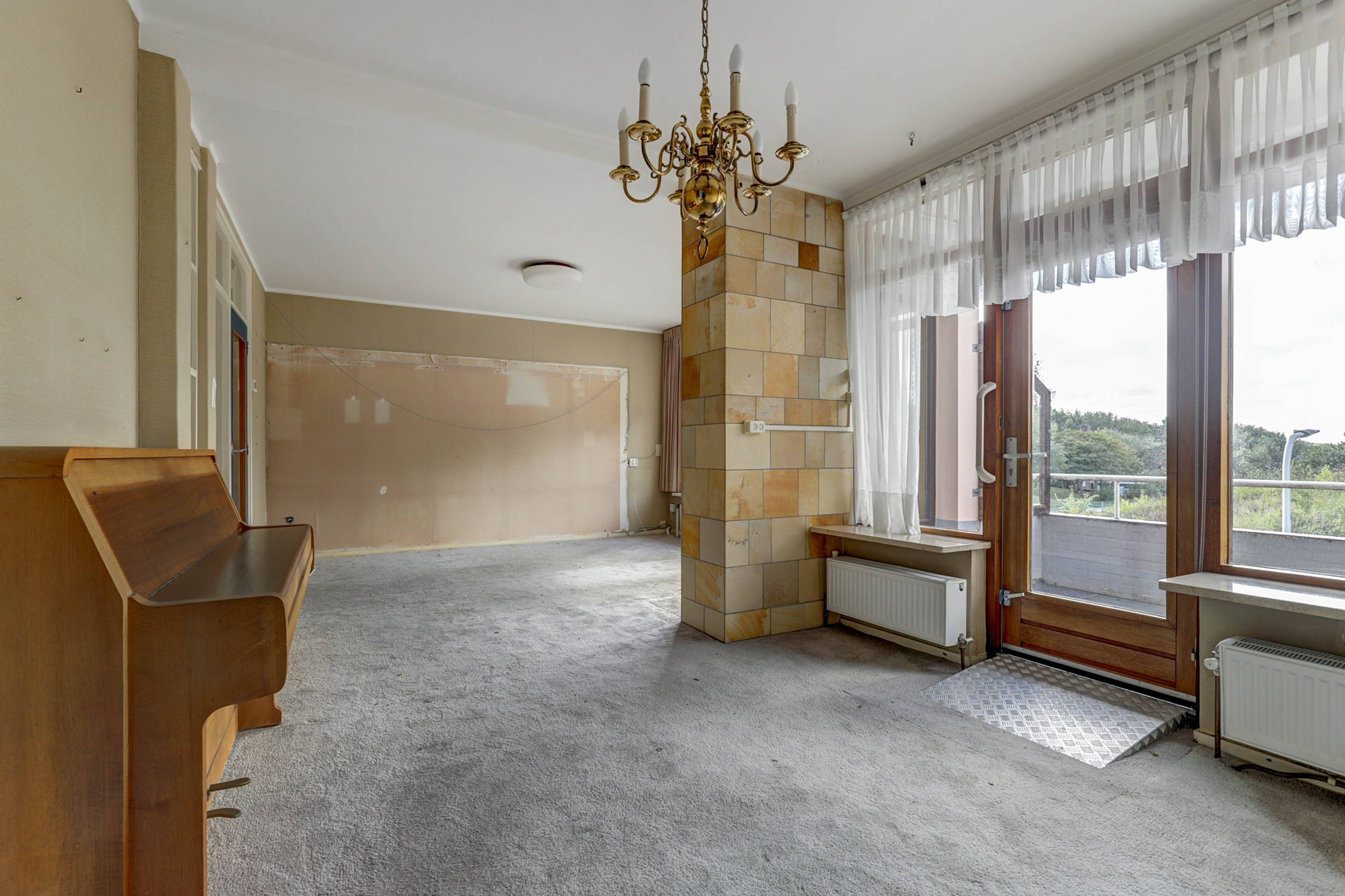 • Brede, lichte living met karakteristieke natuursteen schouw/kolom.