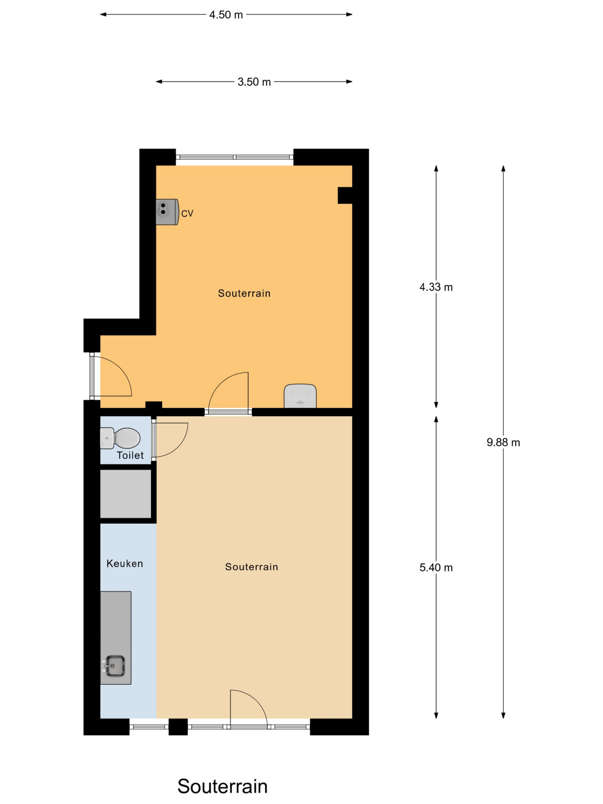 Via de deur op straatniveau bereikt u de ruime souterrain laag. Hier ligt een multifunctionele ruimte met veel kastruimte en daglicht via de hoge ramen aan de voorzijde. De wanden zijn (gedeeltelijk) in lichtgroene baksteen uitgevoerd, de vloer is afgewerkt met grijs zeil en er hangen praktische Tl-armaturen. Aan de gevelzijde is een eenvoudige pantry geplaatst met witte fronten, ronde knoppen, een rvs-werkblad en lichtgele wandtegels. Deze laag vraagt duidelijk om modernisering: een toekomstige eigenaar kan hier met een eigentijdse afwerking en nieuwe materialen een prachtige werk-/hobbyruimte, atelier of extra woon-/speelruimte creëren. U treft hier ook diverse aansluitingen en een extra spoelbak. Op deze laag bevindt zich bovendien een separaat halletje met meterkast, een vaste kast met cv-opstelling en een toiletruimte.