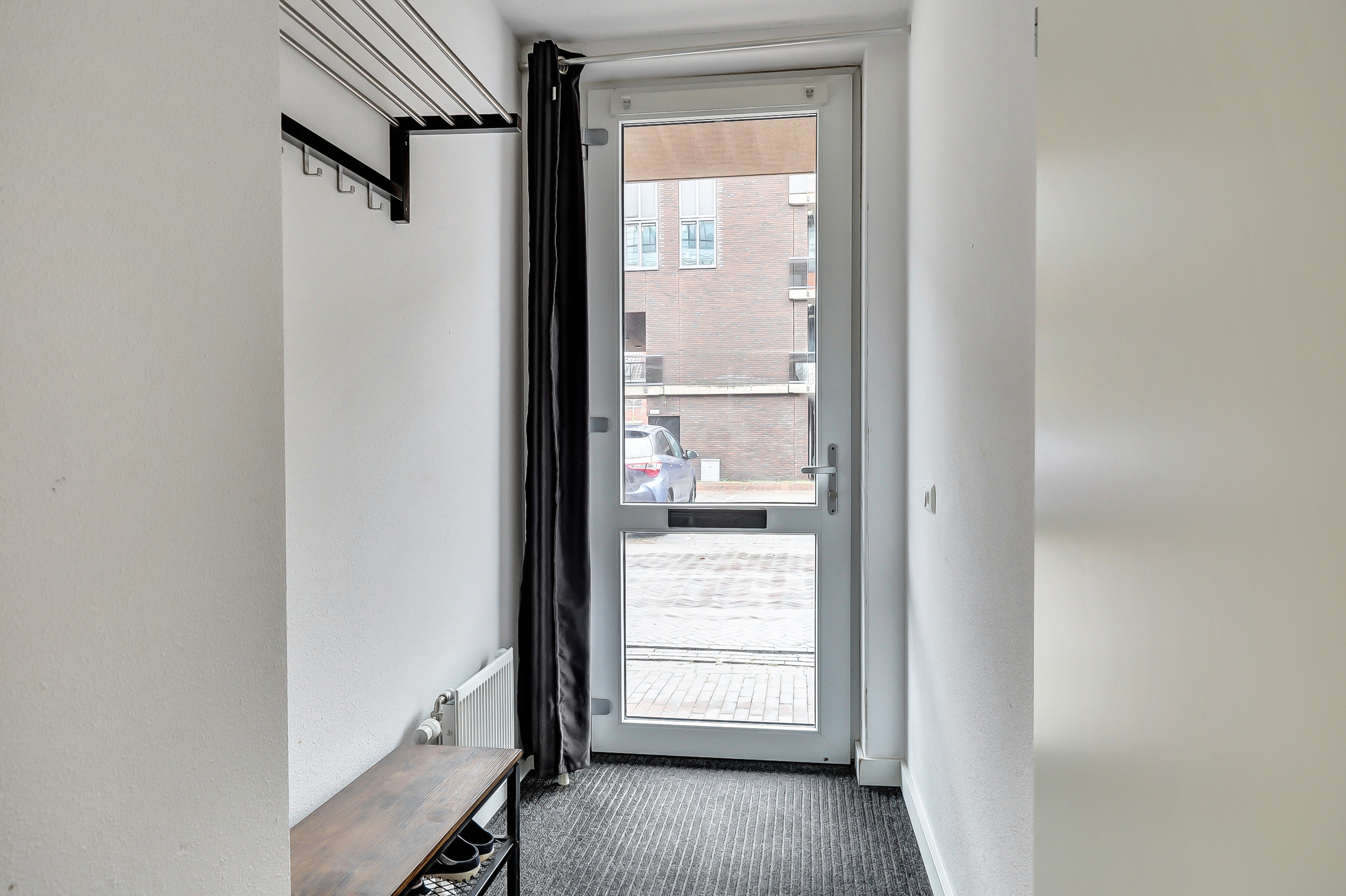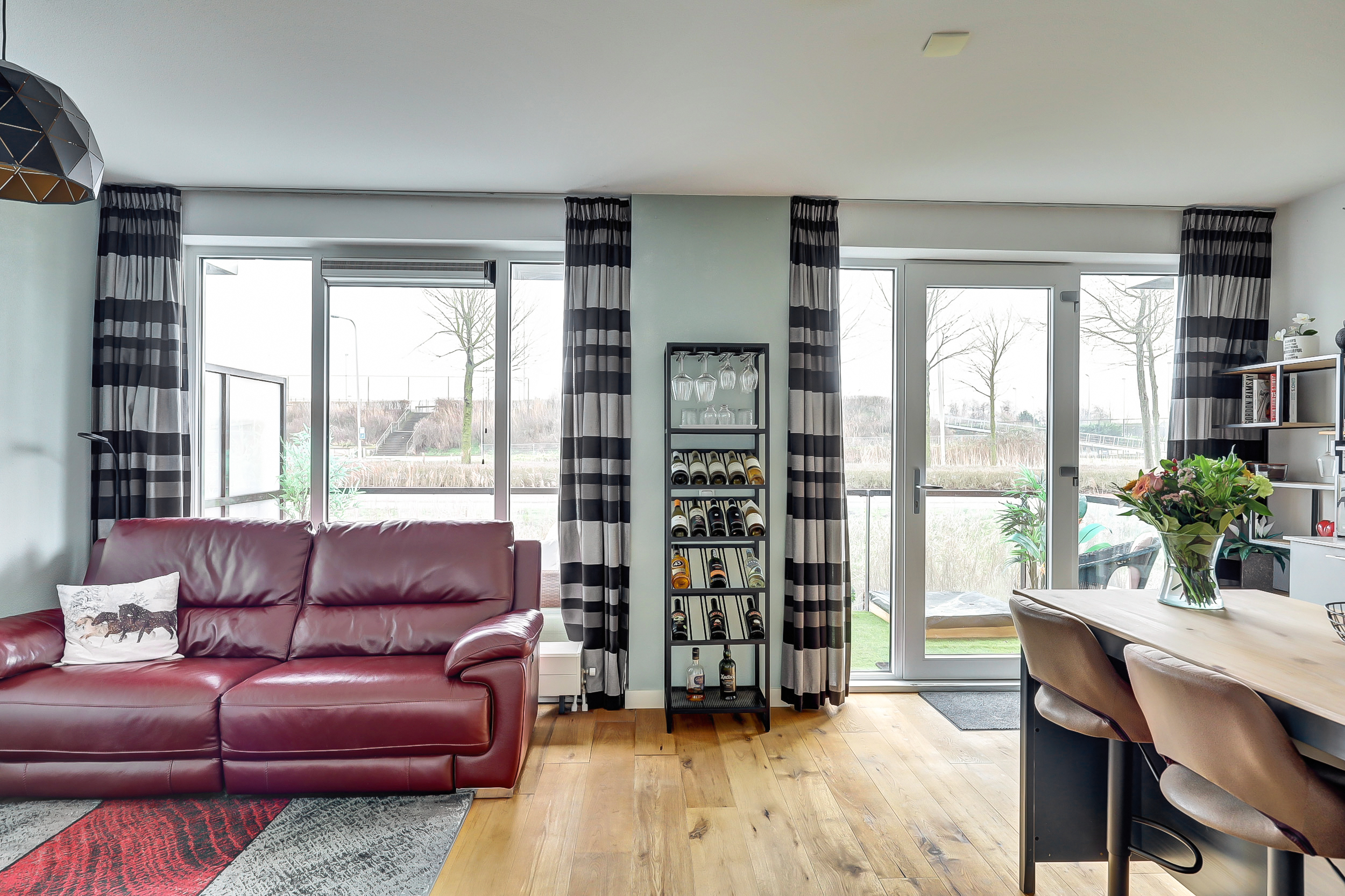 Tevens bevindt zich op de begane grond de entree van de woning. Via de entree kom je in de centrale hal van het appartement, die toegang biedt tot vrijwel alle vertrekken inclusief de meterkast. De woonkamer is ruim en licht, met grote raampartijen en een prettige indeling waardoor er voldoende plaats is voor zowel een comfortabele zithoek als een eethoek. De rustige wandafwerking en de warme houten vloer zorgen voor een aangename sfeer.