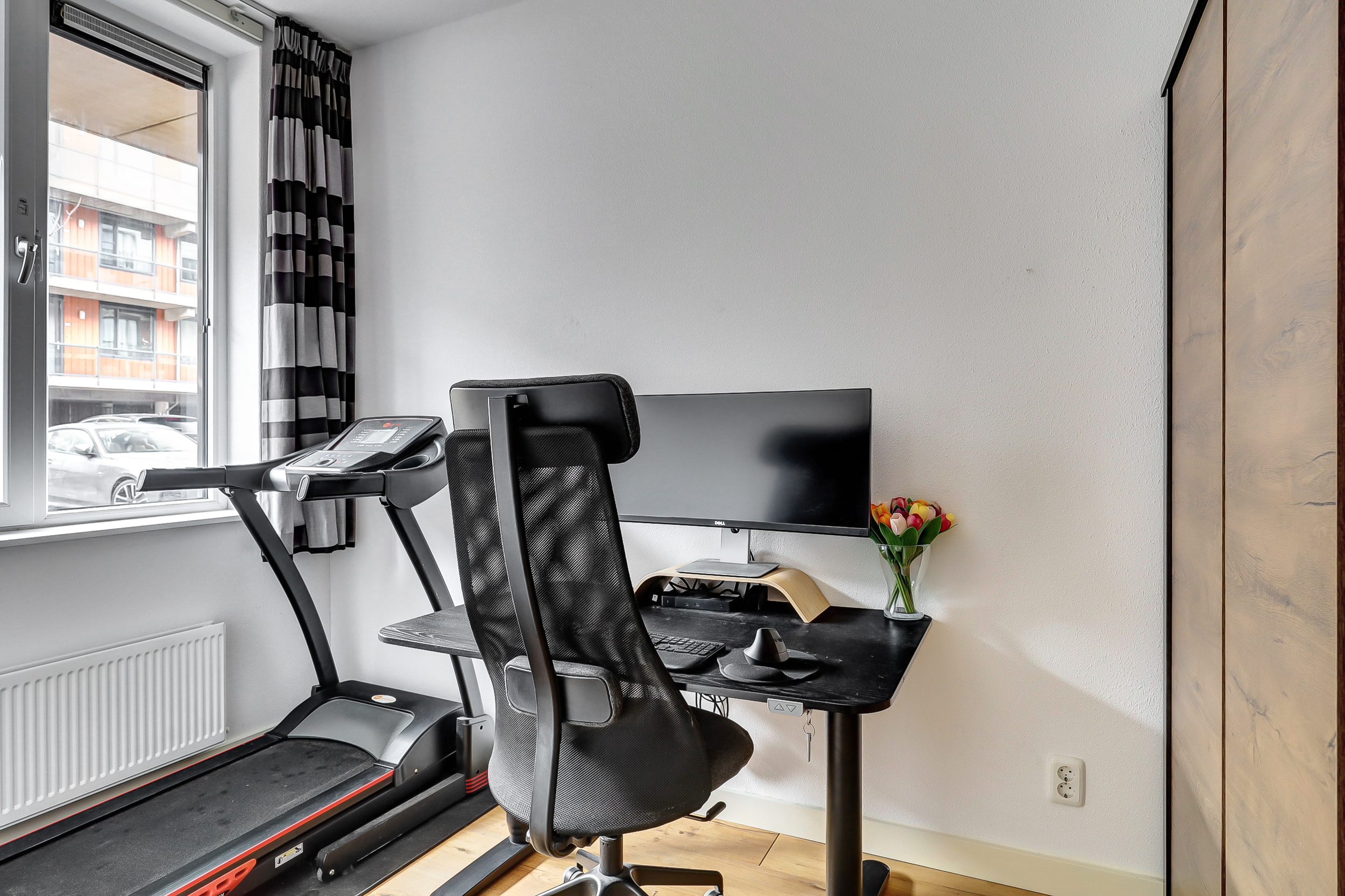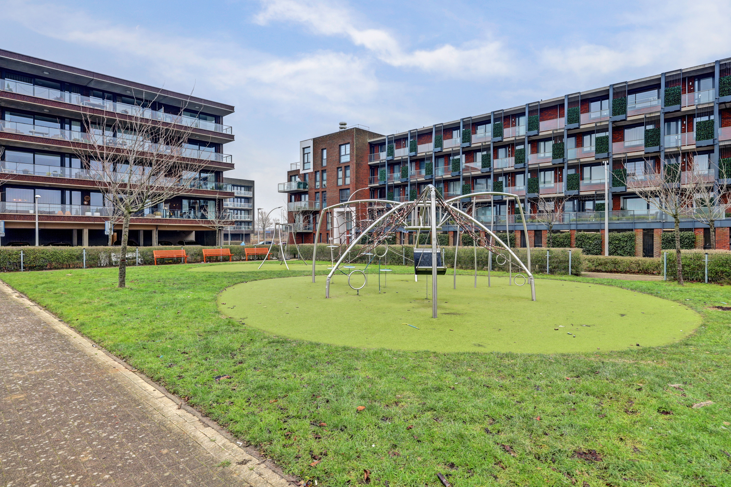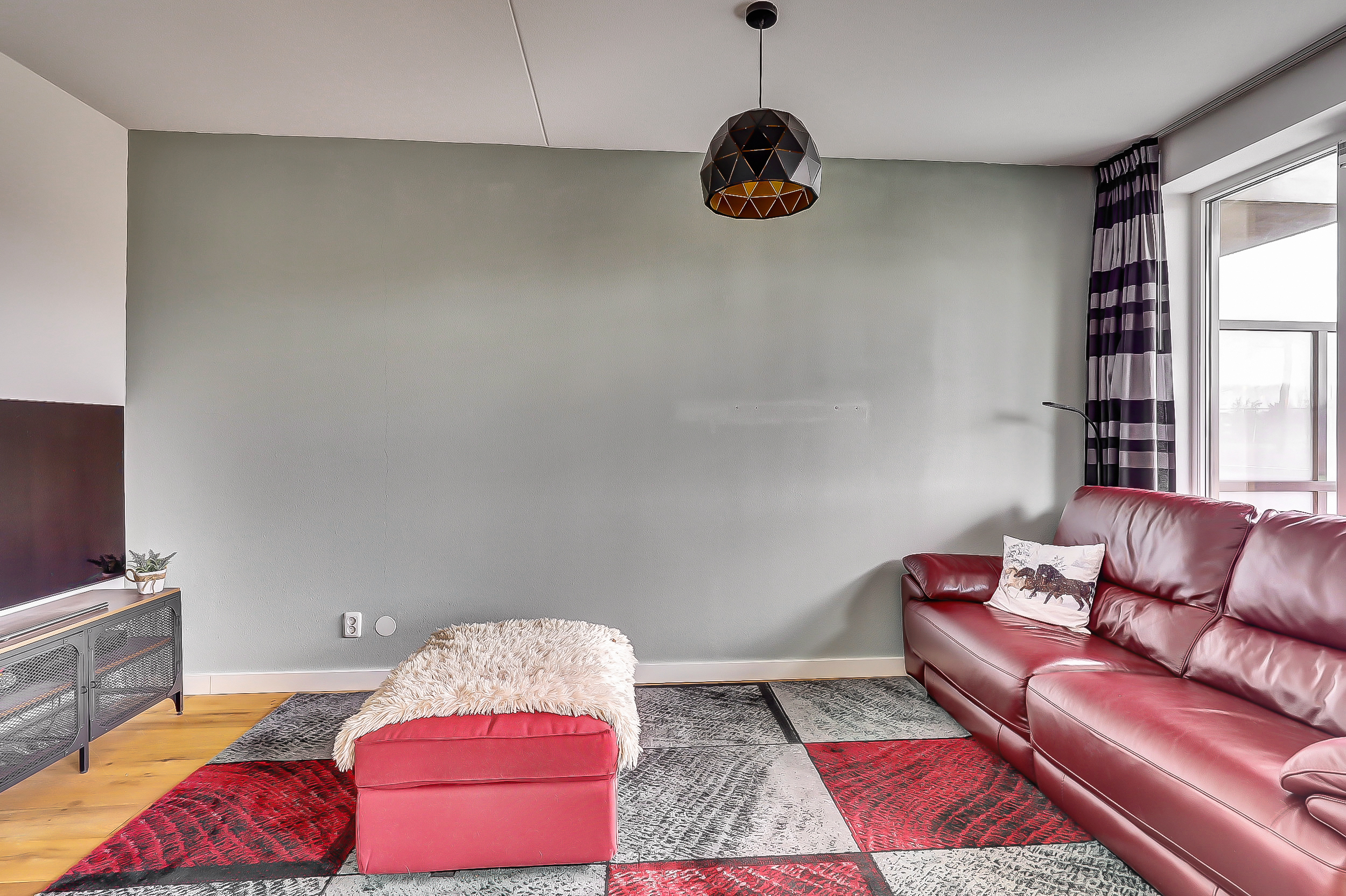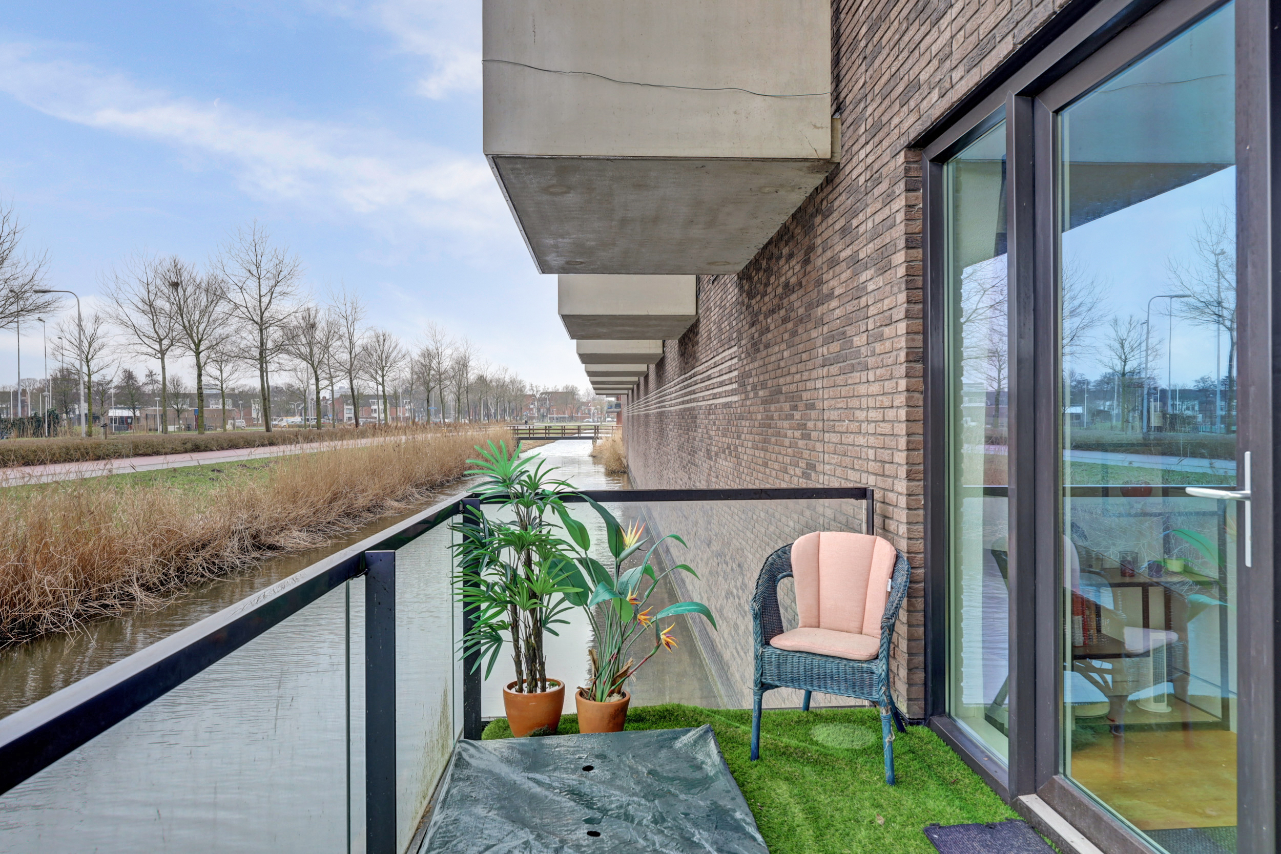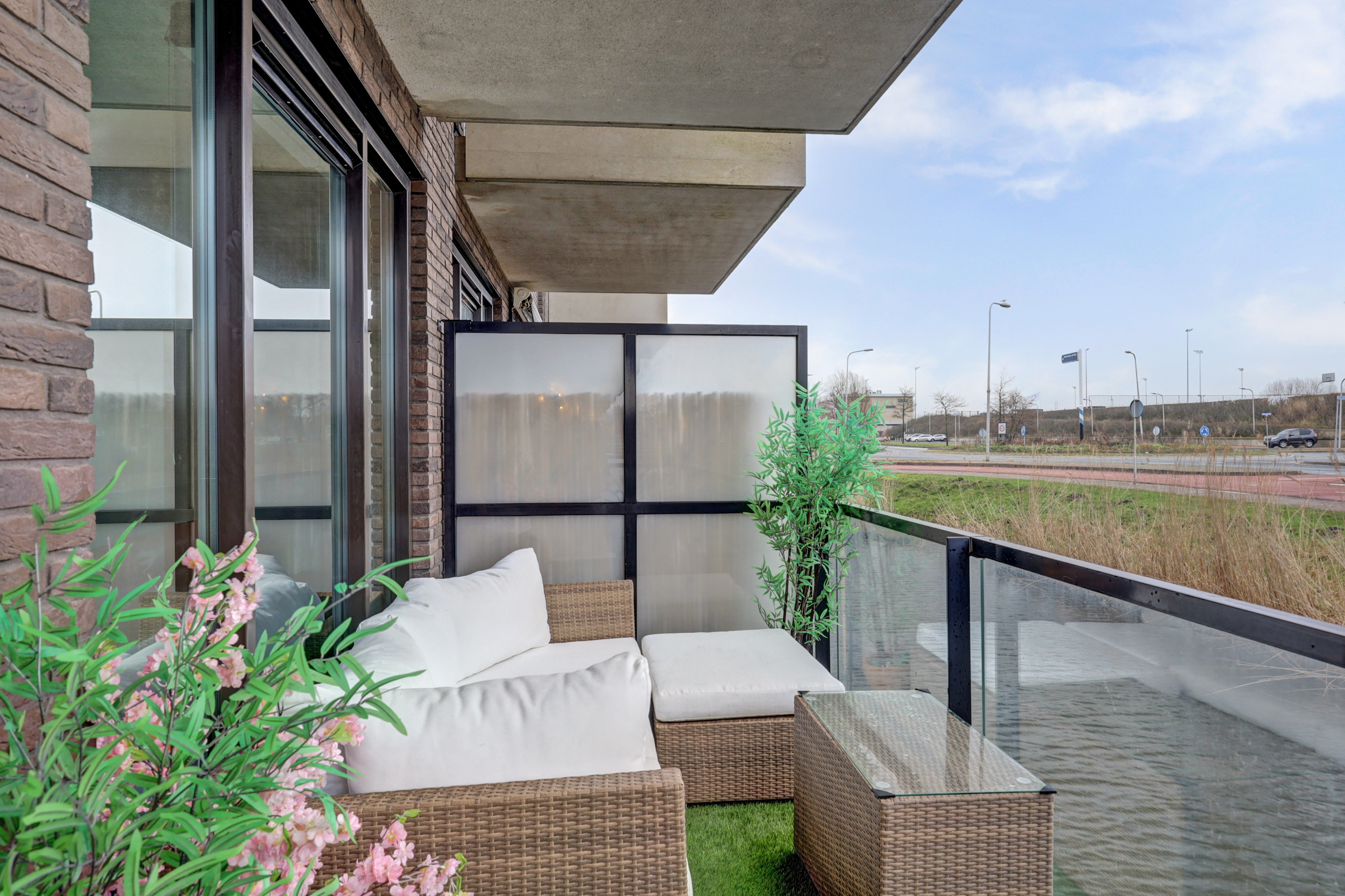 Vanuit de woonkamer is er toegang tot het balkon, waar je heerlijk kunt genieten van de buitenlucht en het vrije en levendige uitzicht. Het balkon is netjes afgewerkt en biedt voldoende ruimte voor een zitje, ideaal om na een lange dag even tot rust te komen.