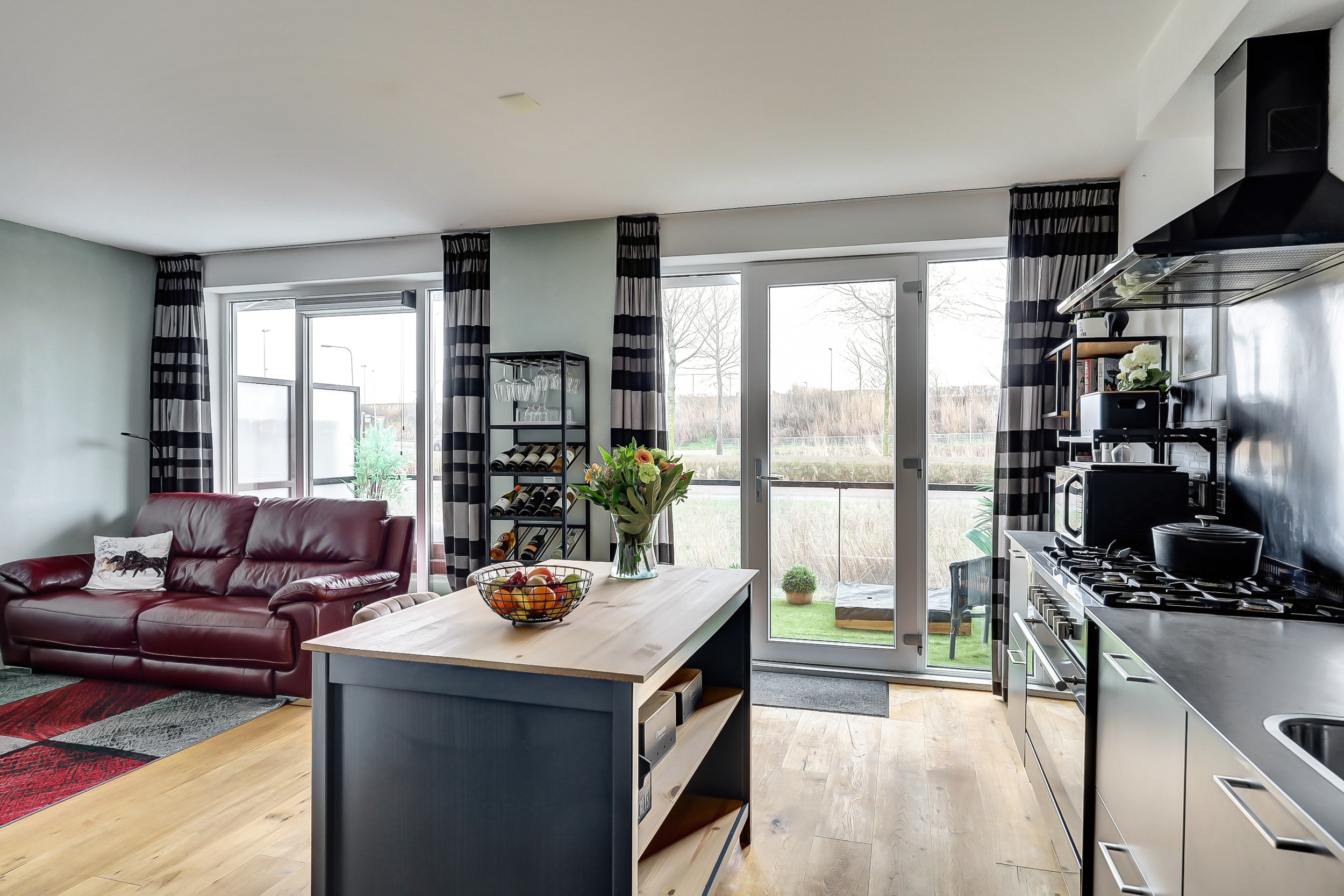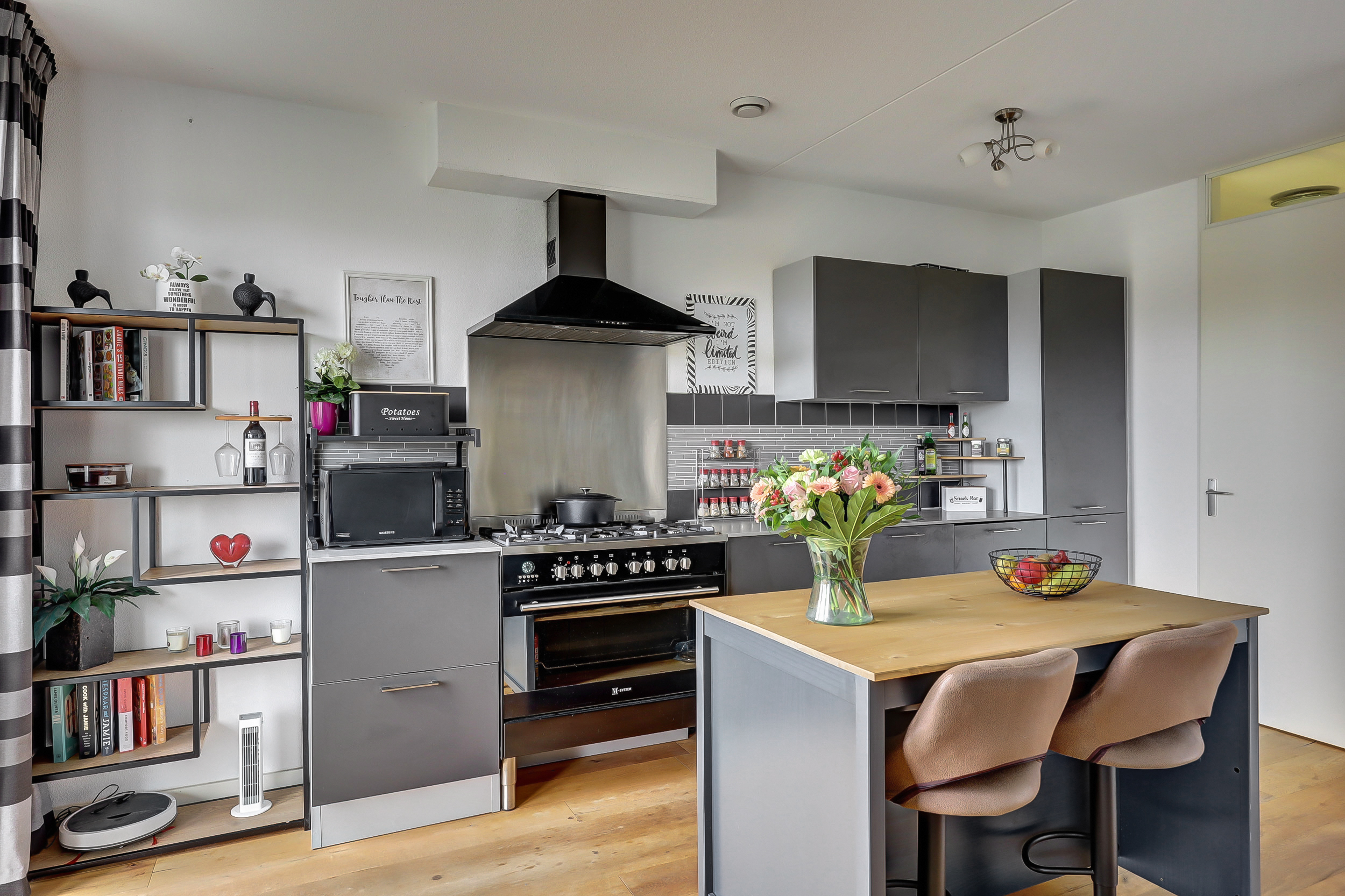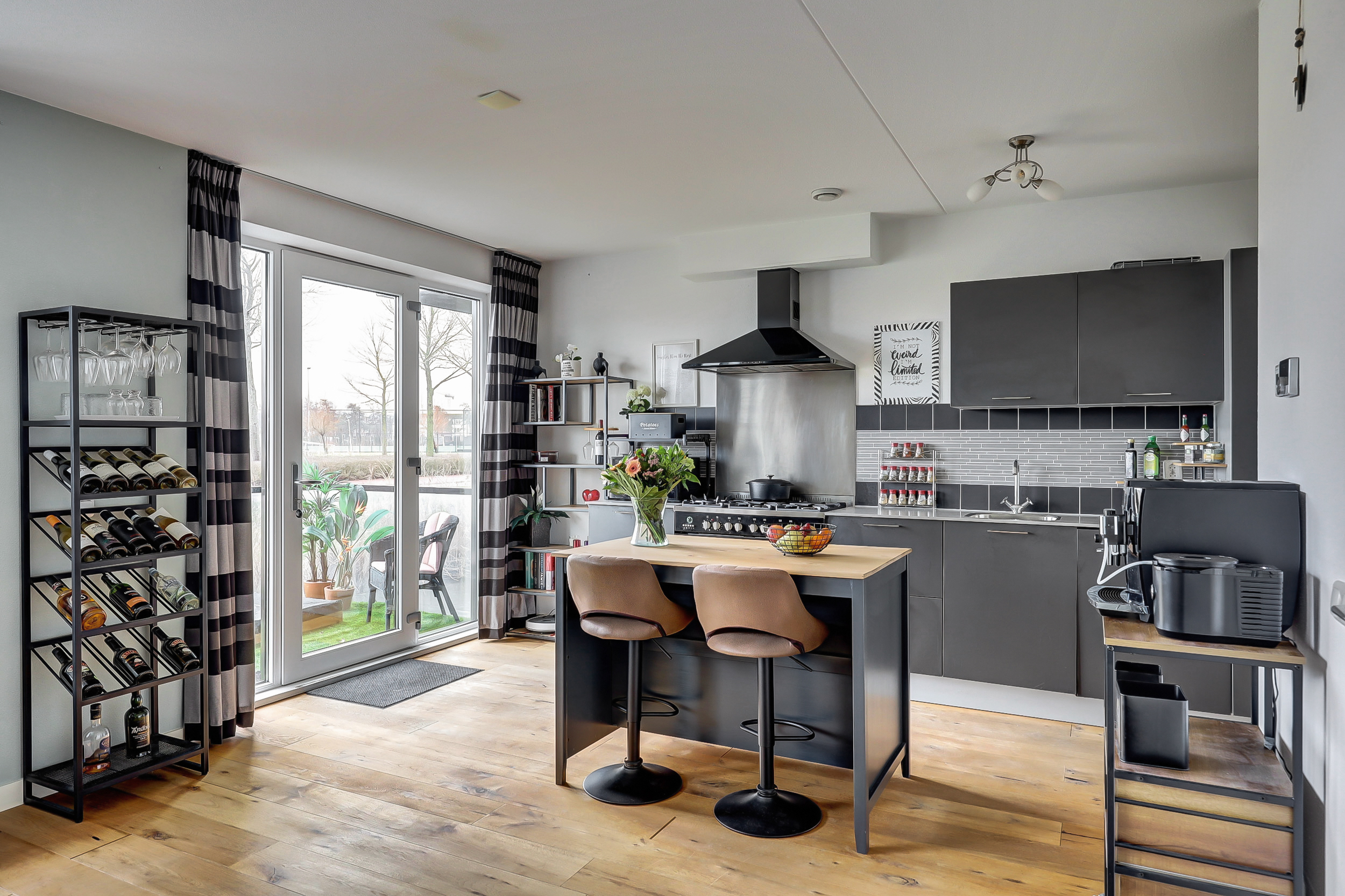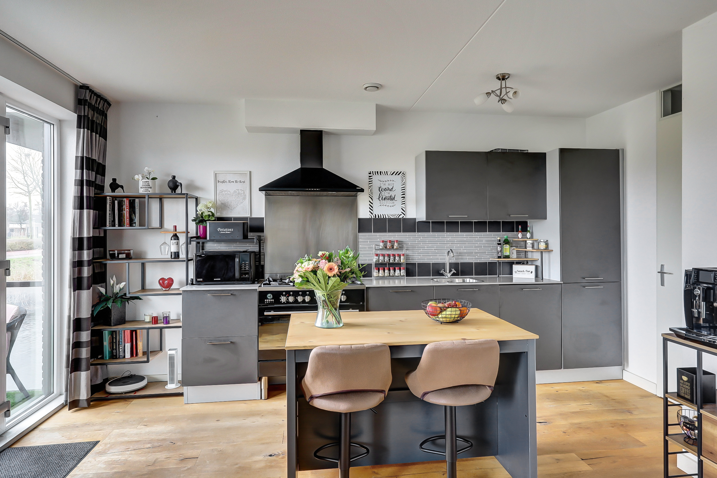 De open keuken vormt een mooi geheel met de woonkamer en is uitgevoerd in een moderne, strakke stijl. De keuken is voorzien van eigentijdse kasten, een ruim werkblad en een kookeiland dat niet alleen extra werkruimte biedt, maar ook een gezellige plek is om aan te zitten. Daarnaast beschikt de keuken over diverse inbouwapparatuur, waaronder een oven, afzuigkap, gasfornuis, vaatwasser, koelkast en vriezer, waardoor het geheel compleet en praktisch is ingericht.