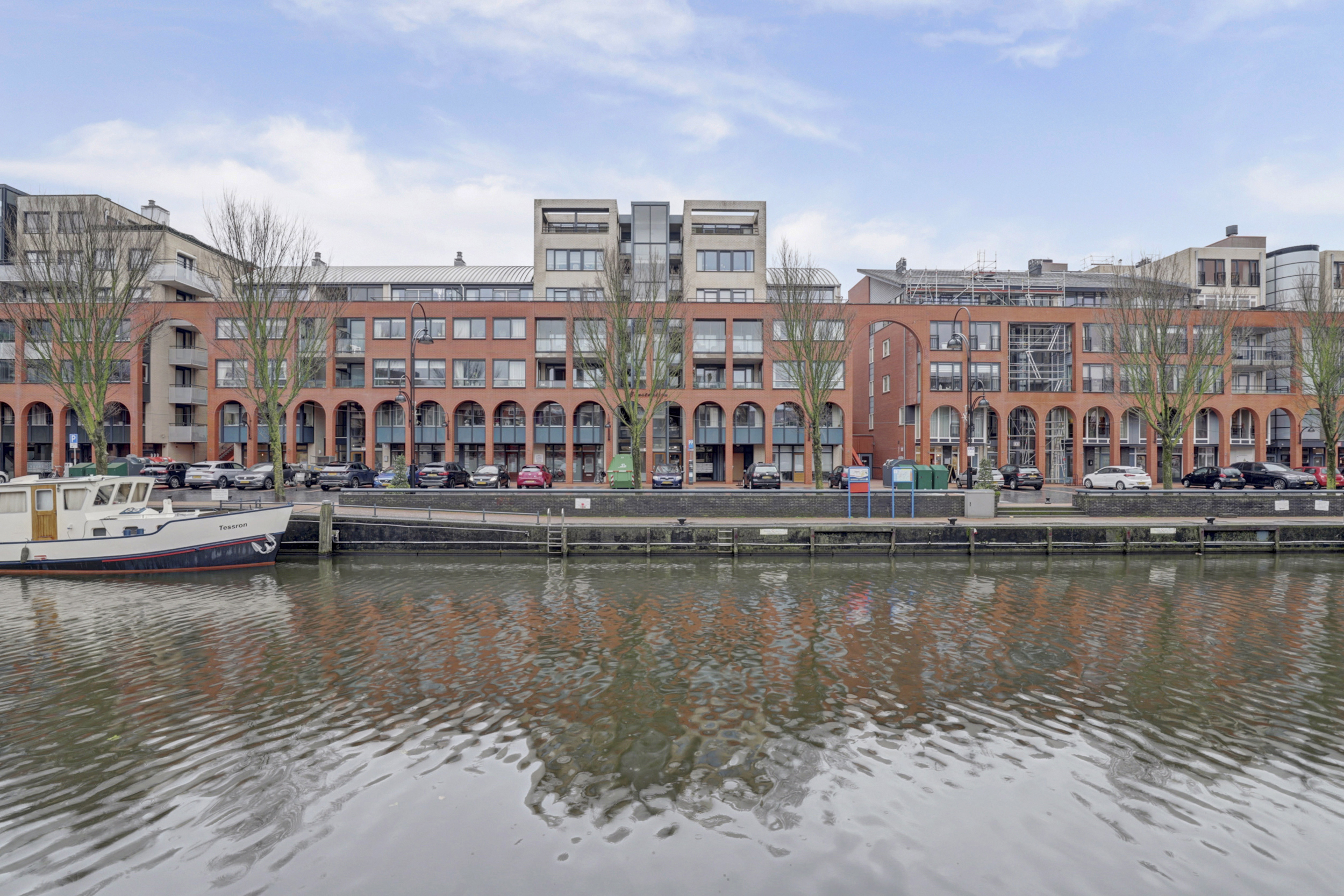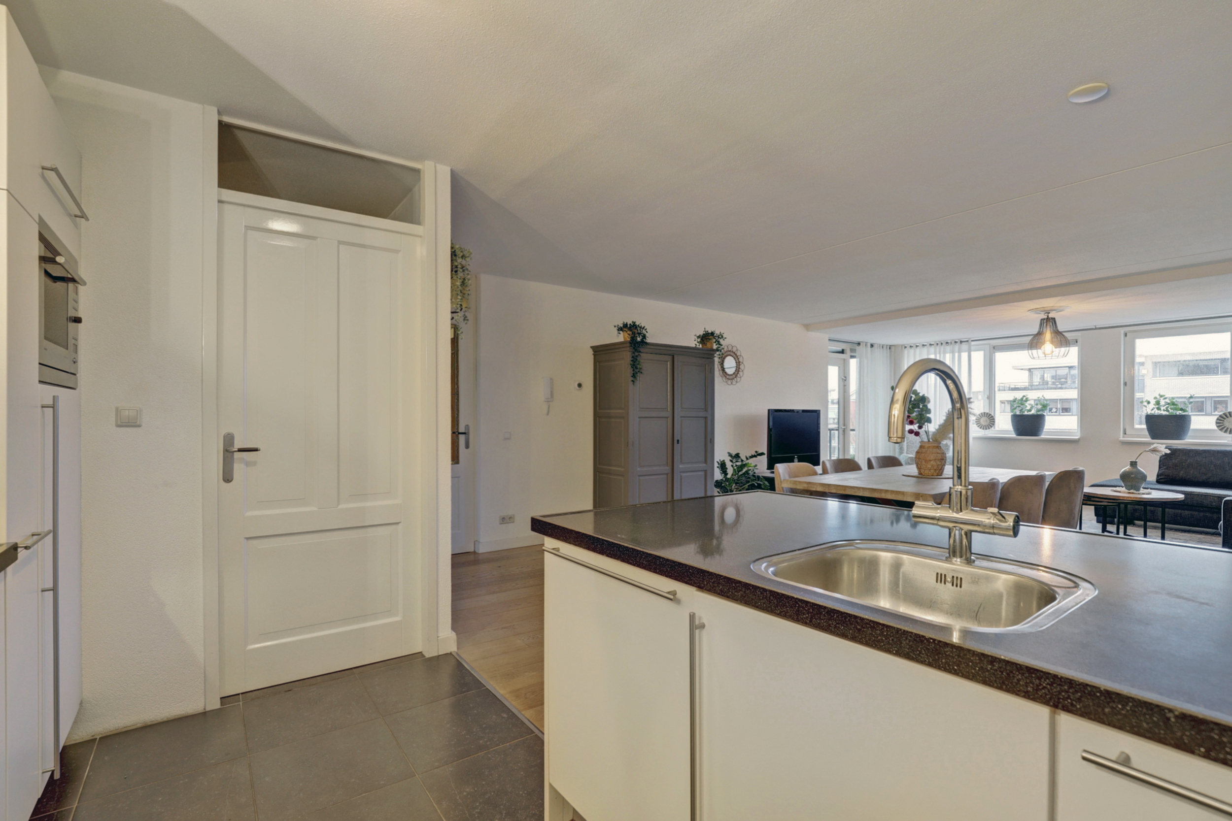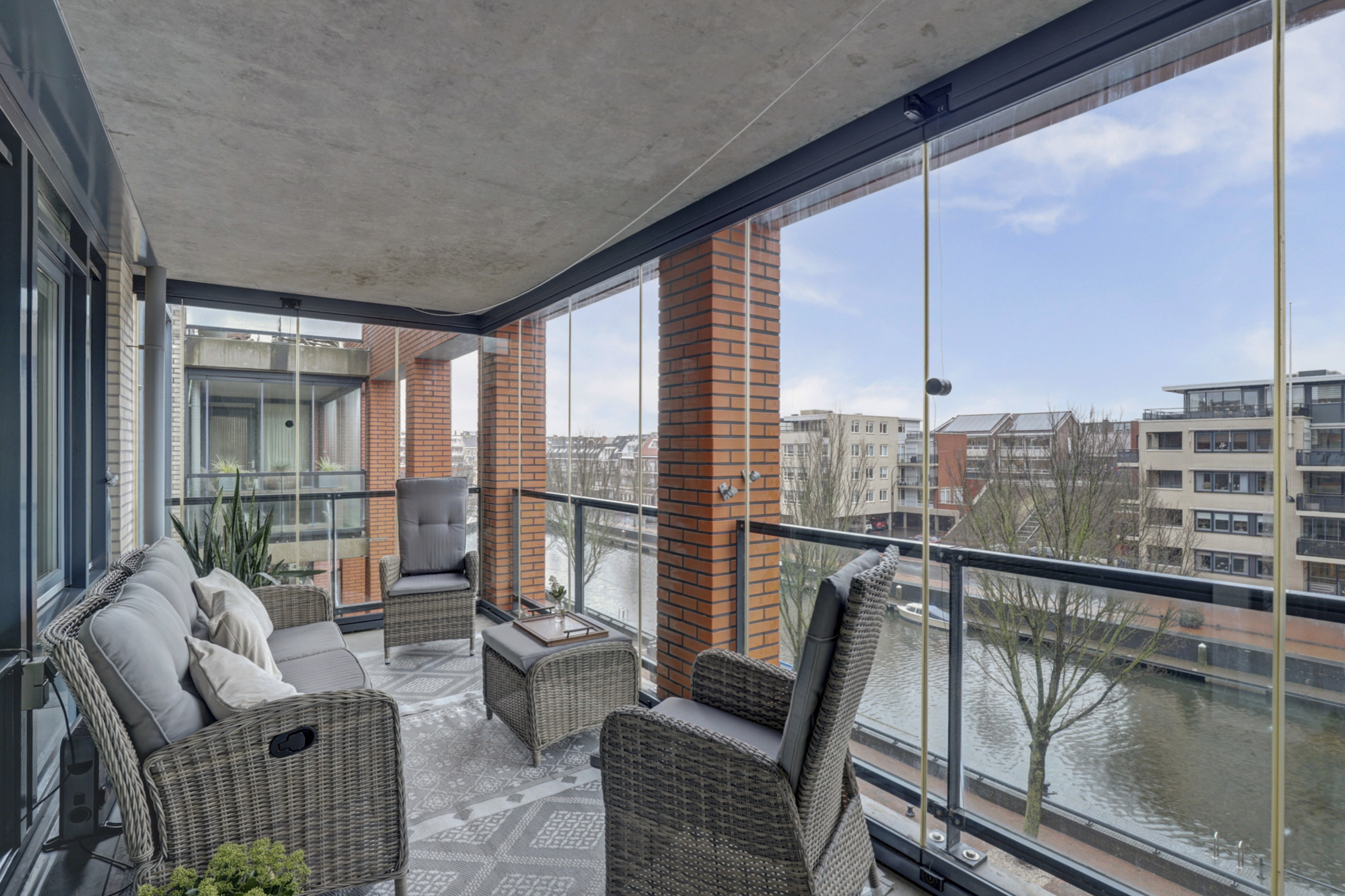 De open keuken is modern en strak uitgevoerd en voorzien van een kookeiland. De keuken beschikt over diverse inbouwapparatuur, waaronder een gaskookplaat, afzuigkap, oven, vaatwasser en koelkast. Het ruime werkblad en de praktische indeling maken deze keuken zeer geschikt voor kookliefhebbers en vormen een mooie verbinding tussen koken en wonen. Via de keuken heeft u toegang tot de bijkeuken, waar zich de wasmachine- en drogeraansluiting en de cv-ketel bevinden. Vanuit de woonkamer heeft u toegang tot het bijzonder ruime en overdekte balkon. Dankzij de glazen balustrades en de overkapping is dit een verlengstuk van de woonkamer, waar u vrijwel het hele jaar door kunt genieten van het buitenleven. Het uitzicht over het water en de omliggende bebouwing maakt dit een zeer aantrekkelijke plek om te ontspannen.