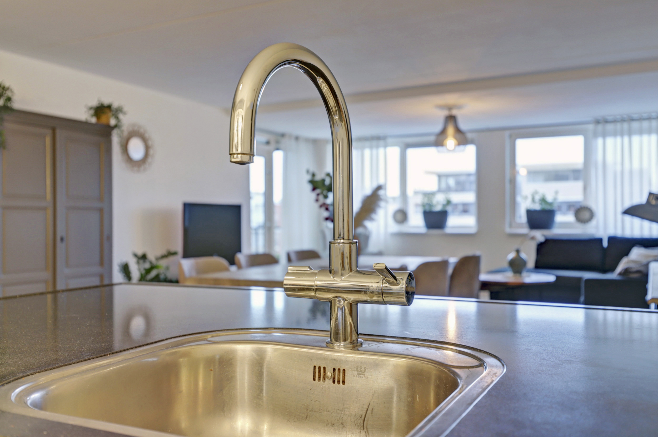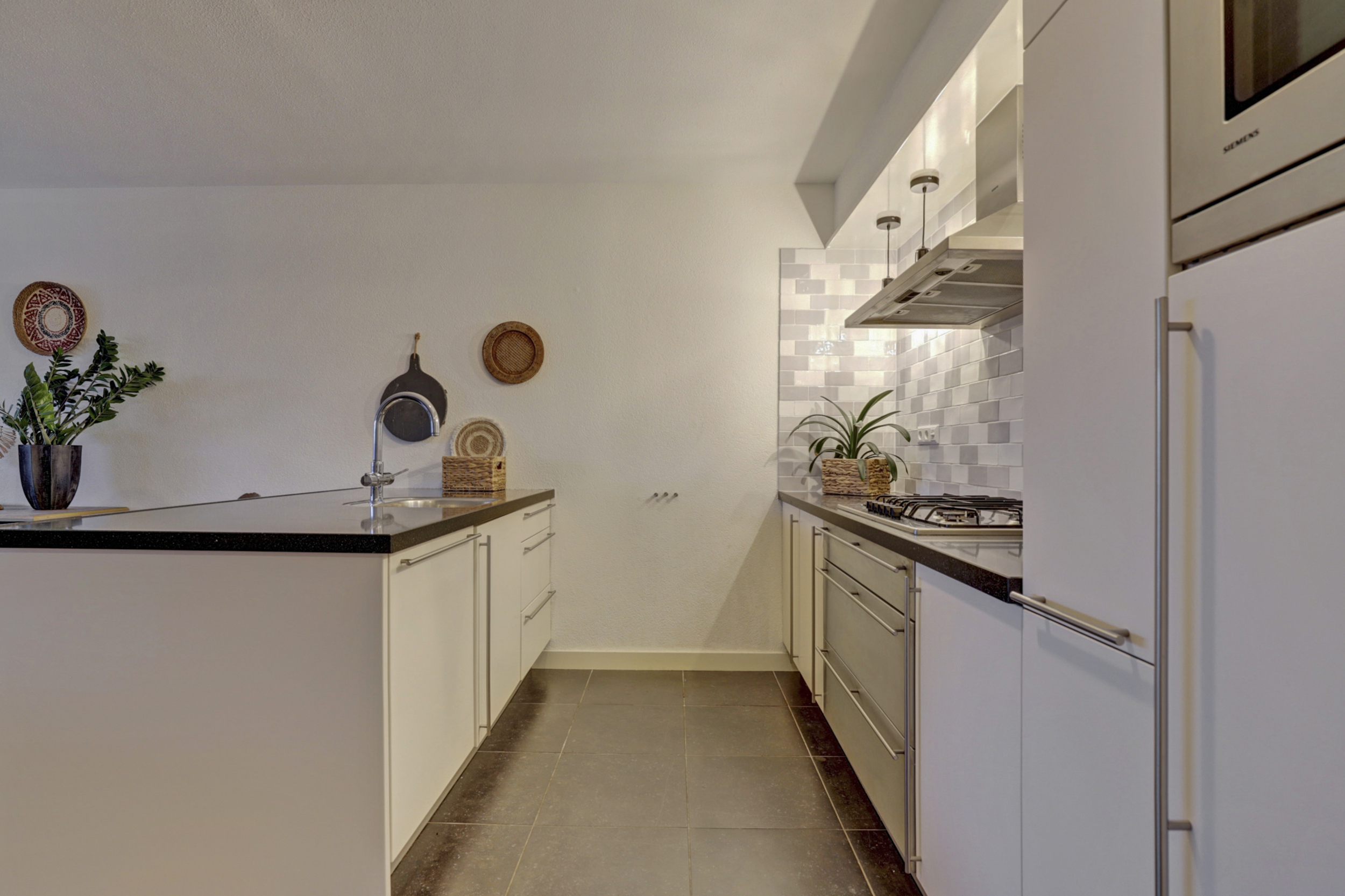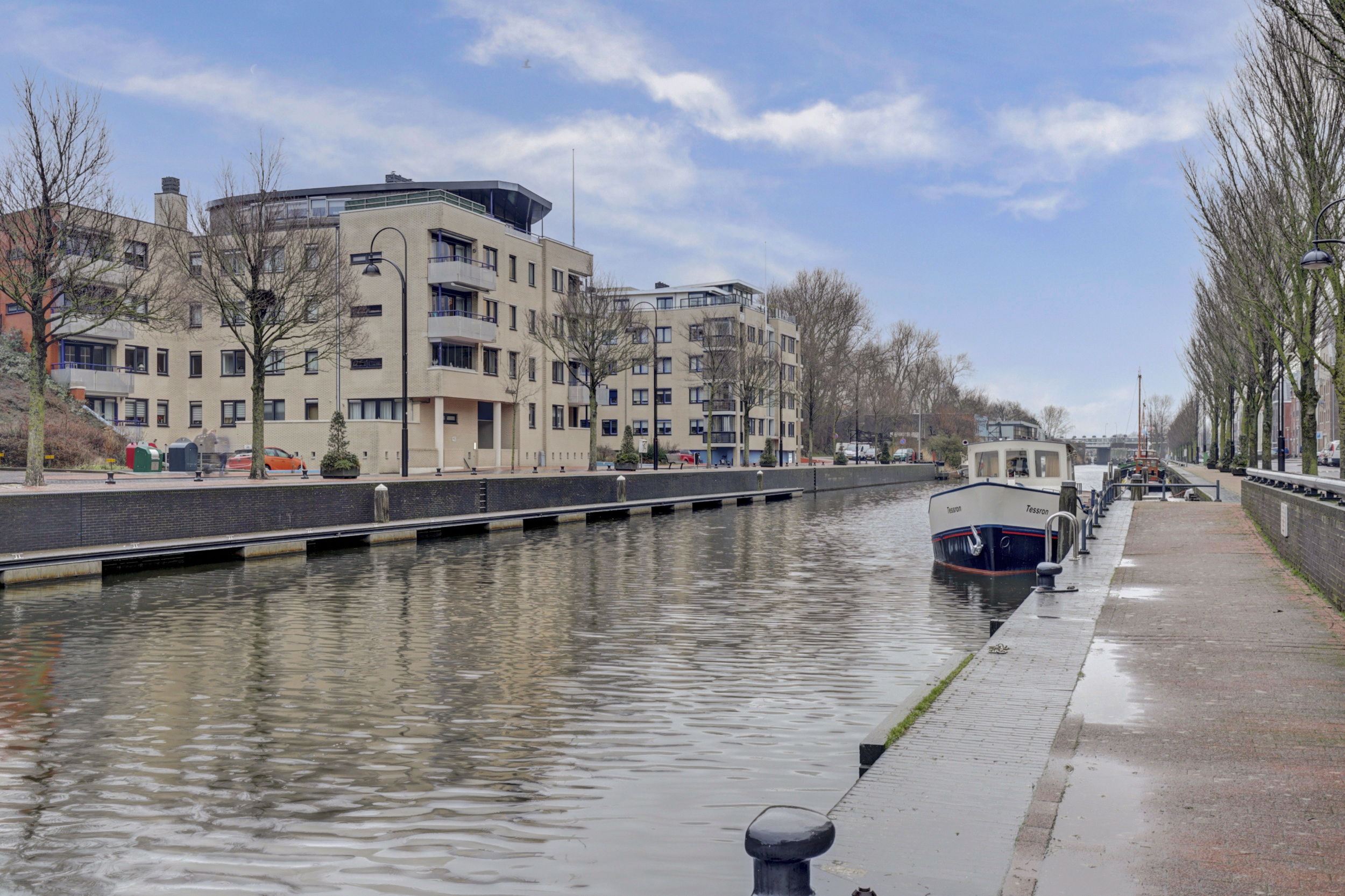 De open keuken is modern en strak uitgevoerd en voorzien van een kookeiland. De keuken beschikt over diverse inbouwapparatuur, waaronder een gaskookplaat, afzuigkap, oven, vaatwasser en koelkast. Het ruime werkblad en de praktische indeling maken deze keuken zeer geschikt voor kookliefhebbers en vormen een mooie verbinding tussen koken en wonen. Via de keuken heeft u toegang tot de bijkeuken, waar zich de wasmachine- en drogeraansluiting en de cv-ketel bevinden. Vanuit de woonkamer heeft u toegang tot het bijzonder ruime en overdekte balkon. Dankzij de glazen balustrades en de overkapping is dit een verlengstuk van de woonkamer, waar u vrijwel het hele jaar door kunt genieten van het buitenleven. Het uitzicht over het water en de omliggende bebouwing maakt dit een zeer aantrekkelijke plek om te ontspannen.
