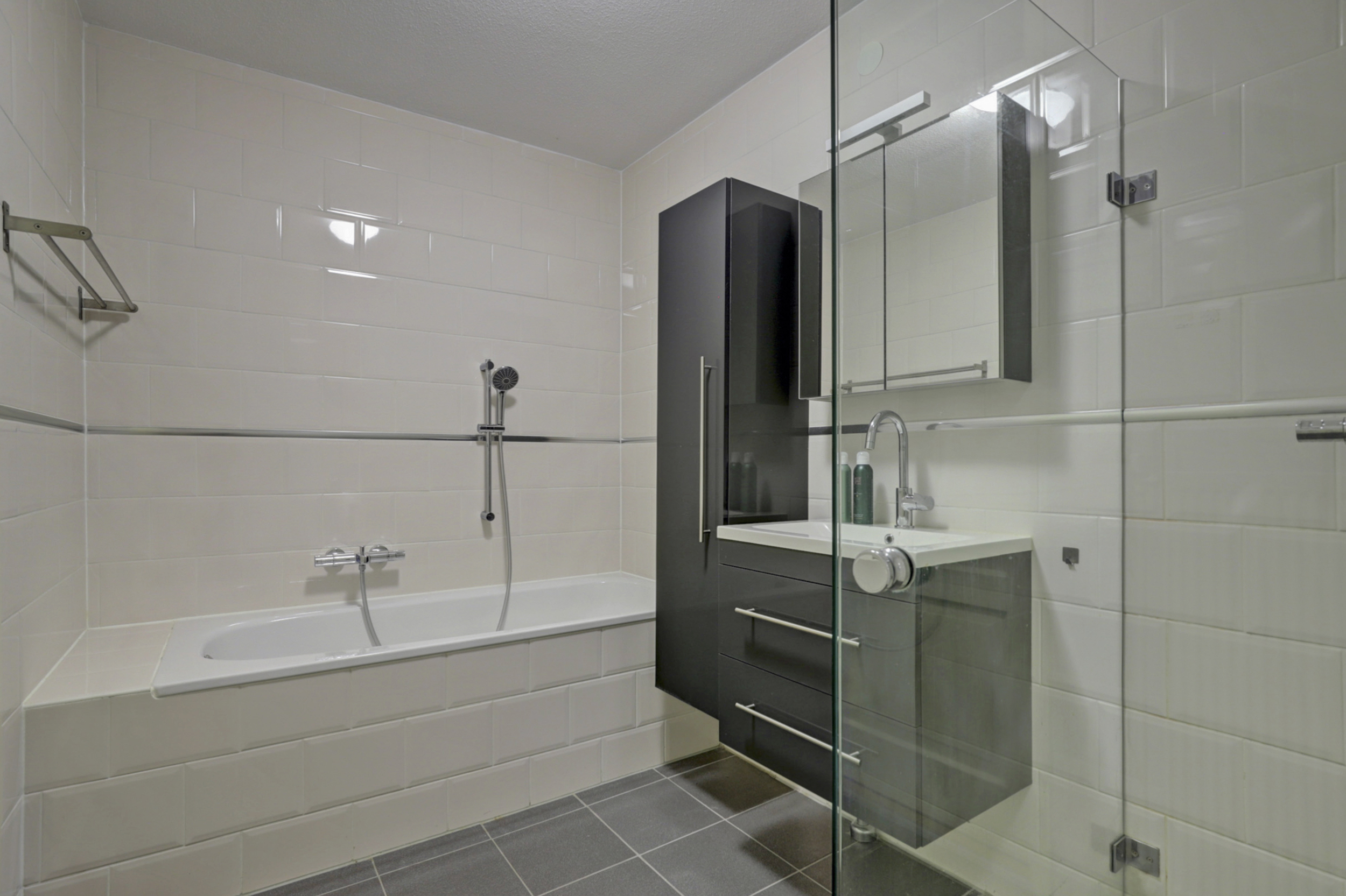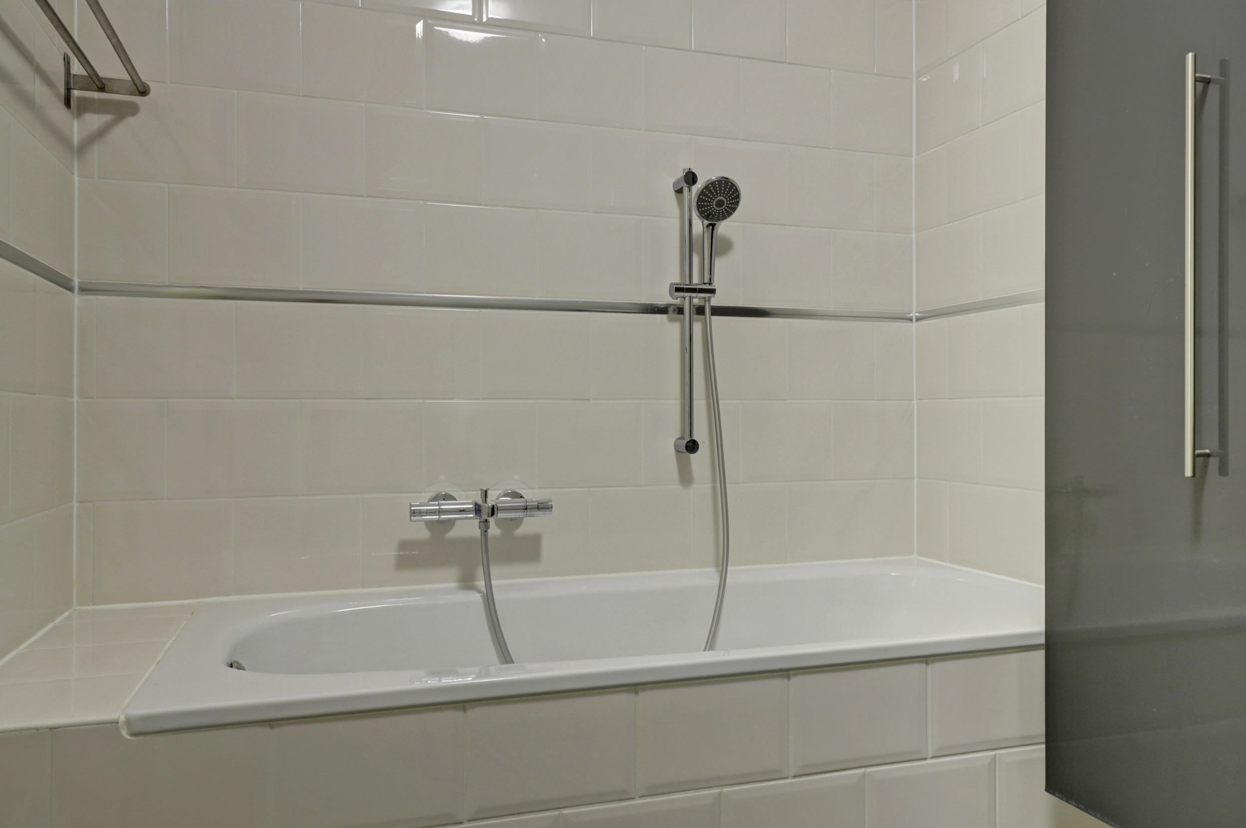 De badkamer is modern uitgevoerd en volledig betegeld in lichte tinten. Deze is voorzien van een ligbad, een ruime douchecabine met glazen wand, een wastafelmeubel en een verzorgde afwerking. Daarnaast is er een separaat toilet aanwezig, bereikbaar vanuit de hal.