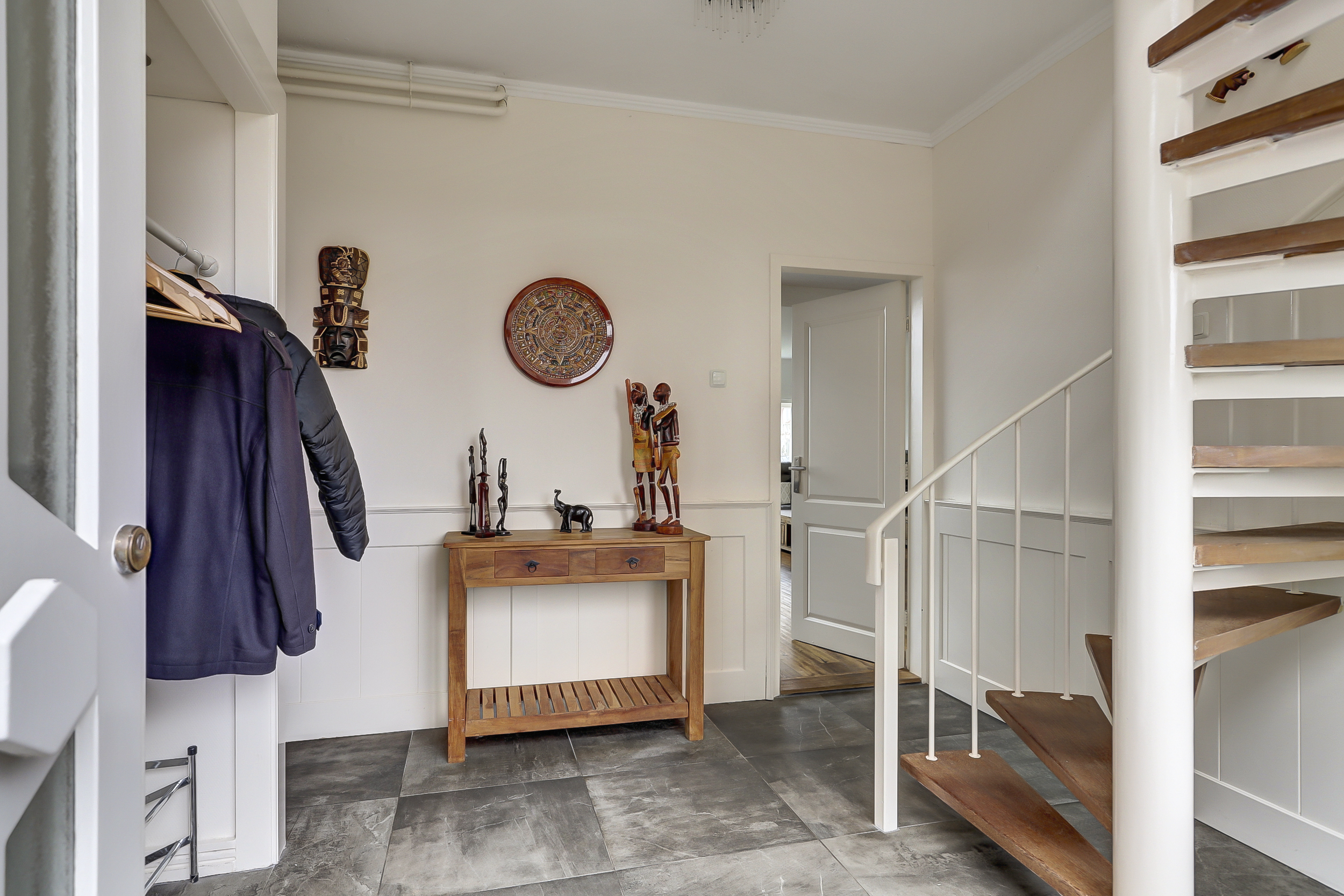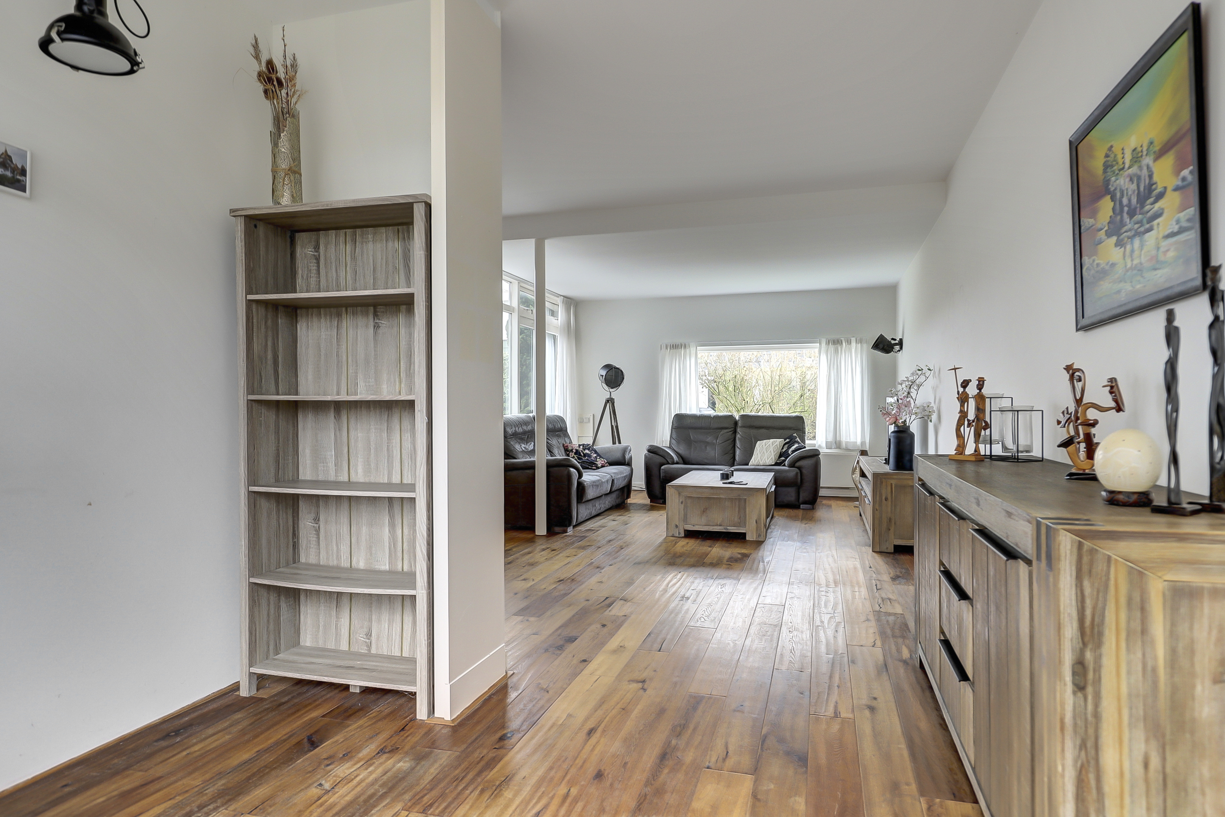 Via de entree kom je binnen in de hal met meterkast, garderoberuimte en een separaat toilet en berging. Vanuit hier is er toegang tot de ruime woonkamer, die zich aan de voorzijde van de woning bevindt. De woonkamer is licht en prettig van formaat, met grote raampartijen en voldoende ruimte voor een comfortabele zithoek en eethoek.