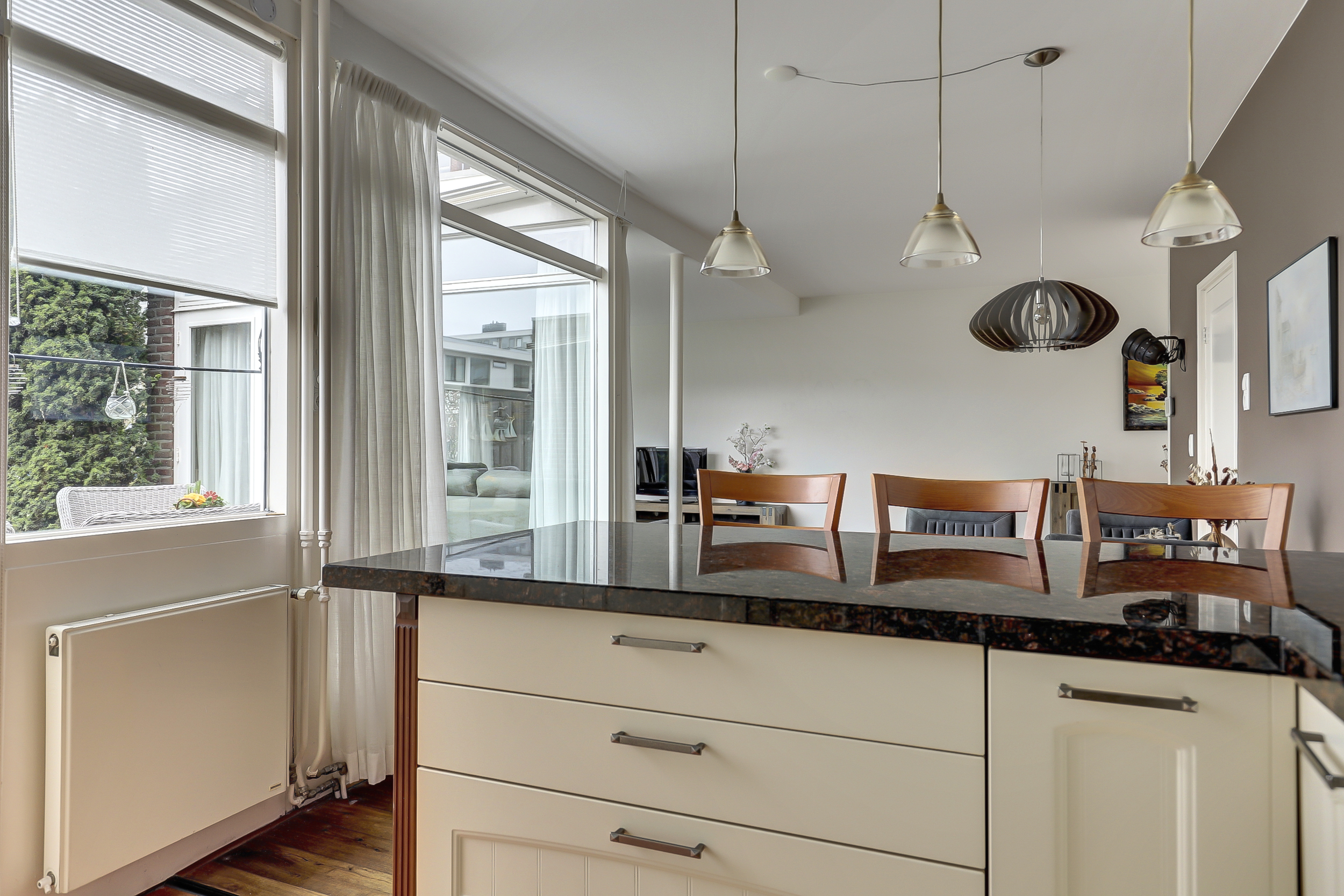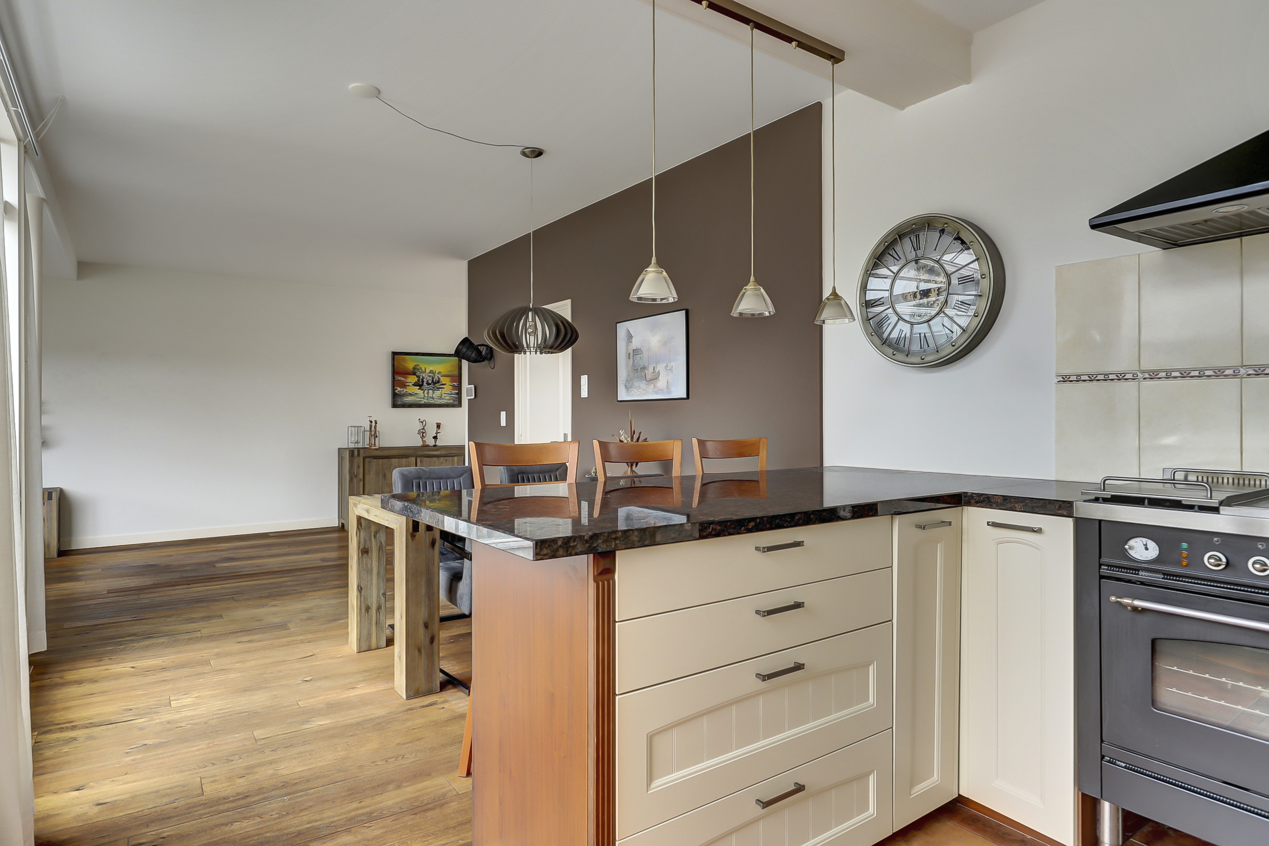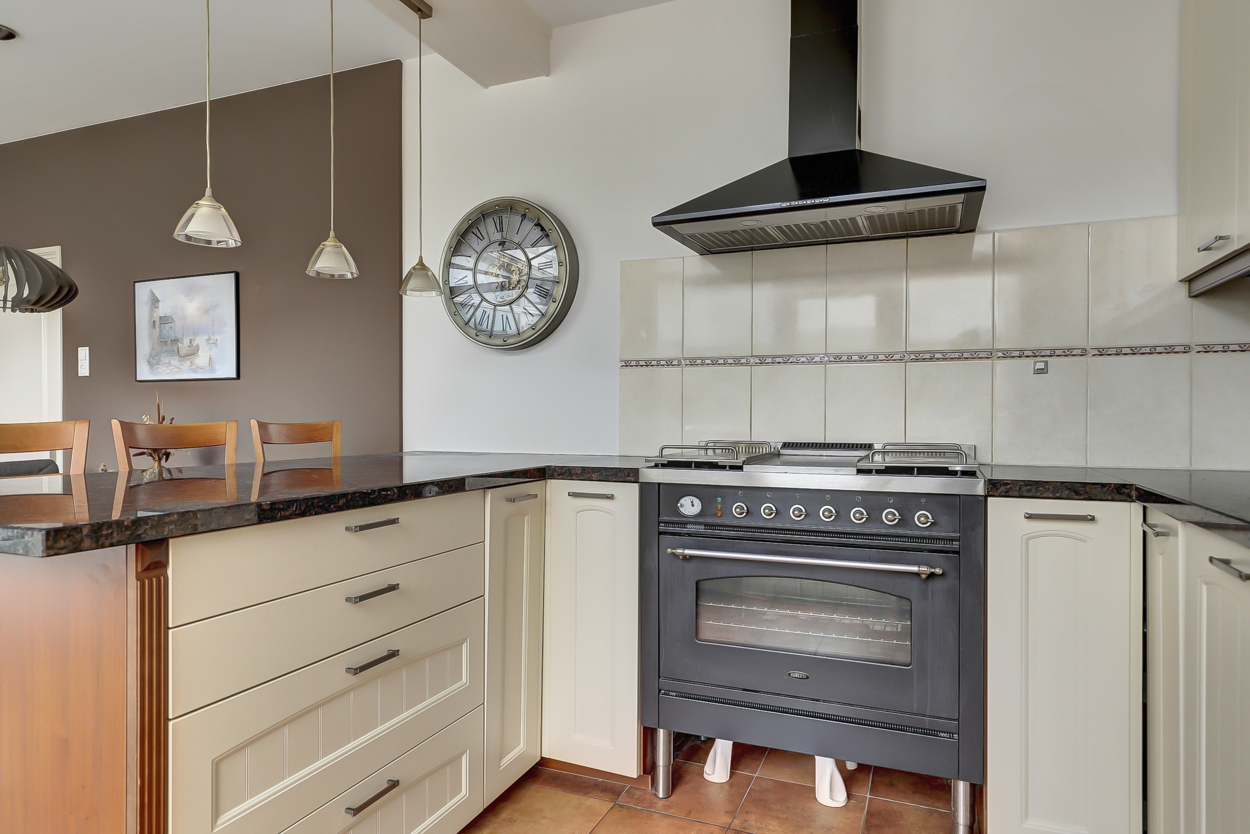 Aan de achterzijde van de woning bevindt zich de keuken, die praktisch is ingedeeld en direct grenst aan de tuin. De keuken beschikt over voldoende kastruimte en een ruim werkblad en vormt daarmee een prettige basis voor dagelijks gebruik. Daarnaast is de keuken uitgerust met een afzuigkap, een losstaand gasfornuis, een ingebouwde vaatwasser en een koelkast en vriezer.