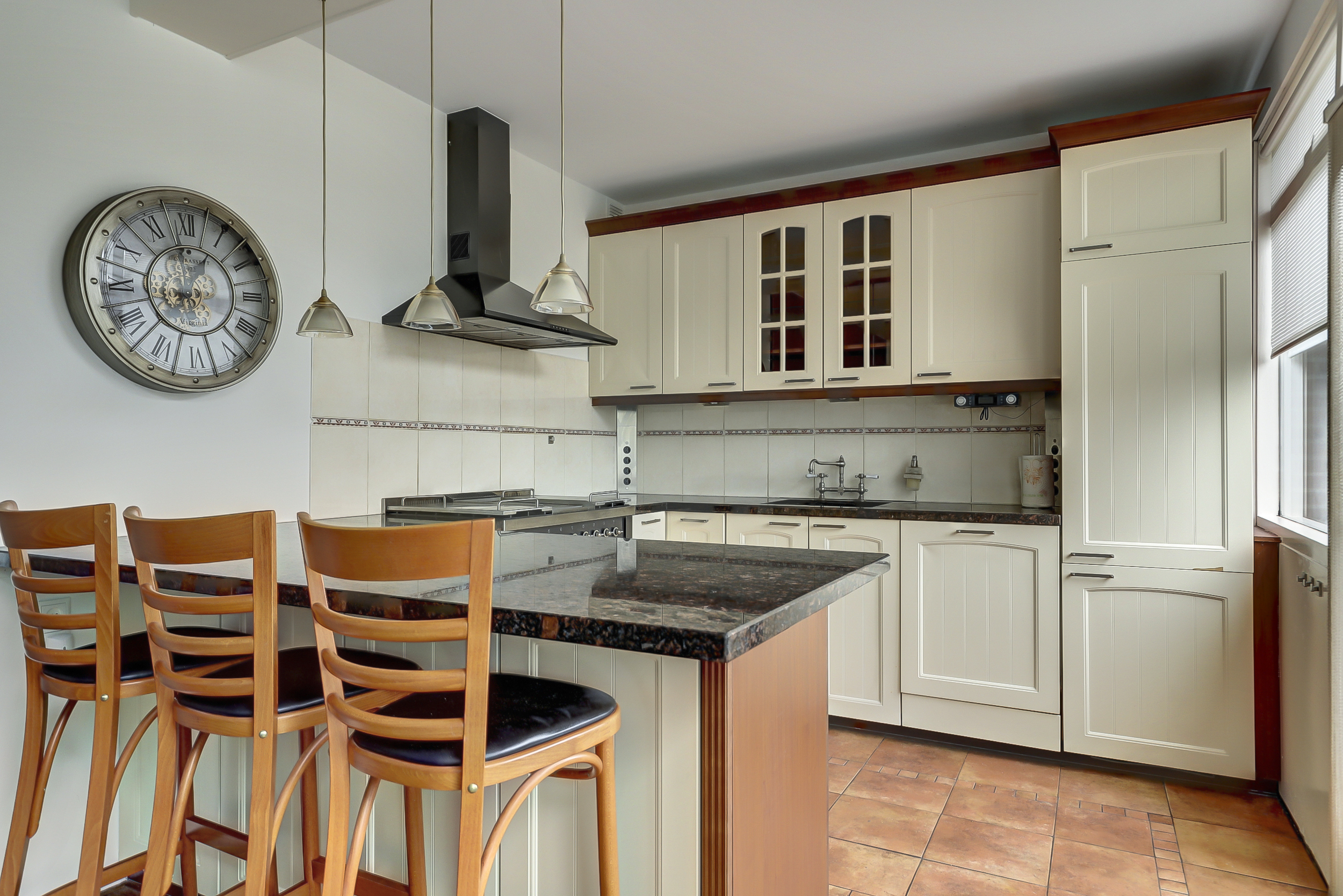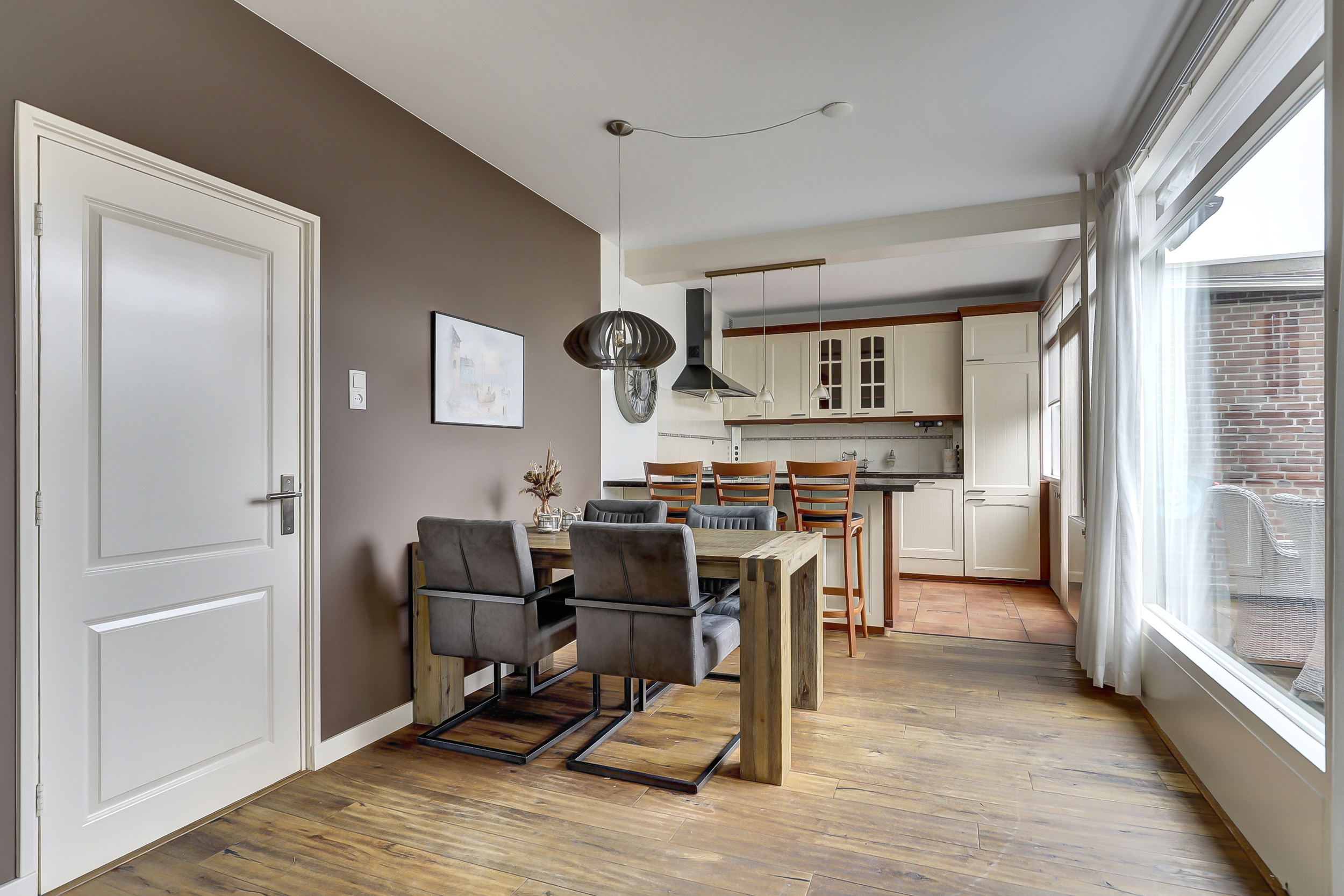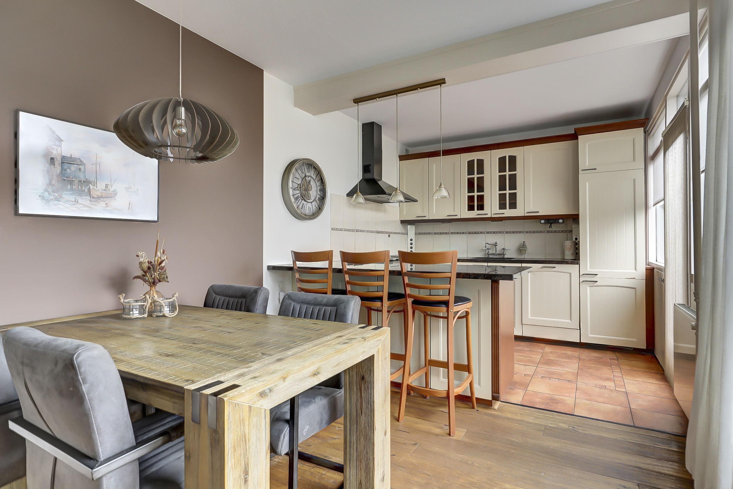 Aan de achterzijde van de woning bevindt zich de keuken, die praktisch is ingedeeld en direct grenst aan de tuin. De keuken beschikt over voldoende kastruimte en een ruim werkblad en vormt daarmee een prettige basis voor dagelijks gebruik. Daarnaast is de keuken uitgerust met een afzuigkap, een losstaand gasfornuis, een ingebouwde vaatwasser en een koelkast en vriezer.