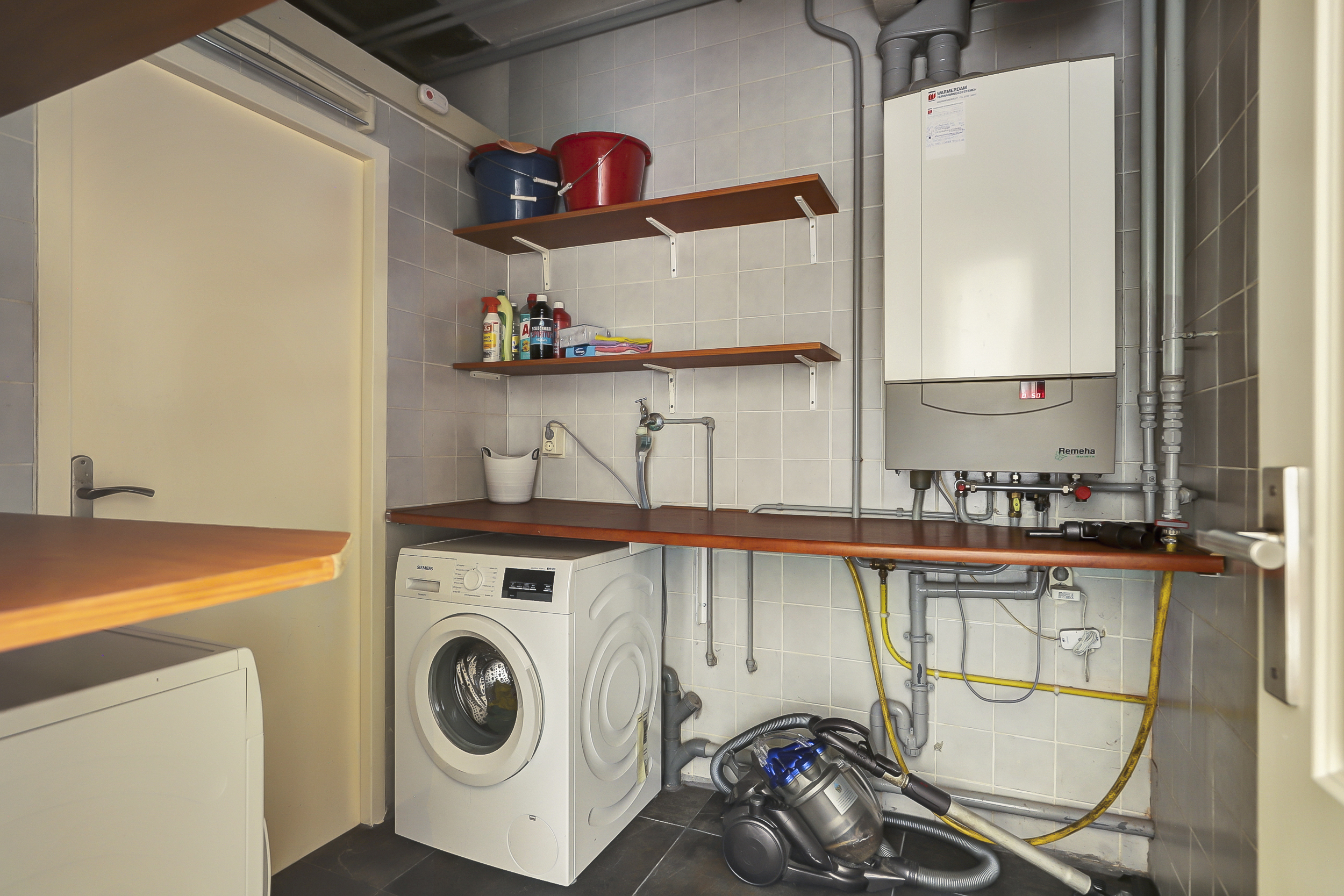 Aansluitend aan de woning bevinden zich diverse praktische ruimtes, waaronder een berging met ruimte voor de wasmachine en droger. Daarnaast beschikt de woning over een inpandige garage, die niet alleen geschikt is voor het stallen van een auto, maar ook uitstekend kan worden gebruikt als extra bergruimte of hobbyruimte.