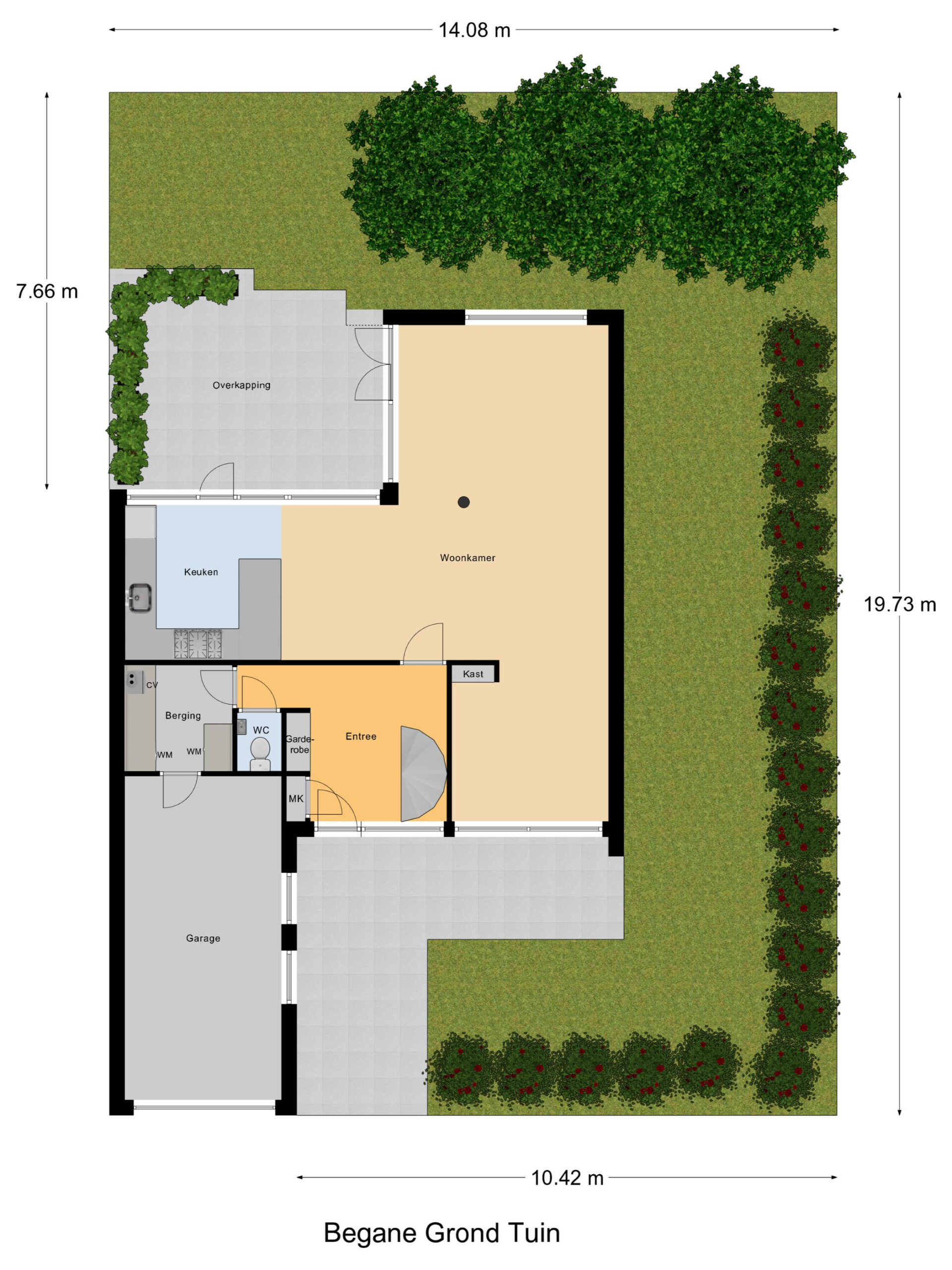 - Achtertuin 76 m2 (7.66 meter diep en 14.08 meter breed)