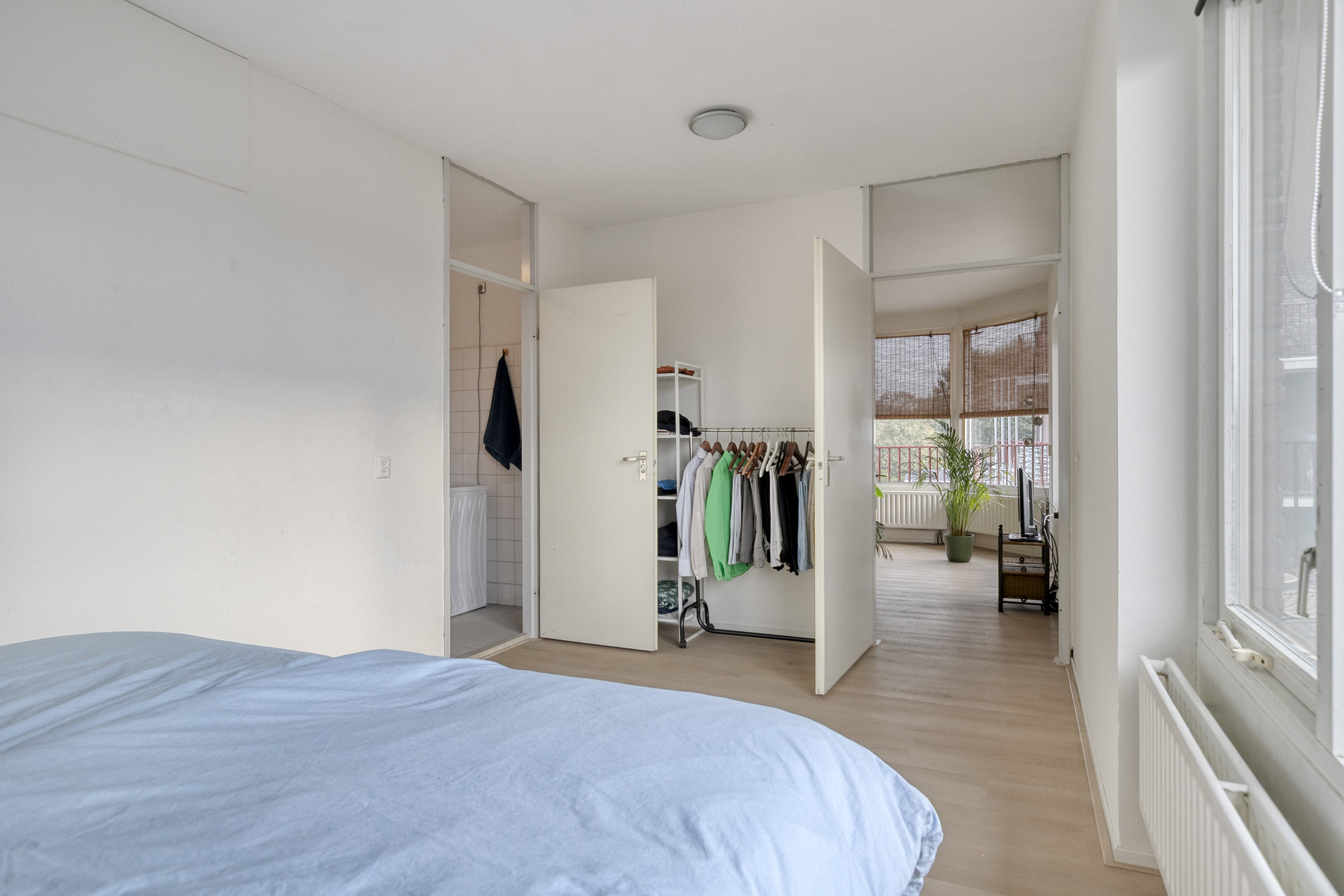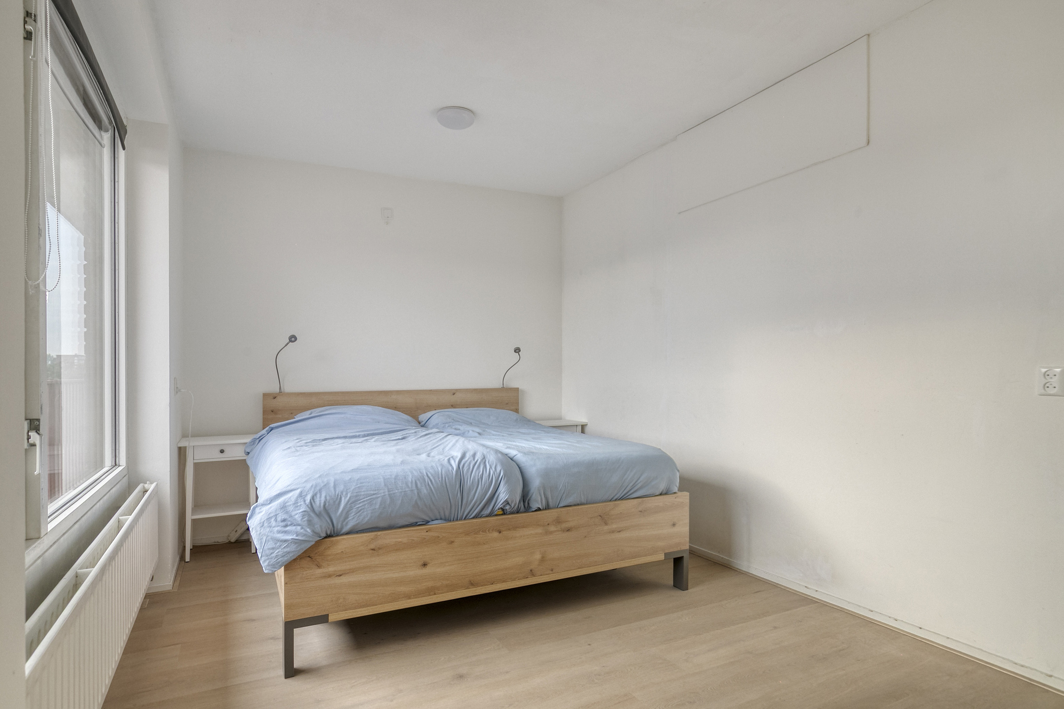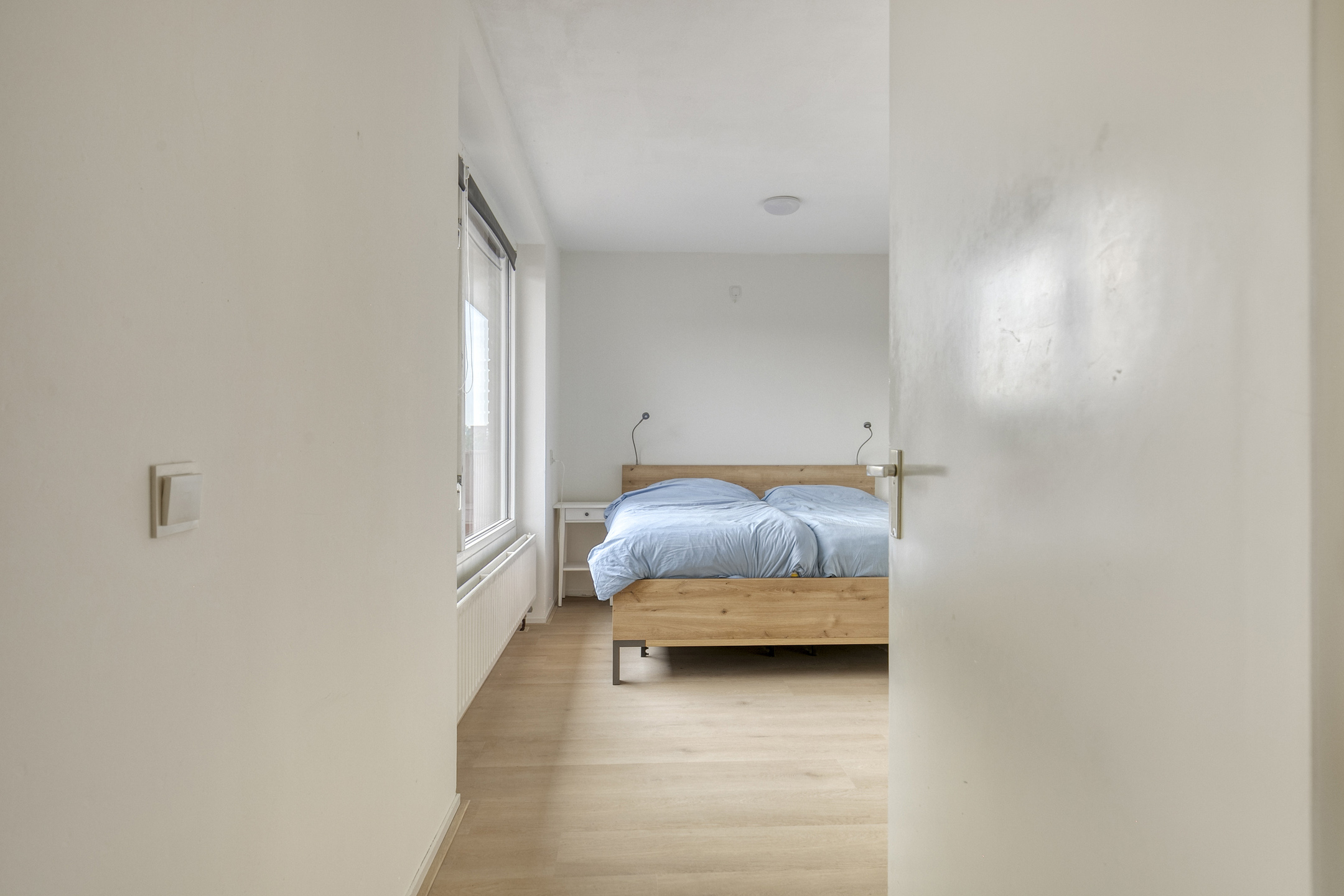 De slaapkamer bereikt u vanuit de woonkamer, is meer dan 5 meter lang en biedt hierdoor meer dan voldoende ruimte voor een groot tweepersoonsbed, opbergmeubel en een bureau voor het thuiswerken of de thuisstudie. Vanuit de slaapkamer heeft u toegang tot de badkamer. Deze badkamer is praktisch ingedeeld met een ruime douche, de witgoedaansluitingen en een wastafel met spiegel.