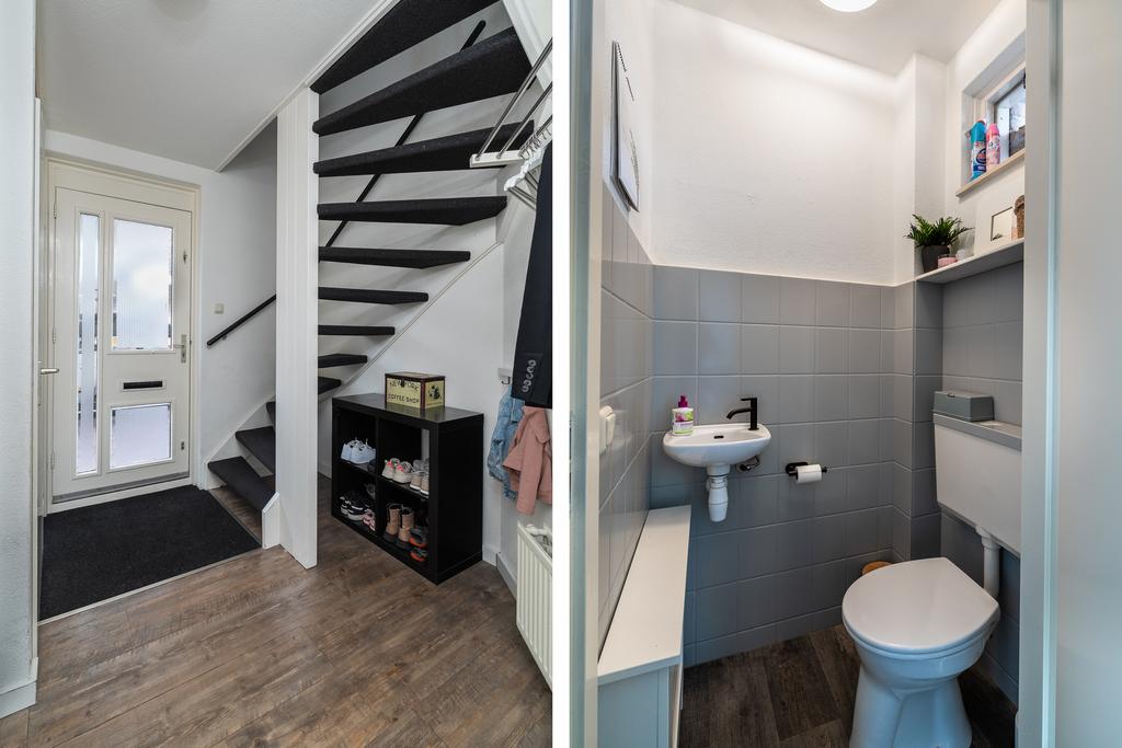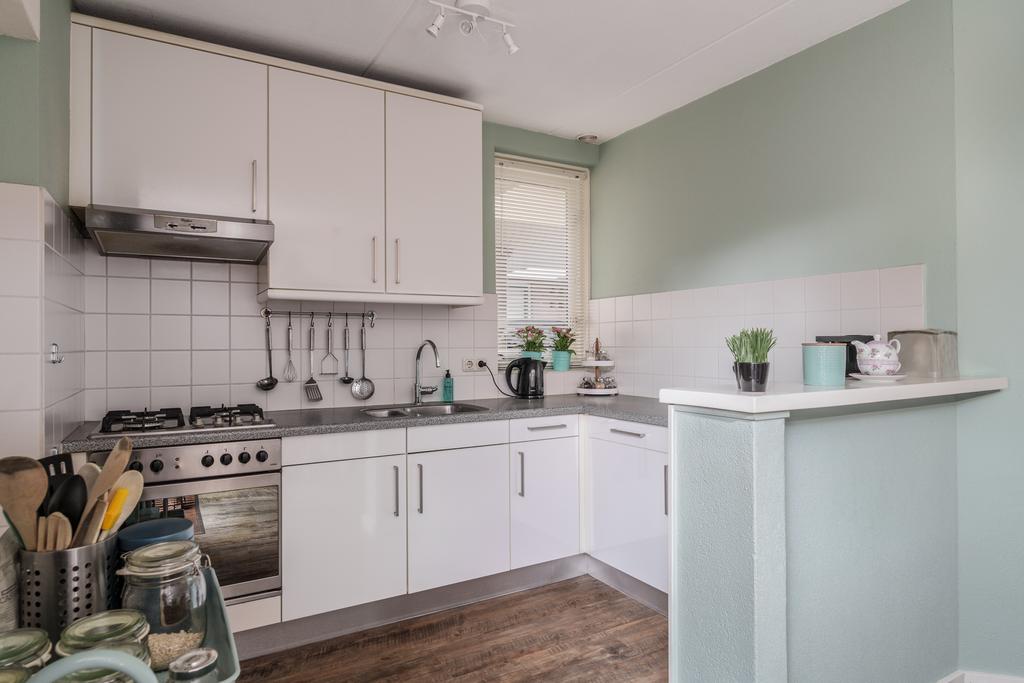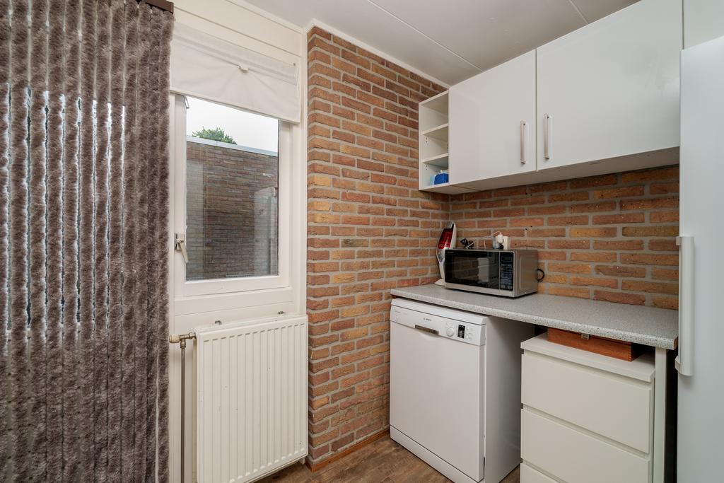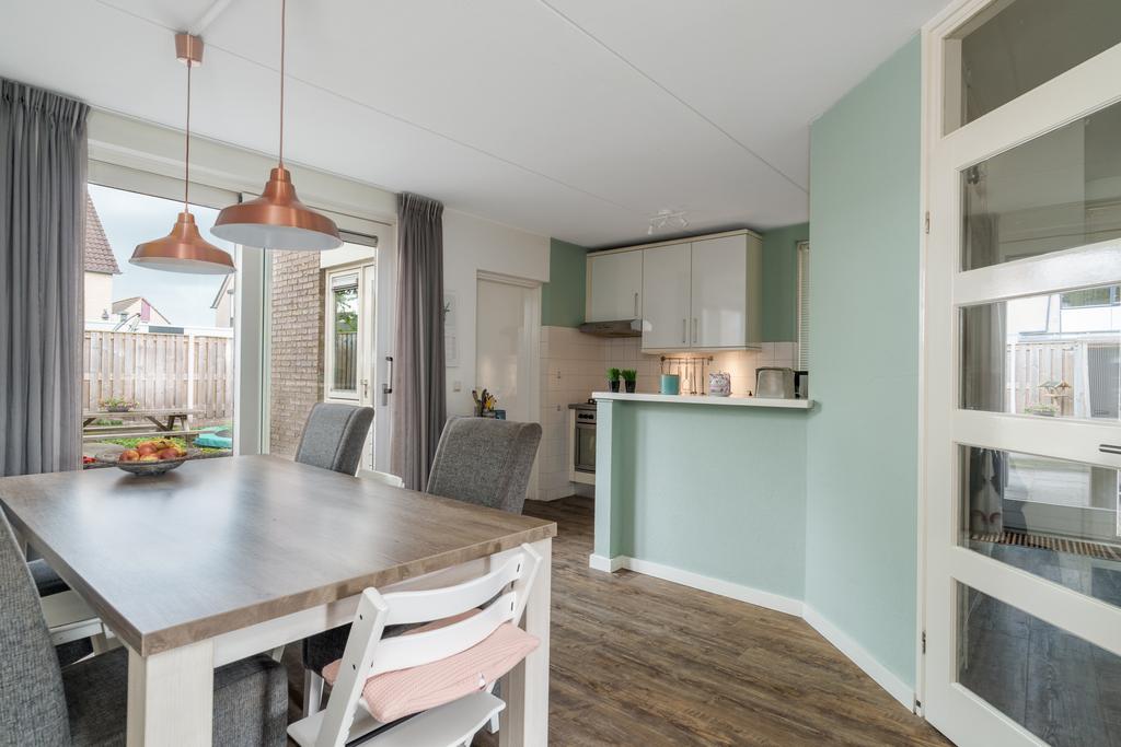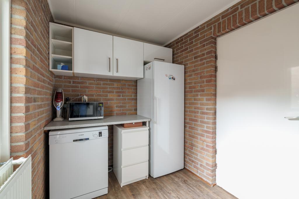 Begane grond: hal/entree, toilet met fontein, meterkast, L-vorige woonkamer met pvc-vloer en schuifpui naar terras/tuin, open keuken met keukenblok in hoekopstelling v.v. gaskookplaat, oven en wasemkap, bijkeuken/achterentree met pvc-vloer en wasmachineaansluiting, binnendoor naar garage/berging.