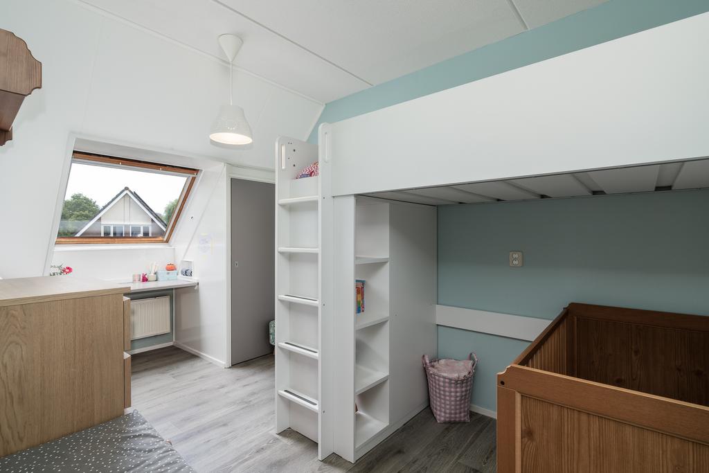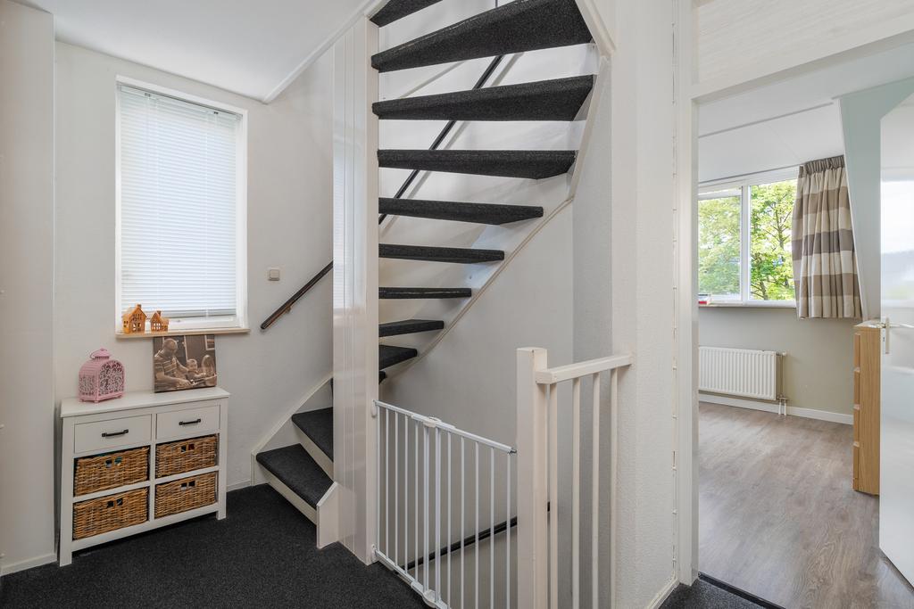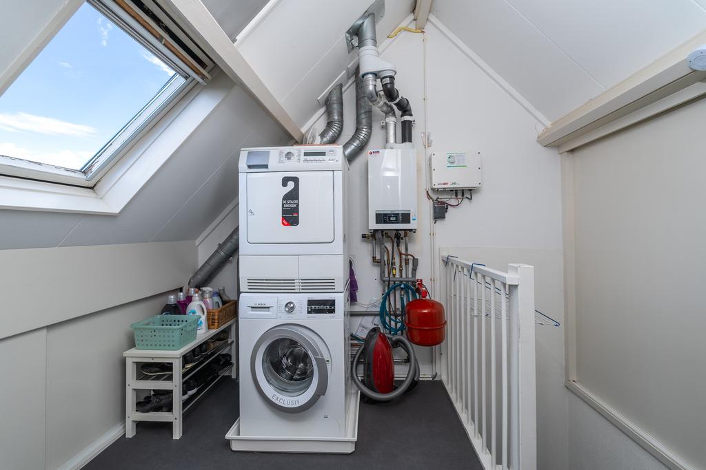 Tweede verdieping: vaste trap naar overloop met wasgedeelte v.v. een wasmachineaansluiting, cv-installatie, omvormer zonnepanelen, opbergruimte met schuifdeur en knieschotten, 4e slaapkamer v.v. pvc-vloer en knieschotten.
